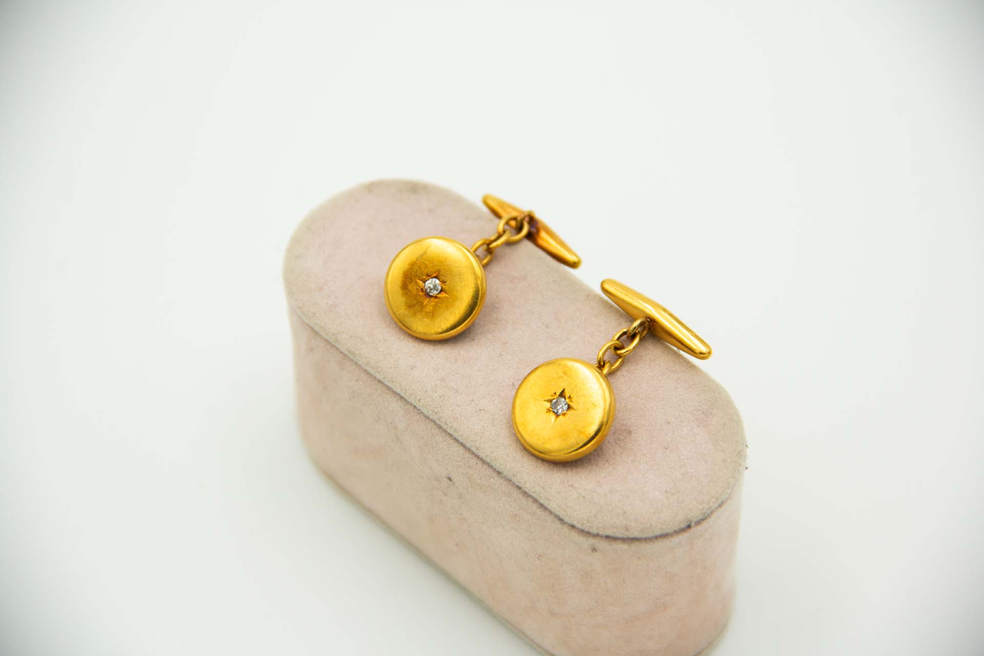 • Descrição: Par de botões de punho circulares em ouro amarelo e com dois diamantes em talhe brilhante antigo.