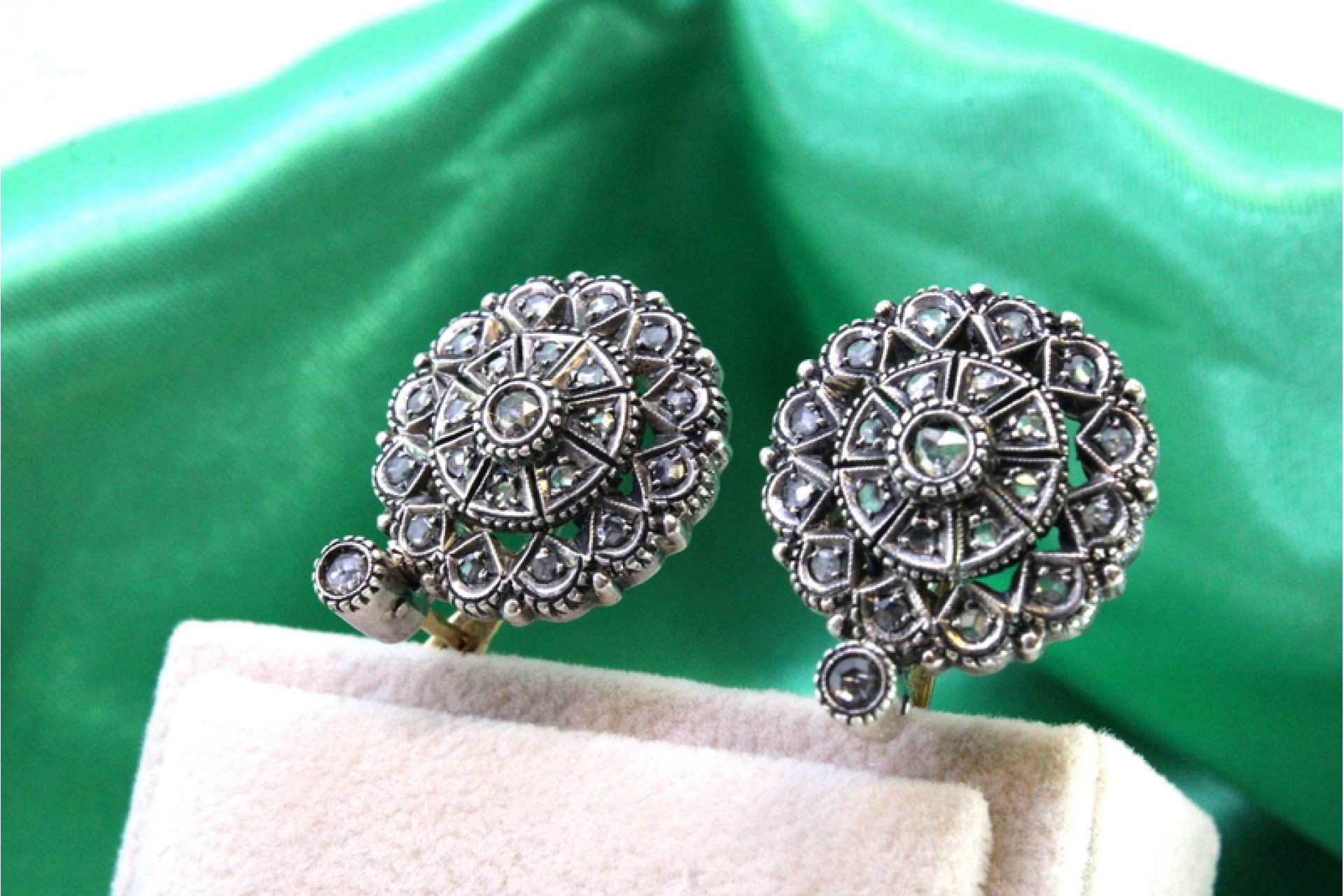 Par de brincos em ouro e prata de forma circular com lascas de diamante.