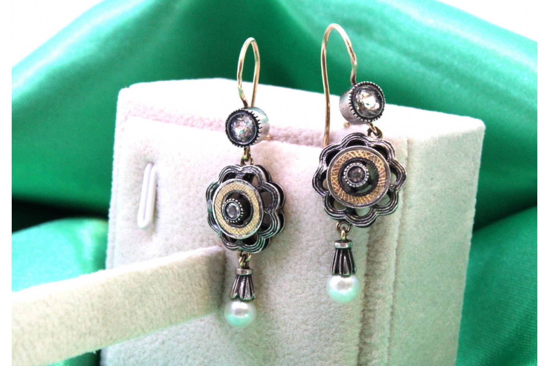 Par de brincos em ouro e prata com zircónia e pingentes com pérolas de cultura.
