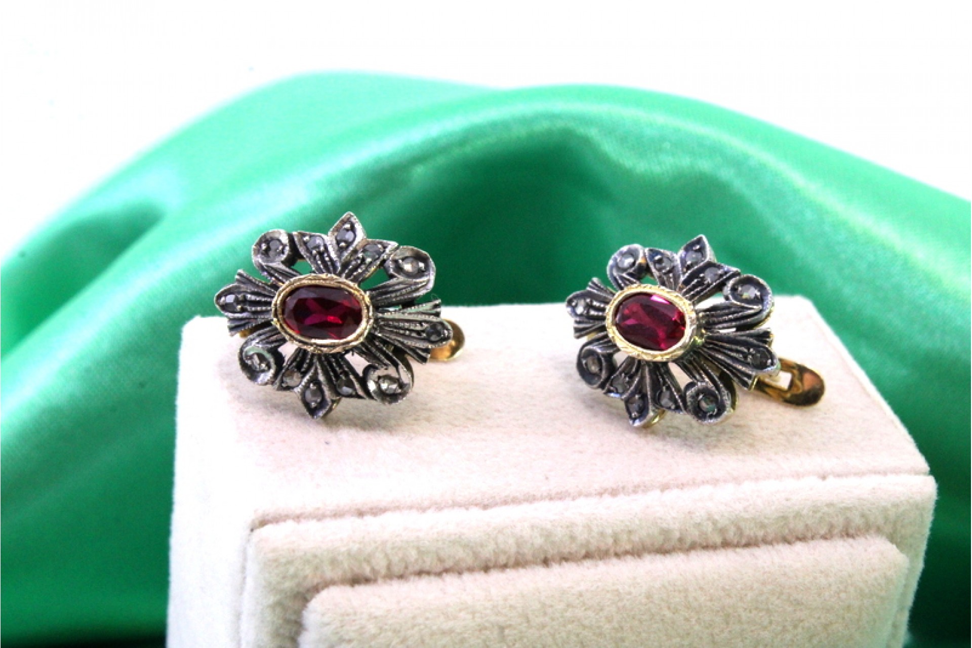 • Descrição: Par de brincos em ouro e prata com lascas de diamantes e rubis sintéticos.