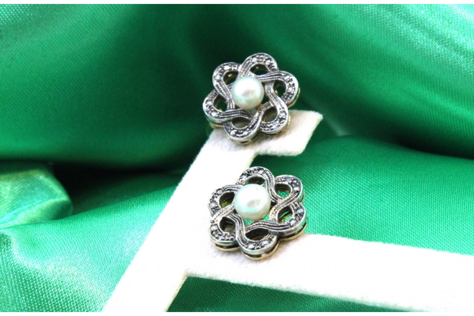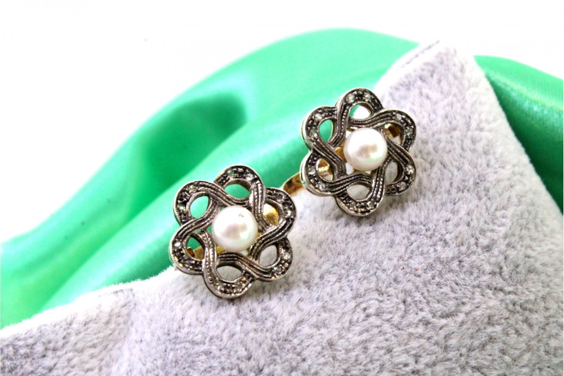 • Descrição: Par de brincos em ouro e prata em forma de flor com lascas de diamantes e perolas de cultura.