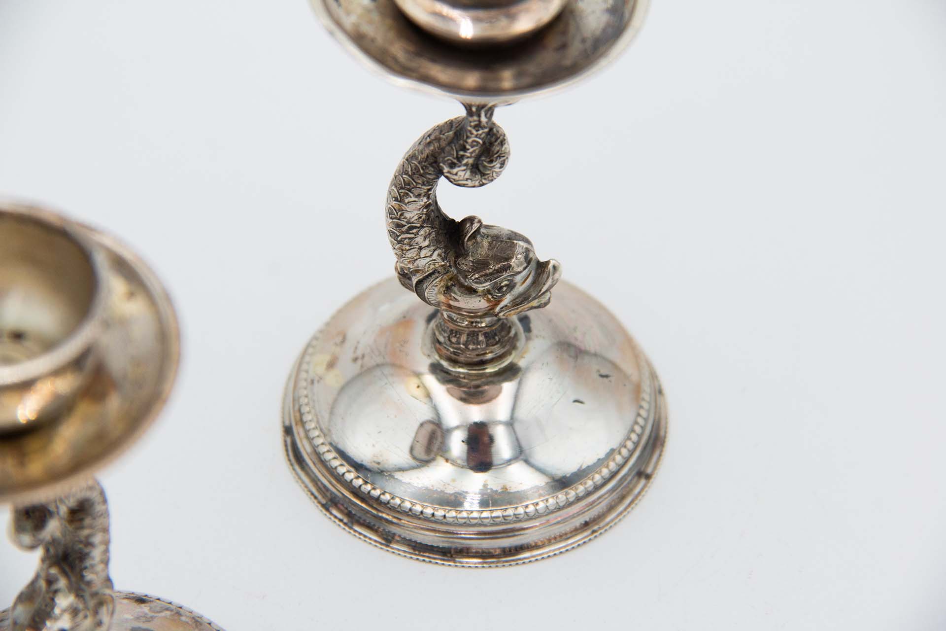 • Descrição: Par de castiçais baixos de prata em forma de peixe com bases em triplo friso.