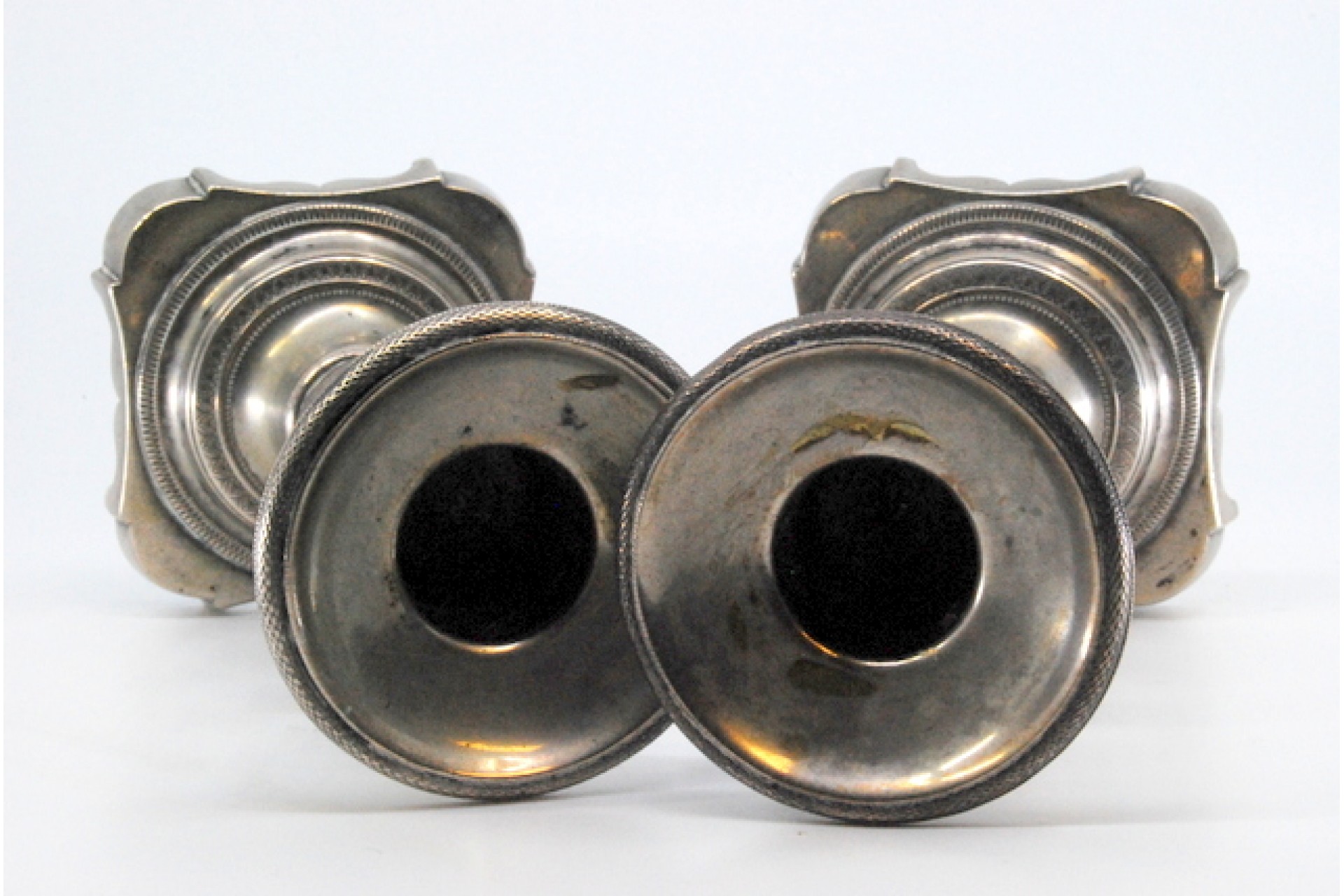 • Descrição: Castiçais baixos em prata com fustes torneados e frisos nas bases recortadas.