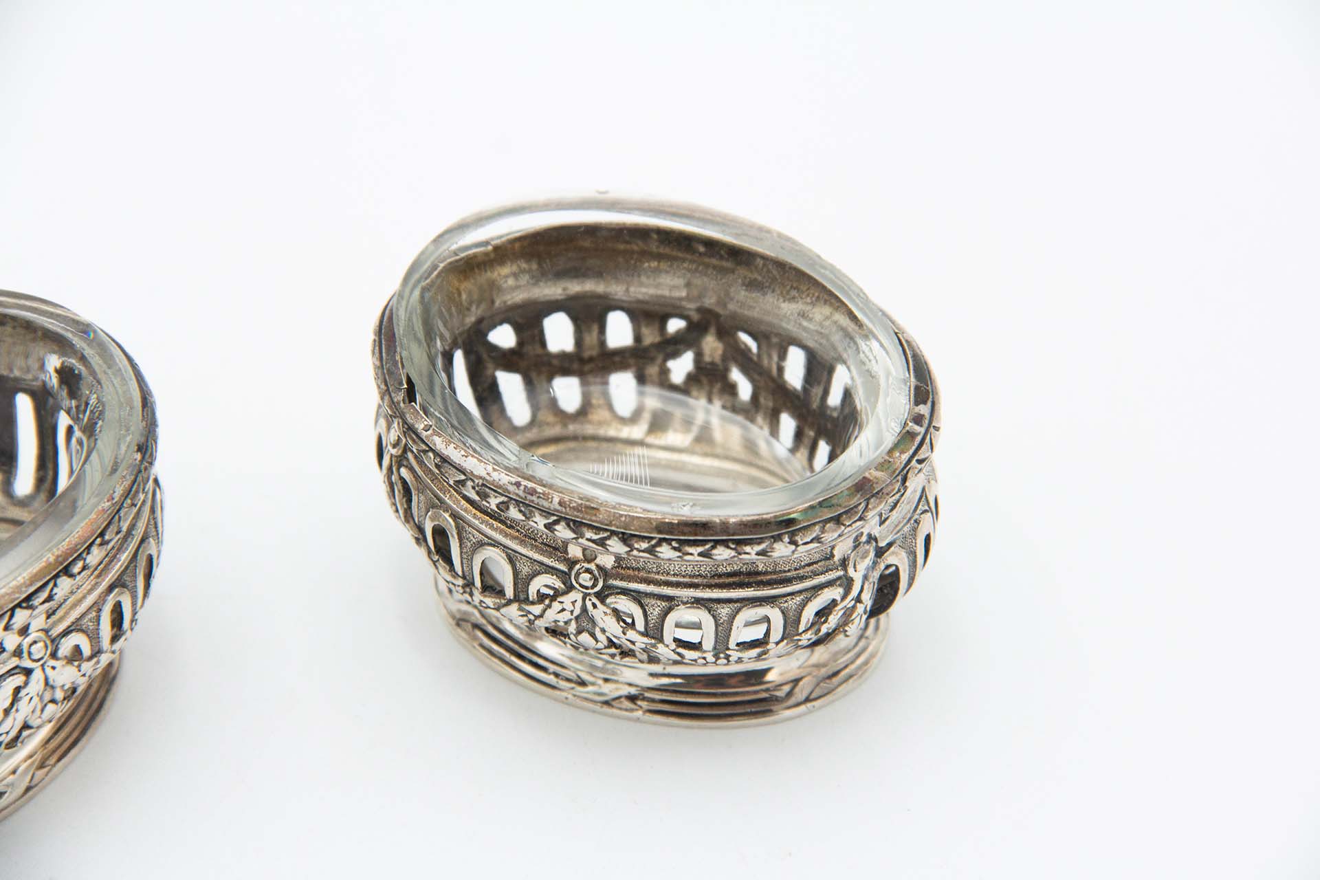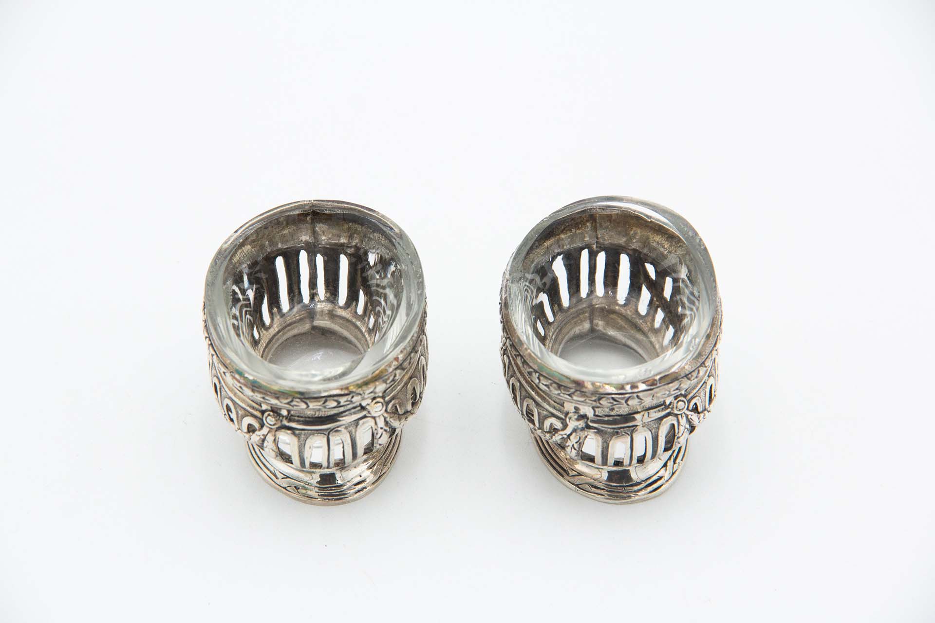 • Descrição: Par de saleiros em prata recortada e relevados com grinaldas e almas de vidro.