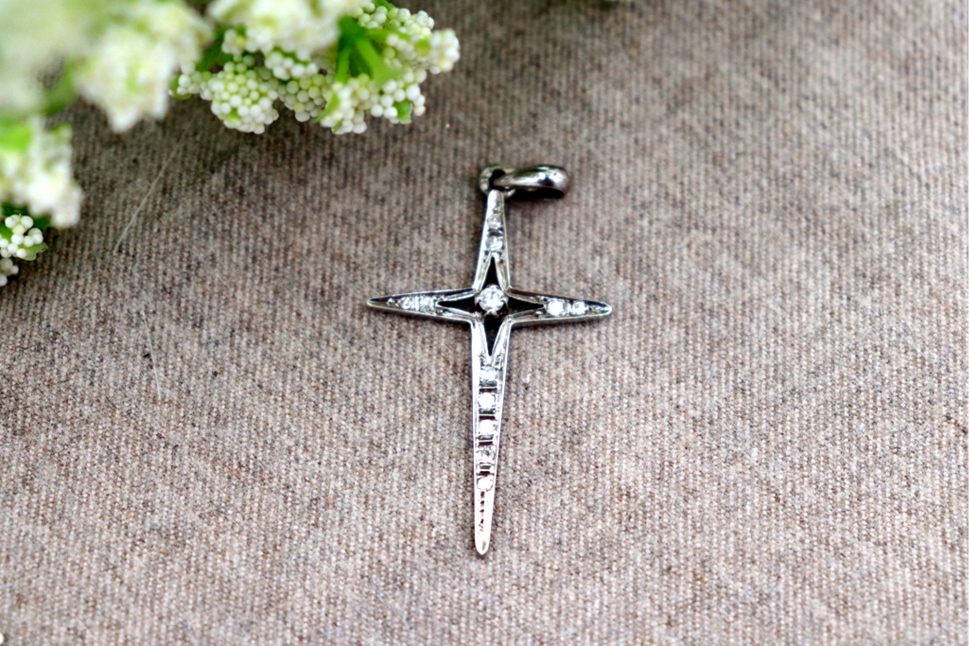 • Descrição: Pendente em ouro branco com diamantes (12) em talhe brilhante em forma de estrela e argola de suspensão.