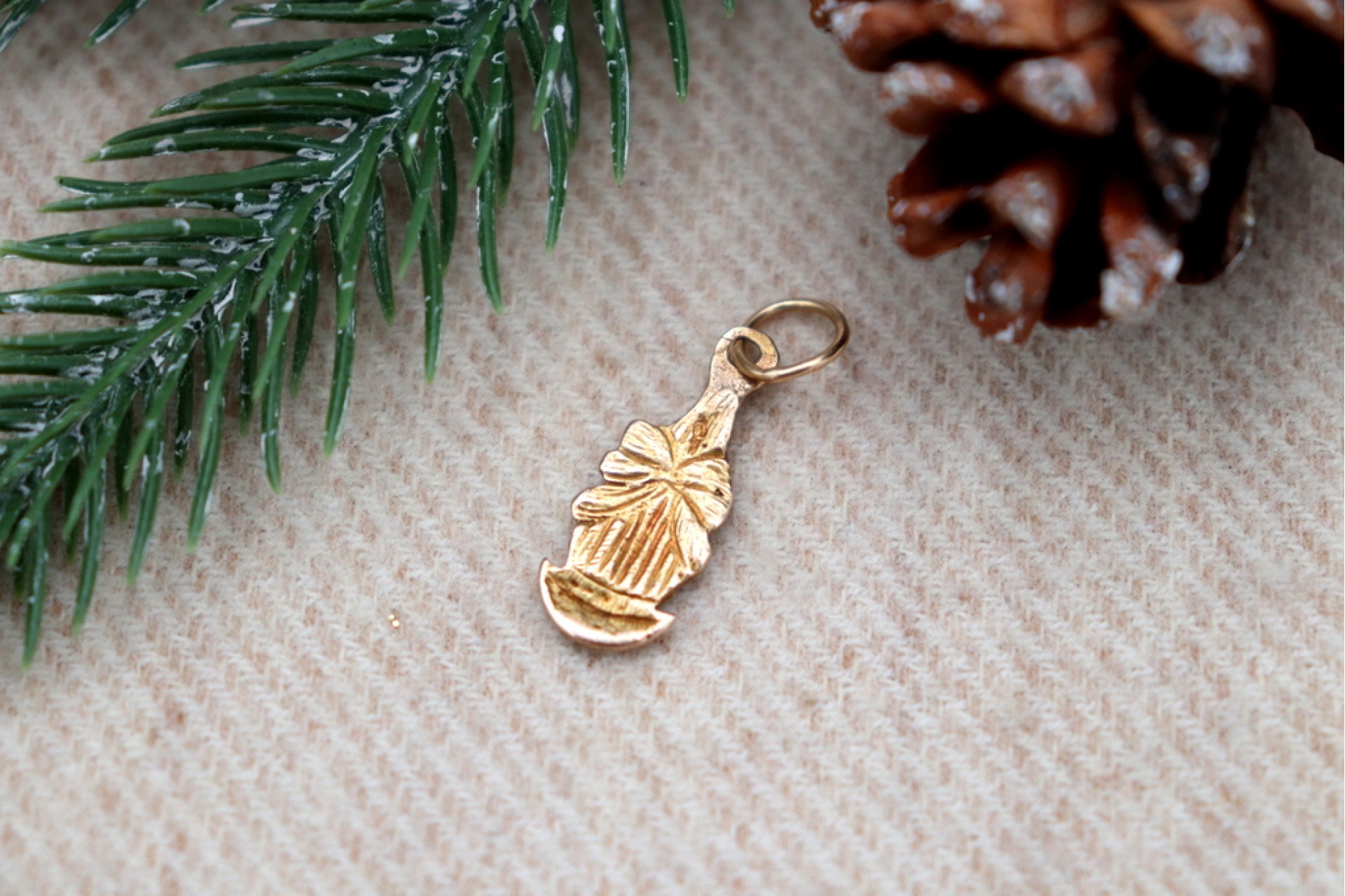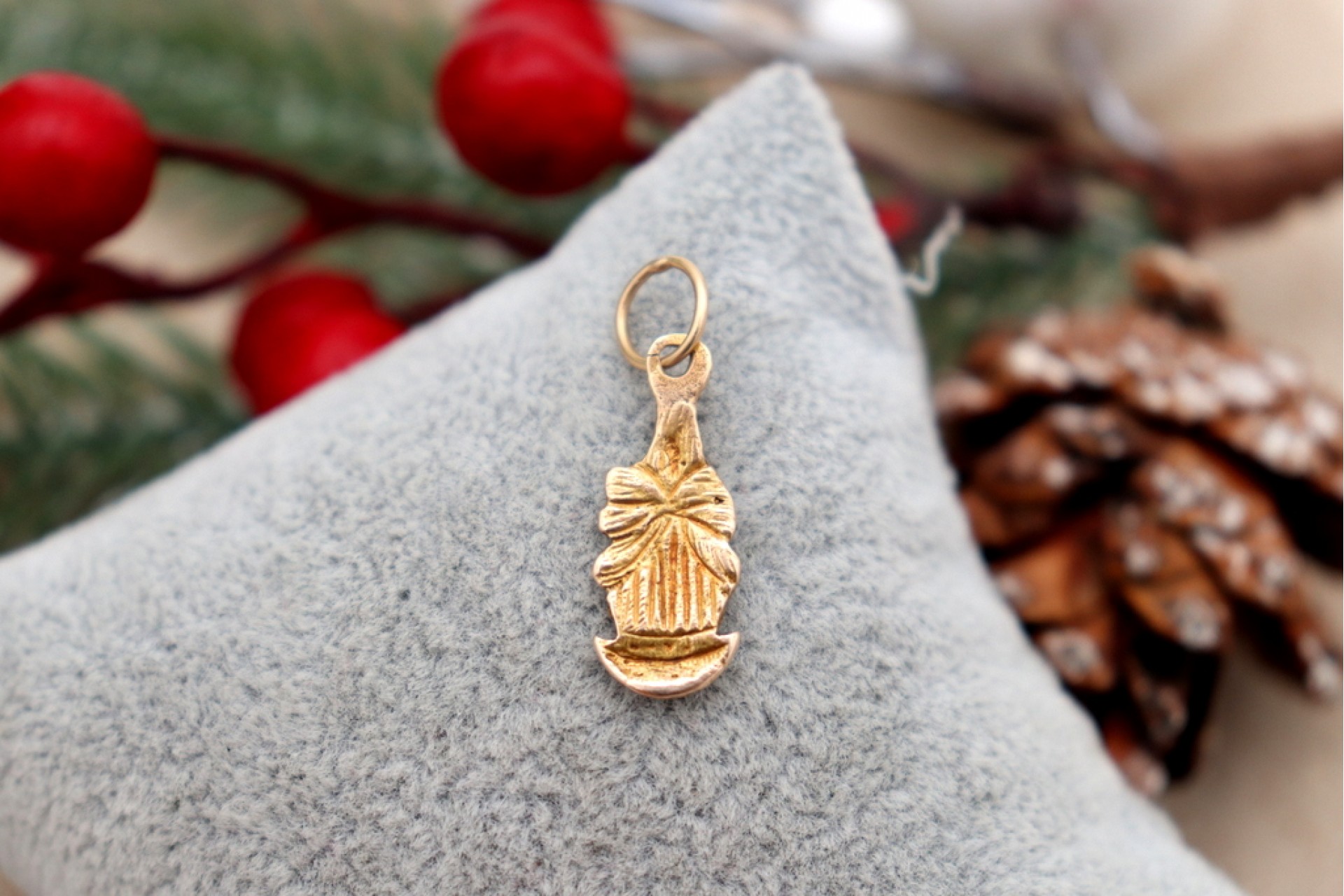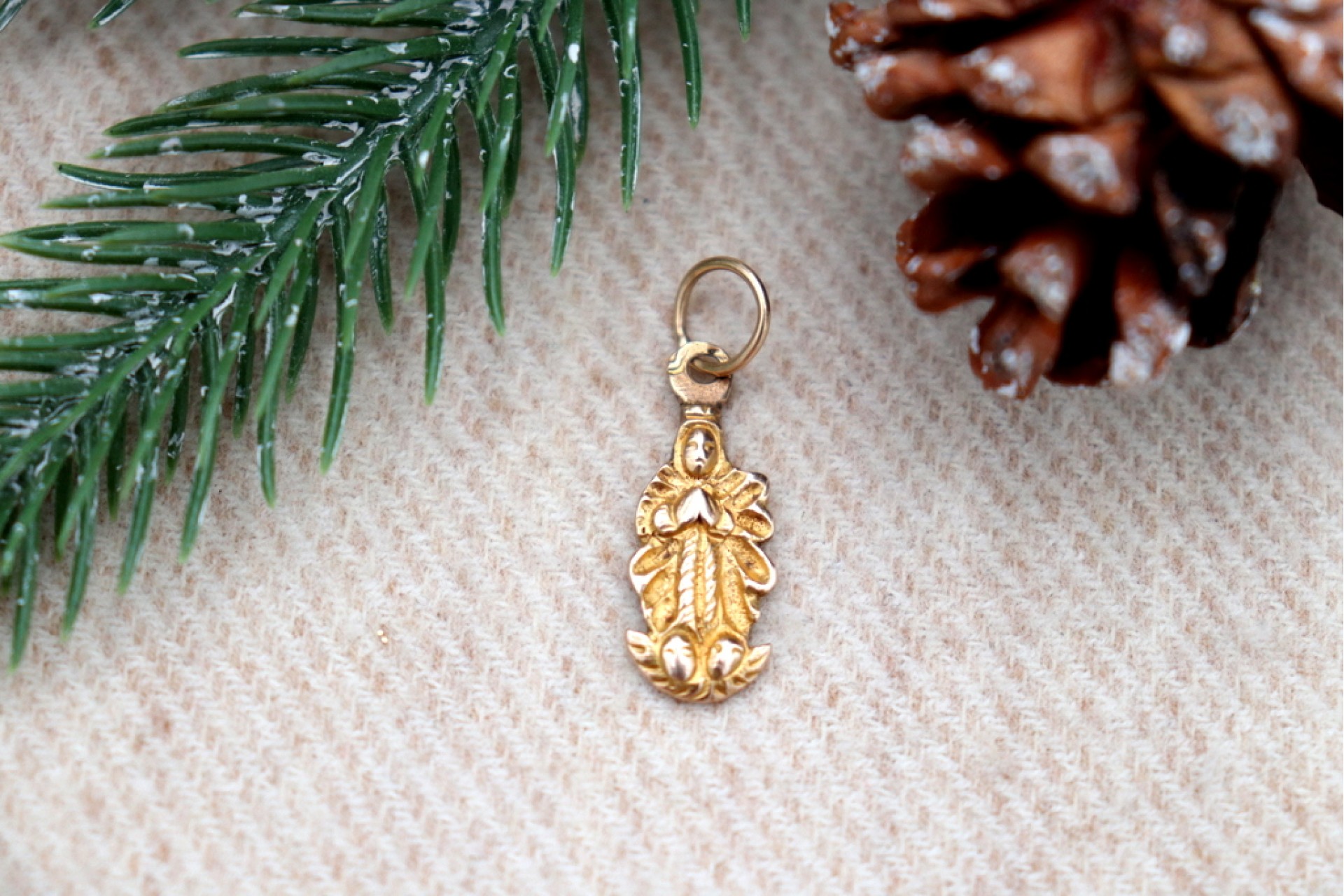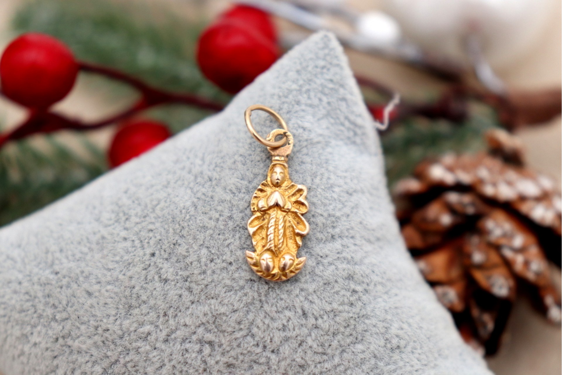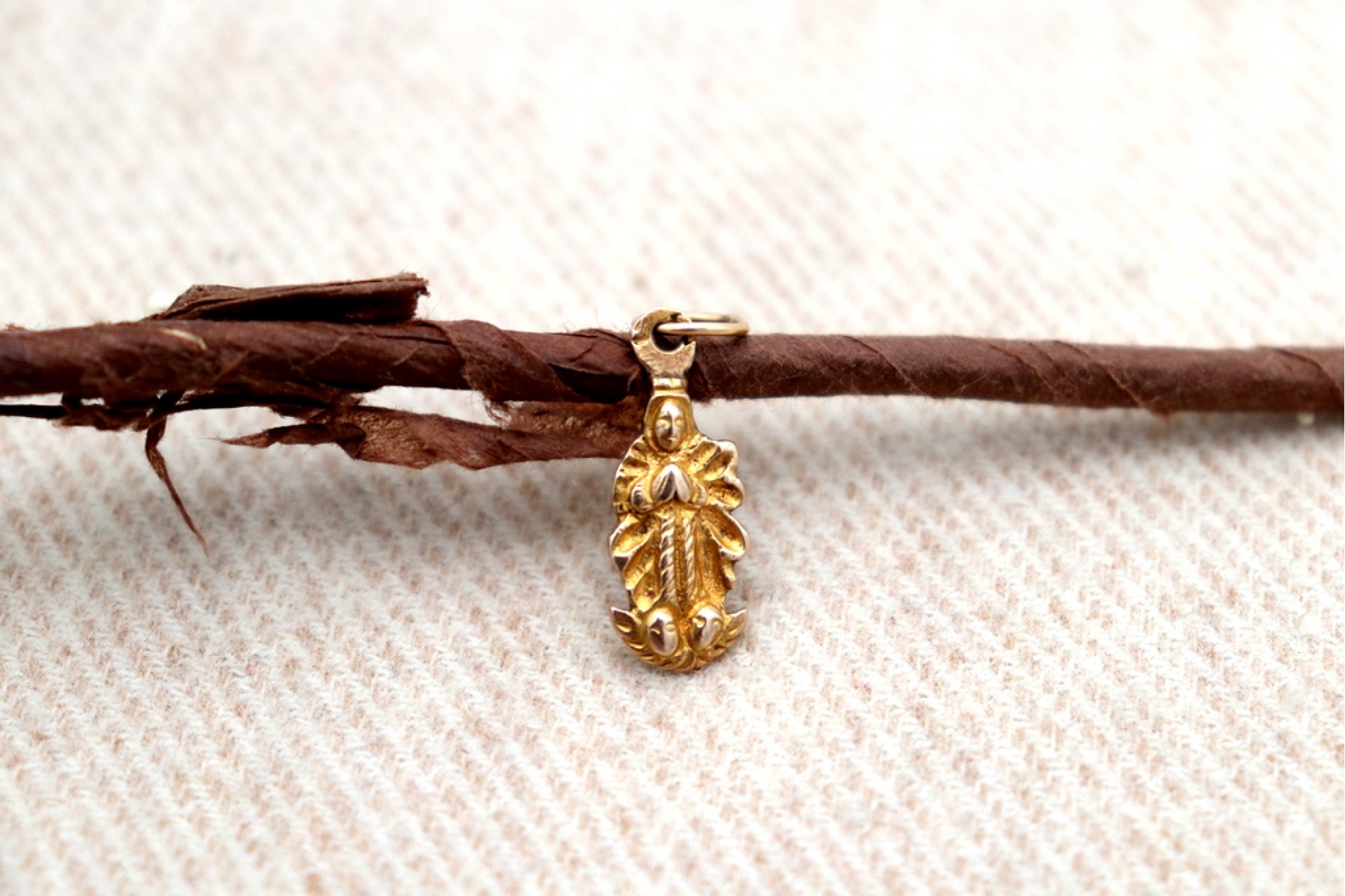 • Descrição: Pendente em ouro com Nossa Senhora da Conceição com as mãos postas, de vulto perfeito relevado e coroa, argola de suspensão.