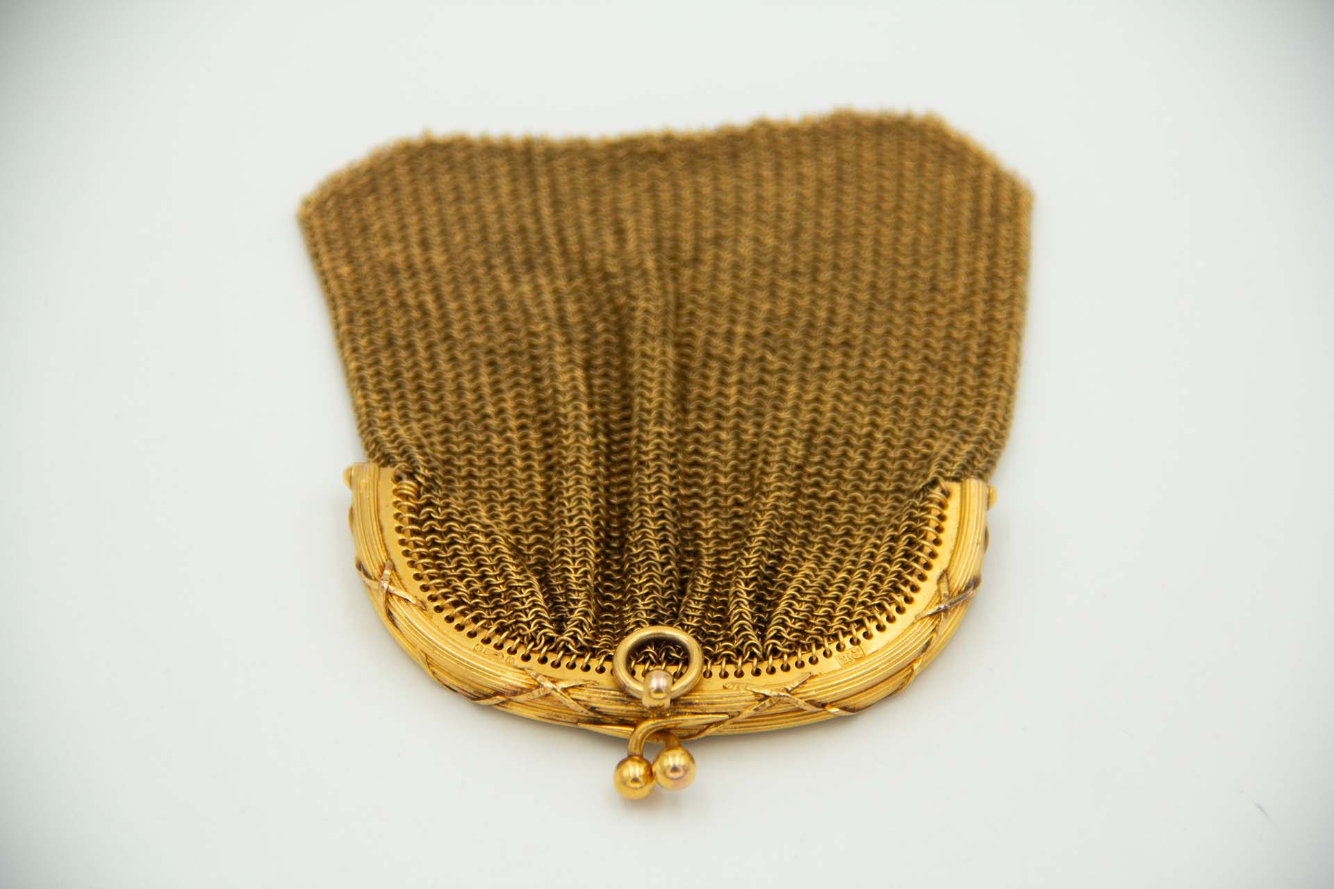 • Descrição: Porta moedas de ouro amarelo com malha dupla, arco relevado e argola de suspensão.