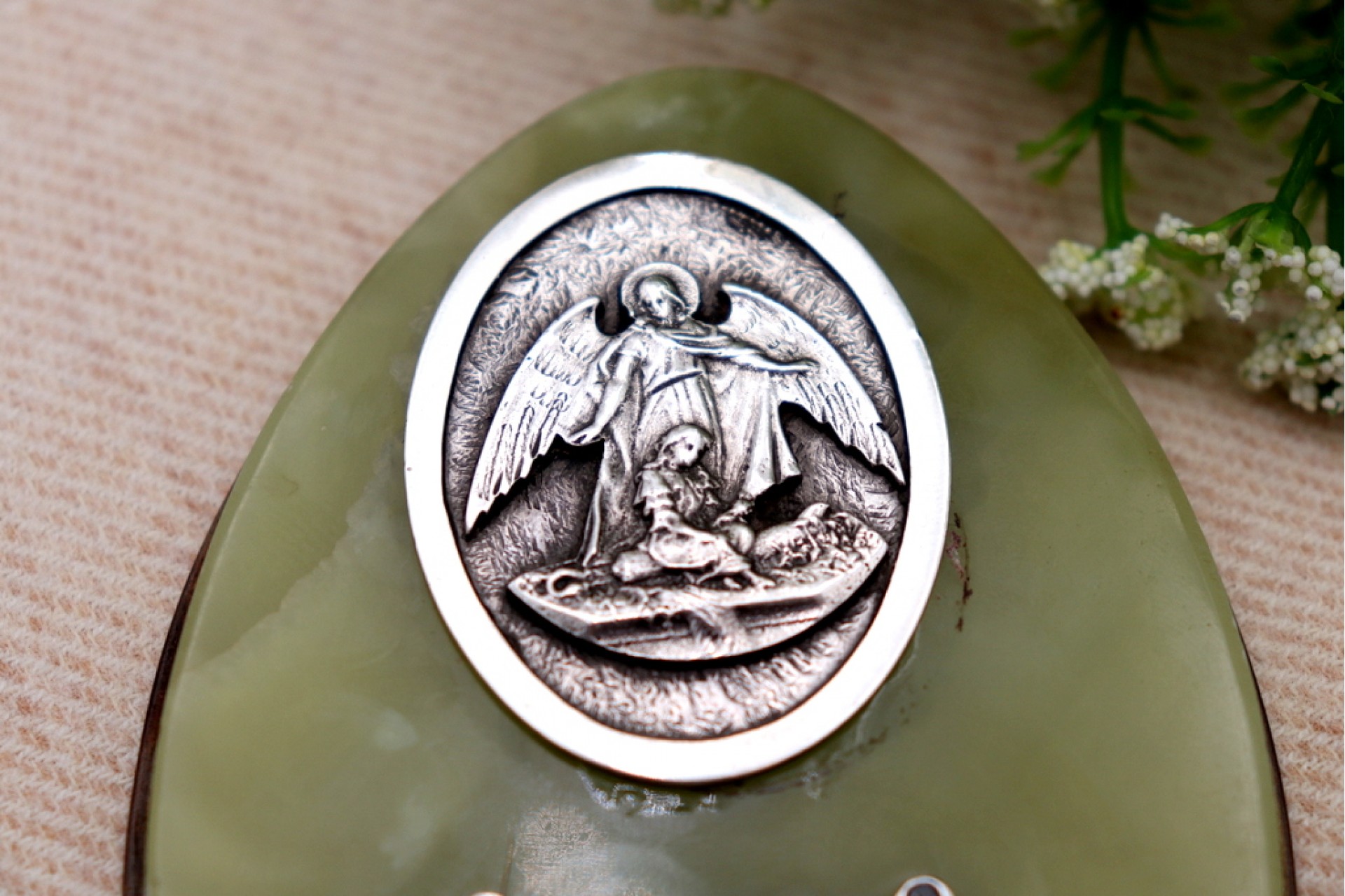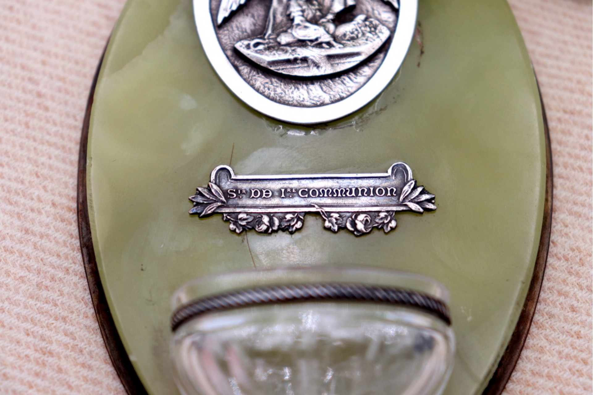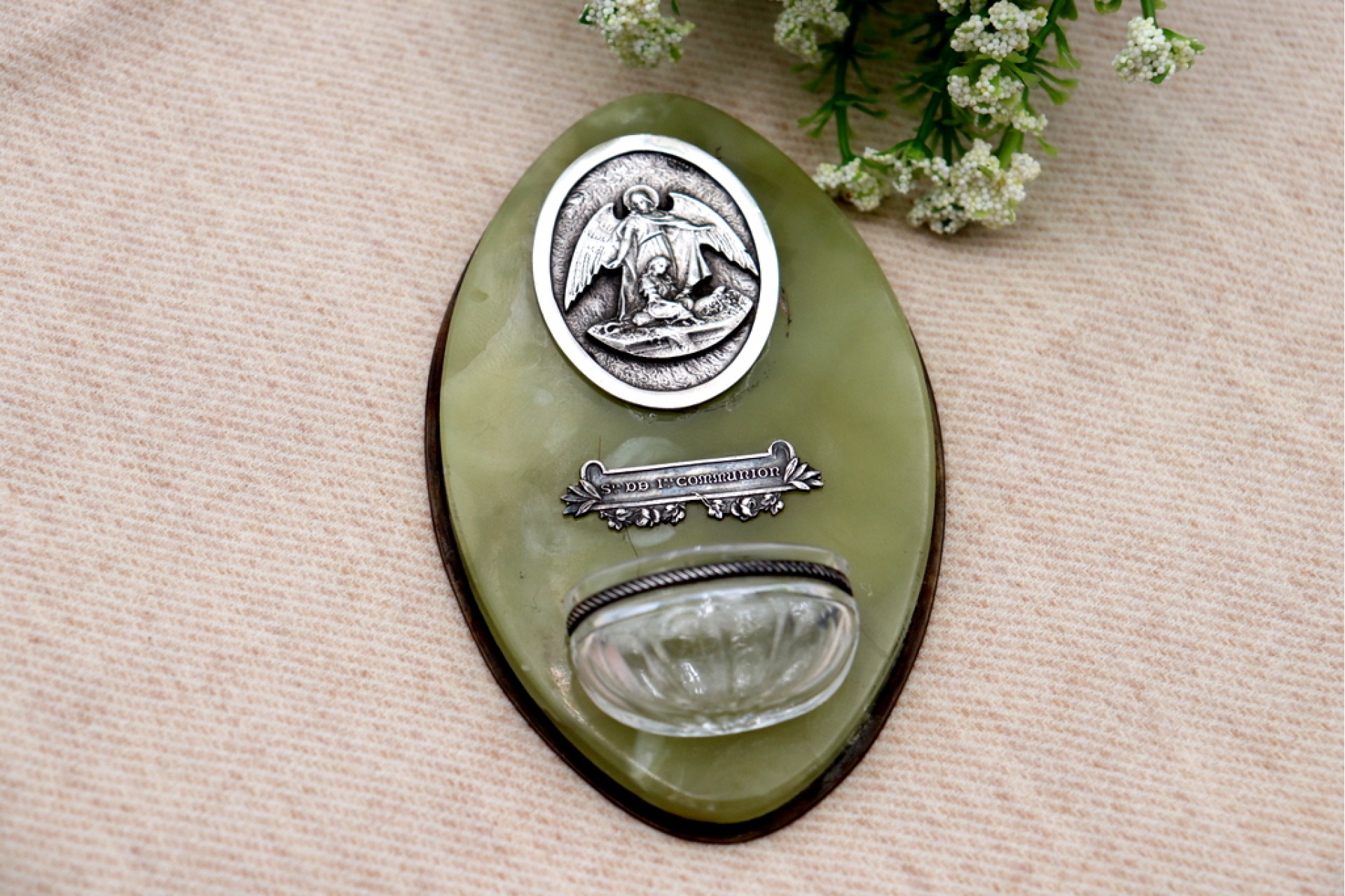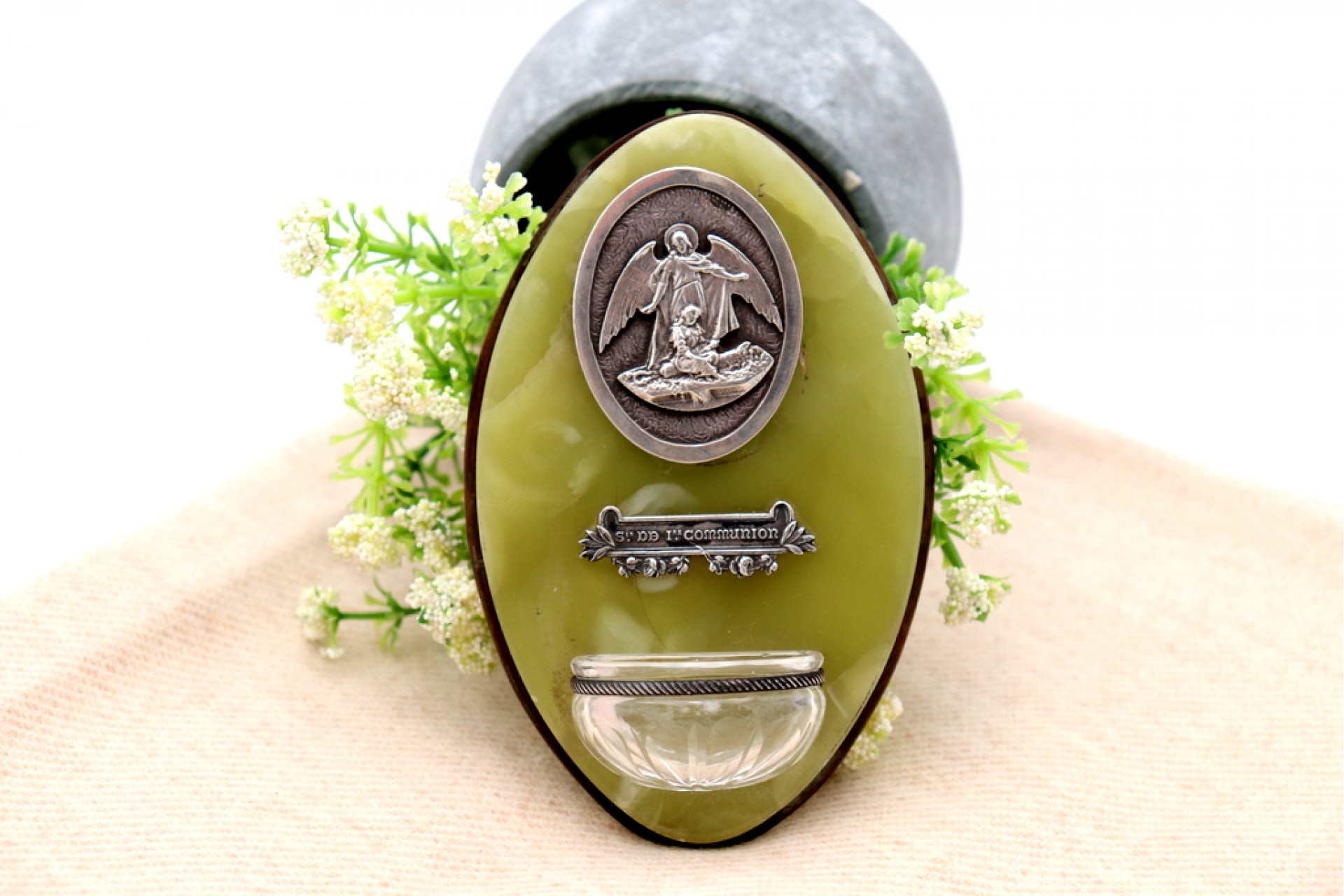 Pia de água benta com base em mármore e aplicações em prata e vidro