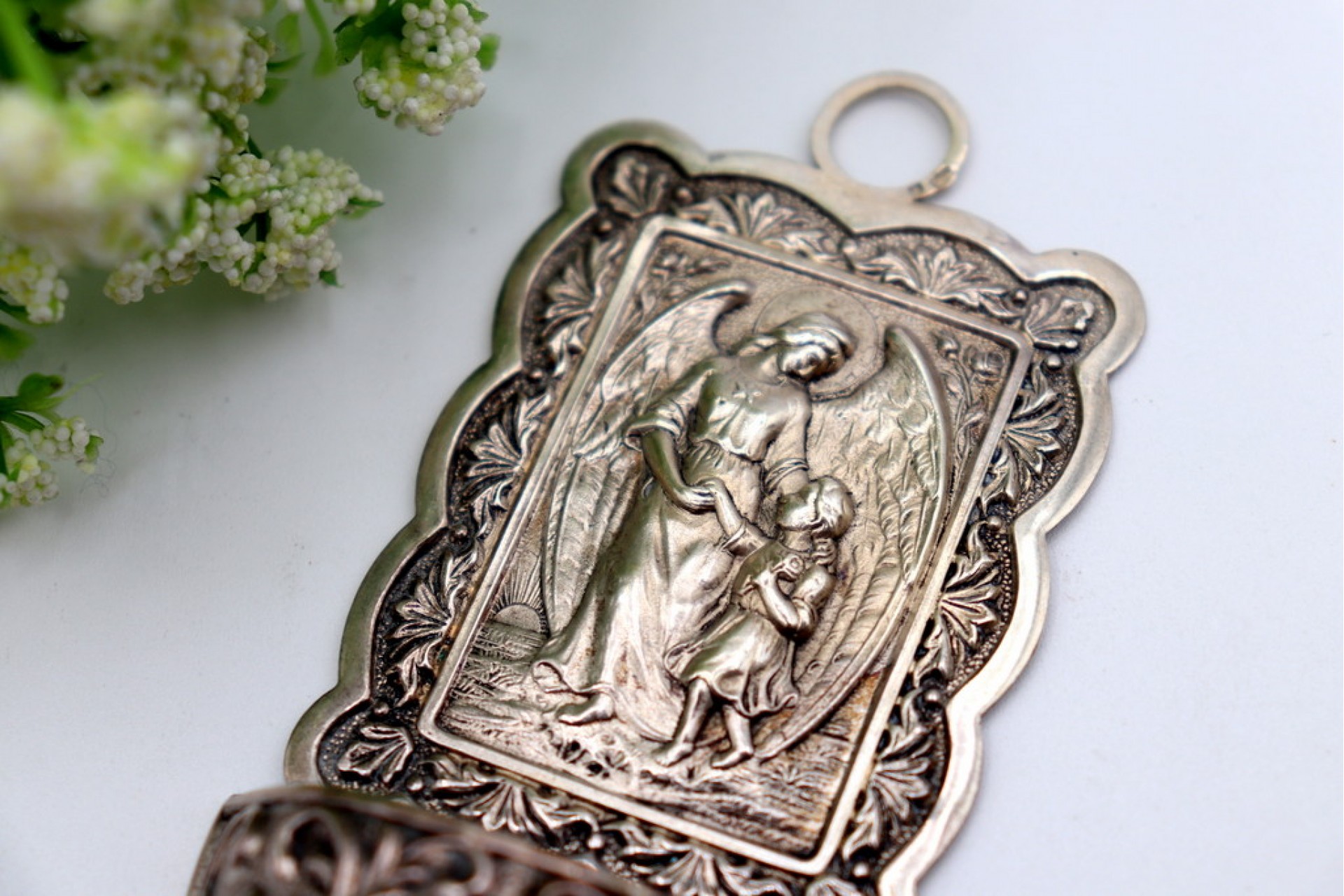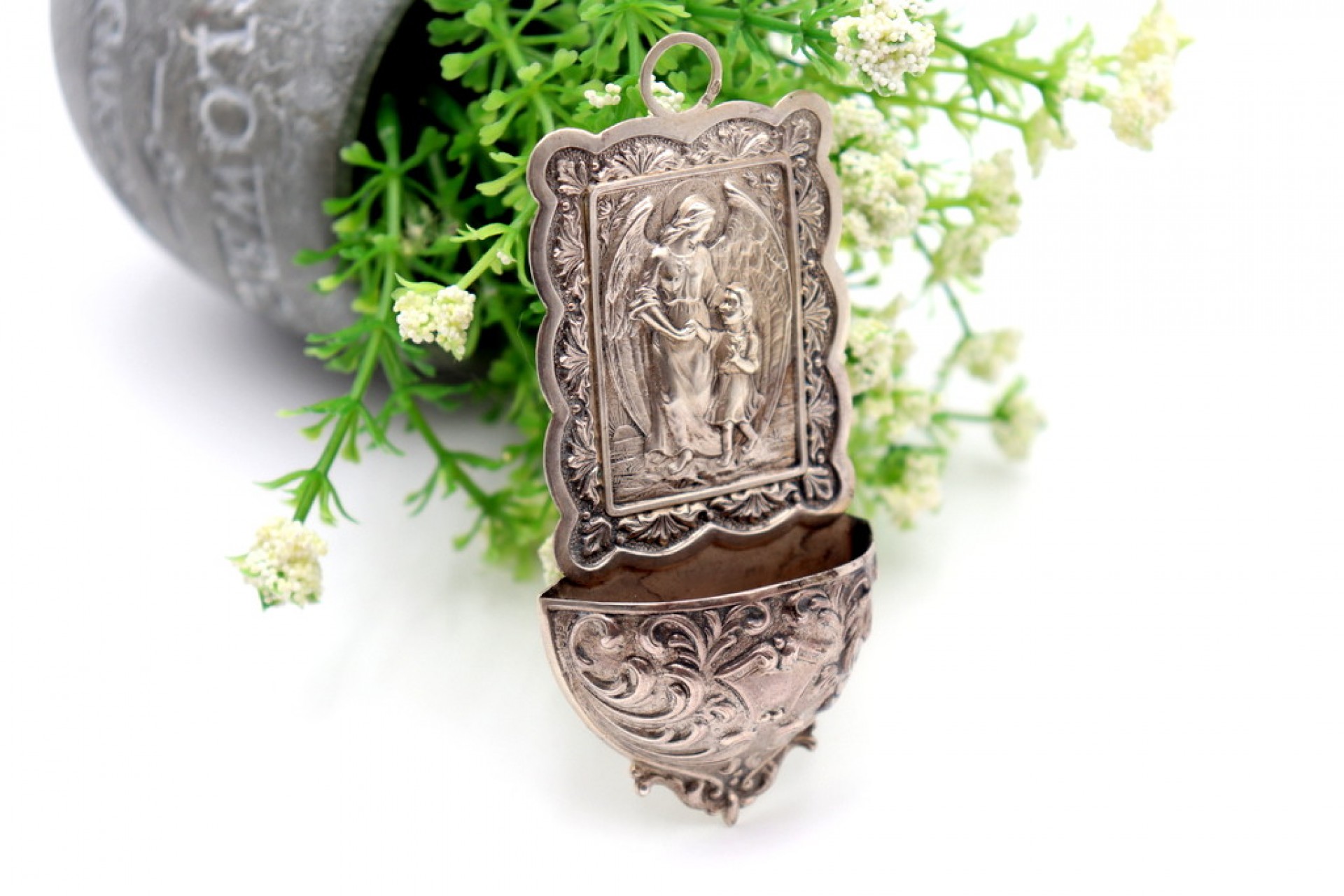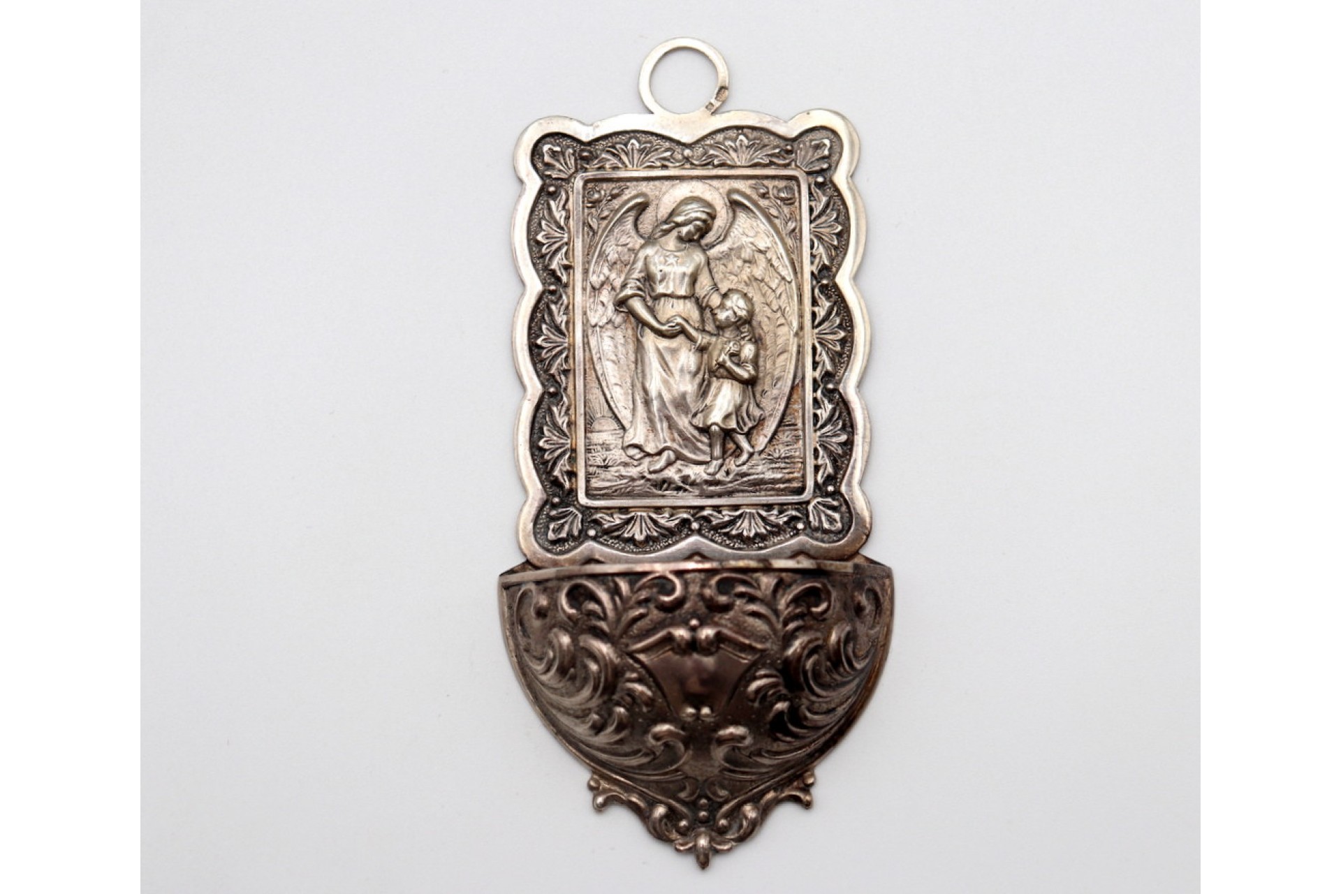 Pia de água benta em prata com relevos cartela para monograma e anjo da Guarda
