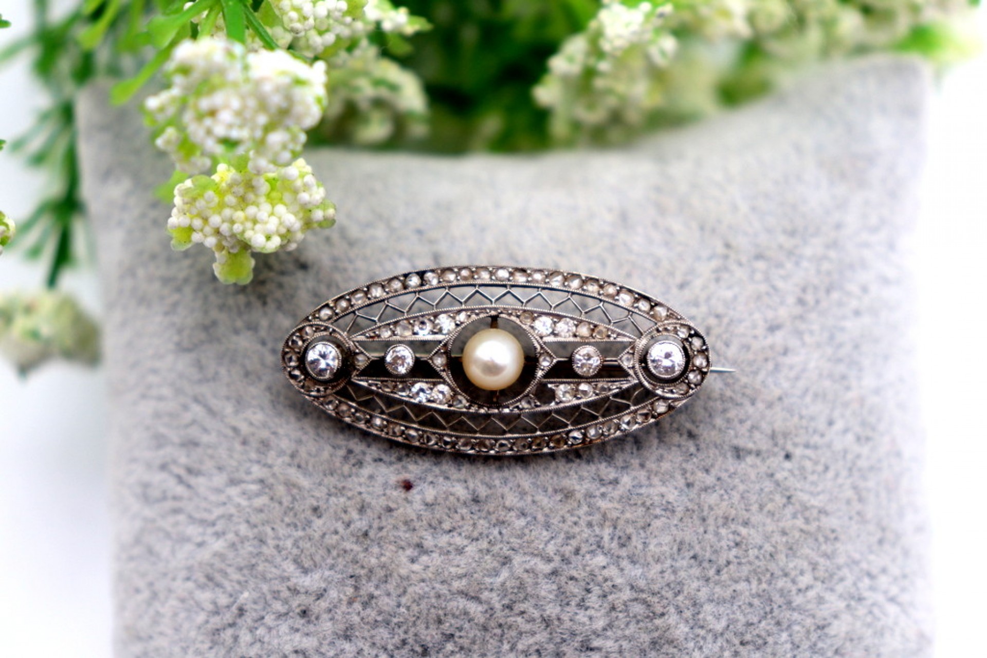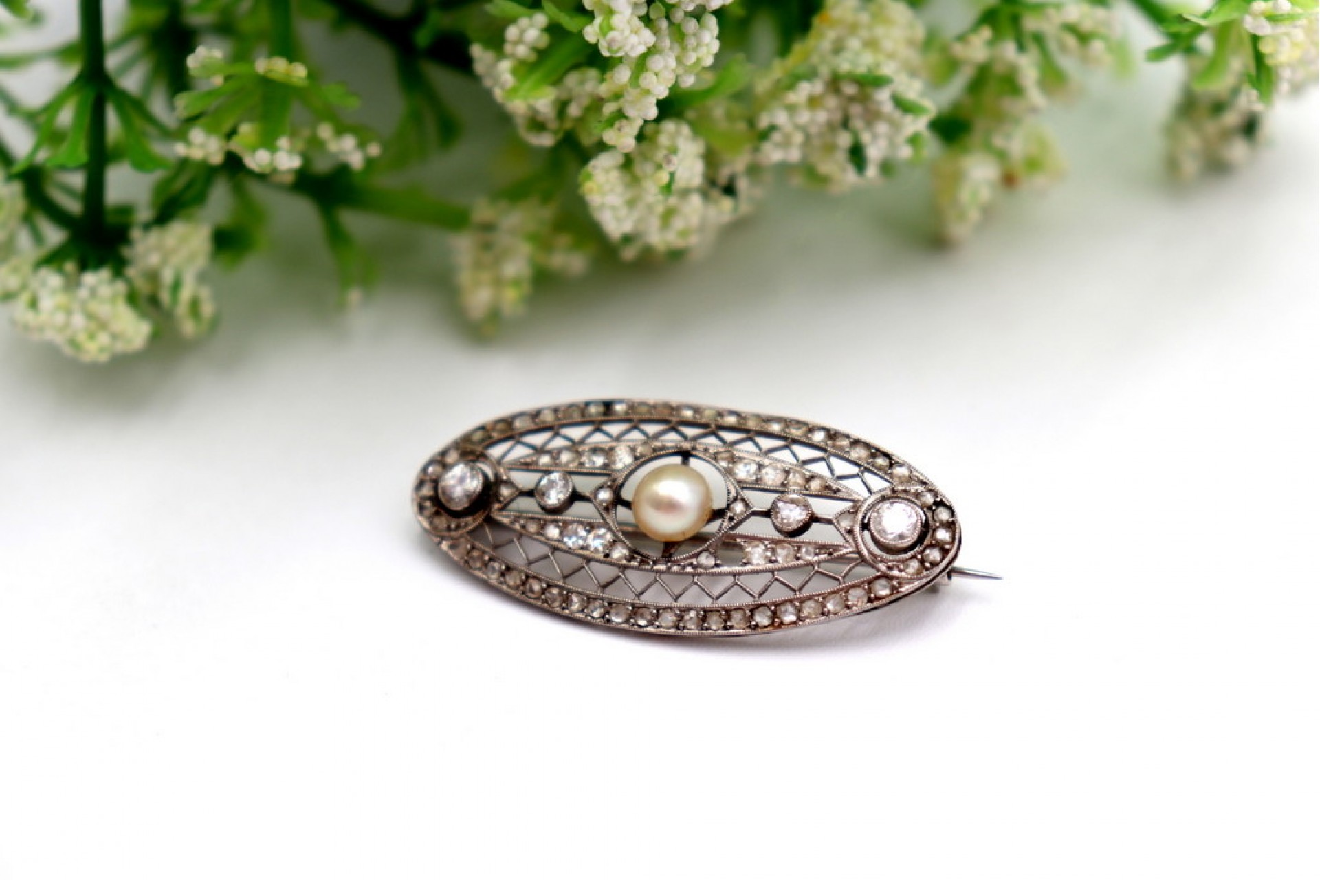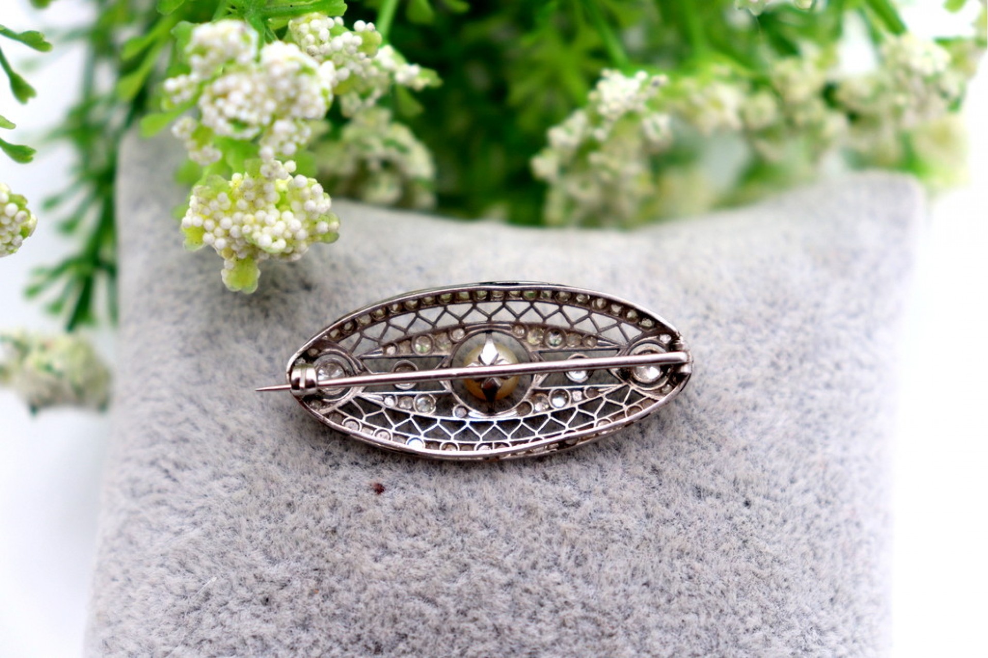 • Descrição:  Alfinete de peito em platina com diamantes (4) em talhe brilhante antigo, pérola, lascas de diamante 8/8 ao estilo Art Decô.
