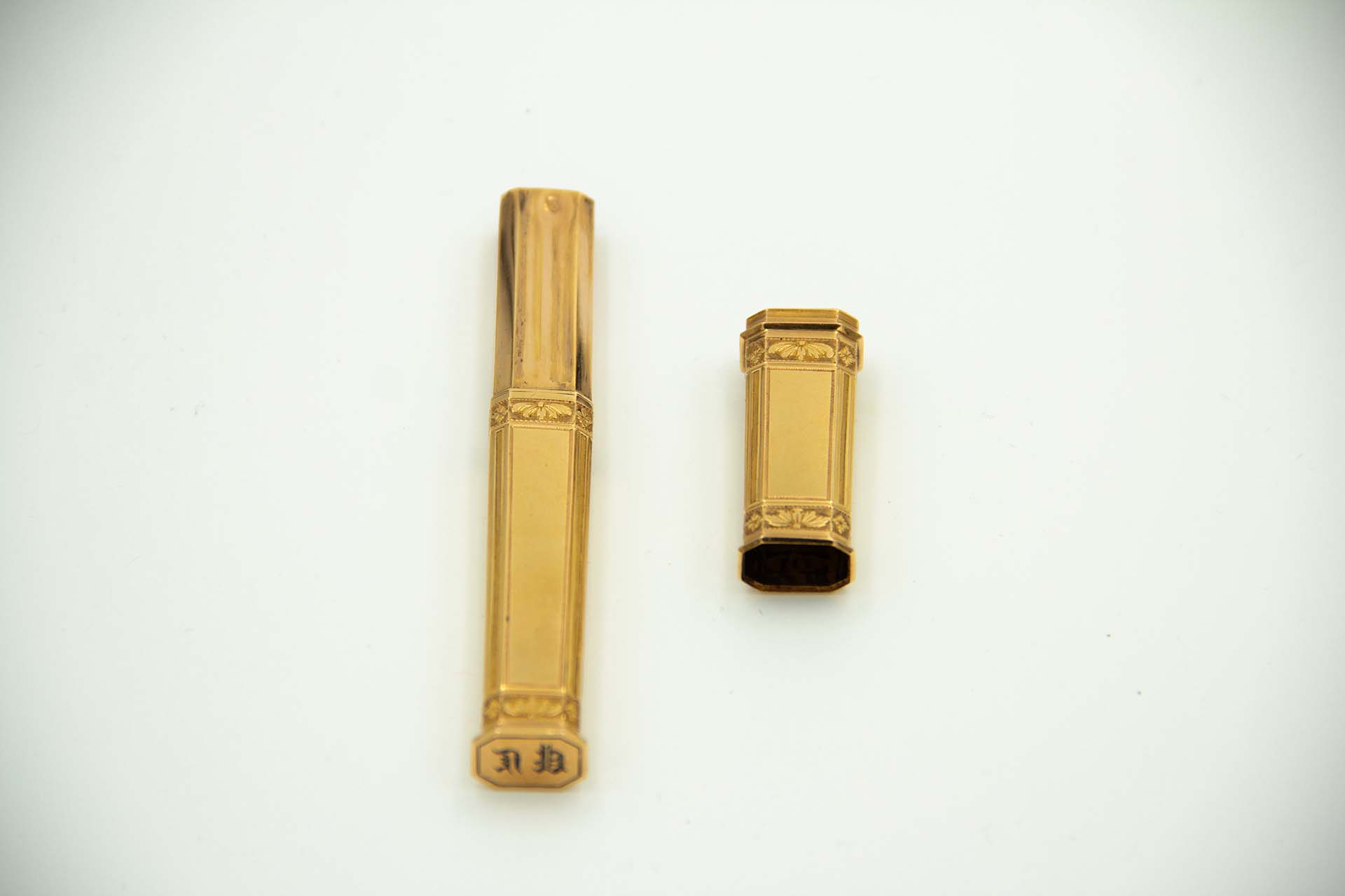 • Descrição: Porta-Lacre em ouro com relevos, decoração guilhochada e preparado para sinete.