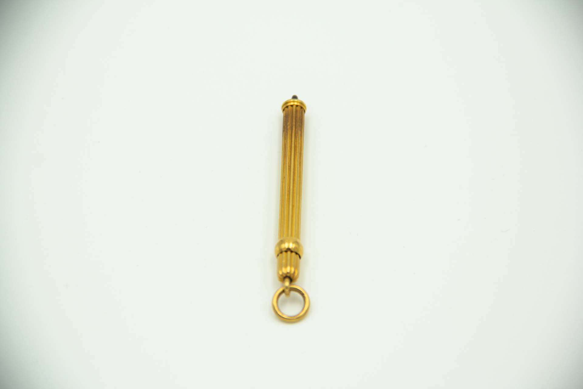 Porta-Lápis de ouro com relevos canelados e argola de suspensão.