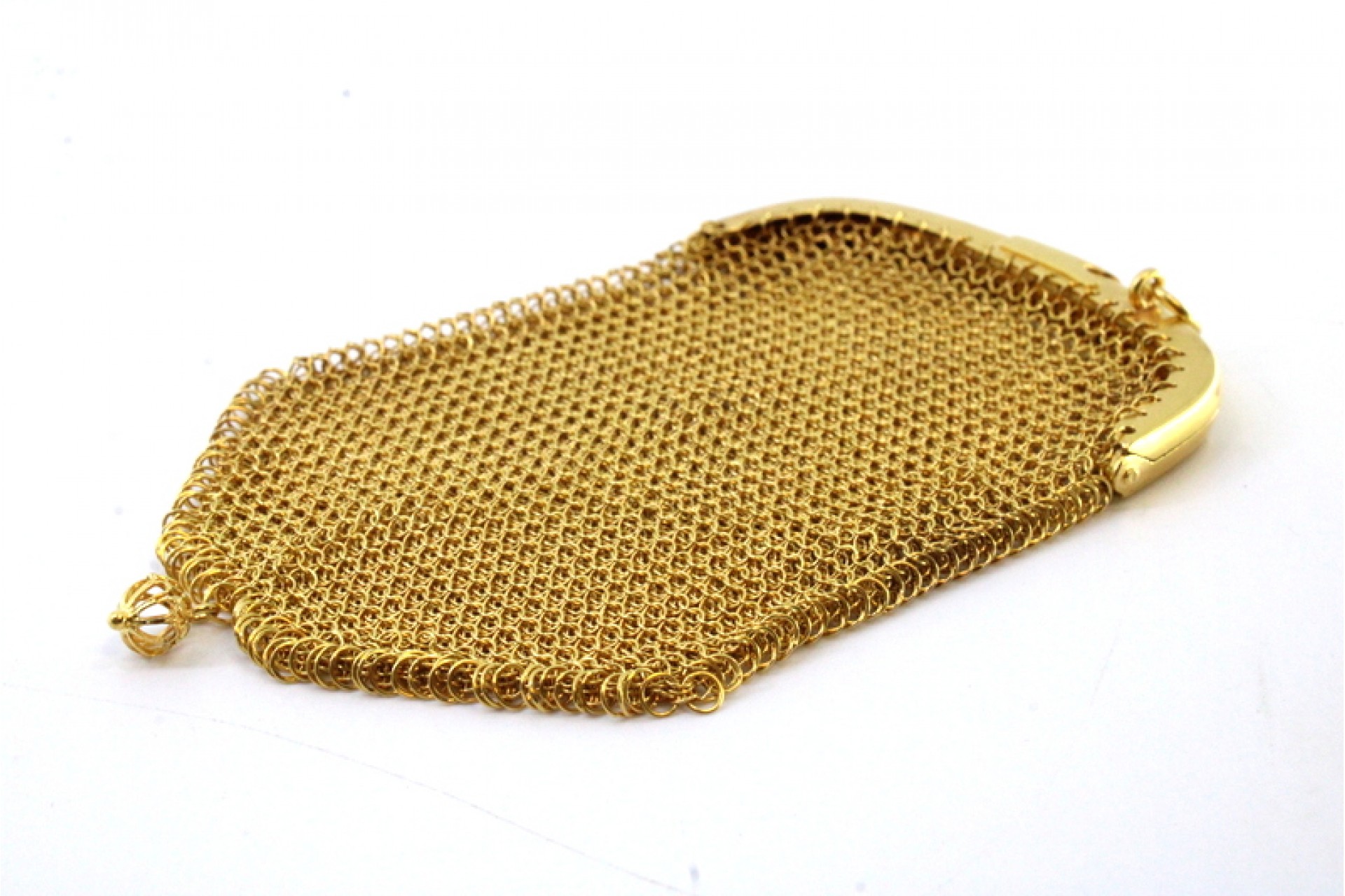 • Descrição: Porta moedas em malha de ouro com arco liso, com fecho,  pingente em forma de bola e duas divisórias no interior.