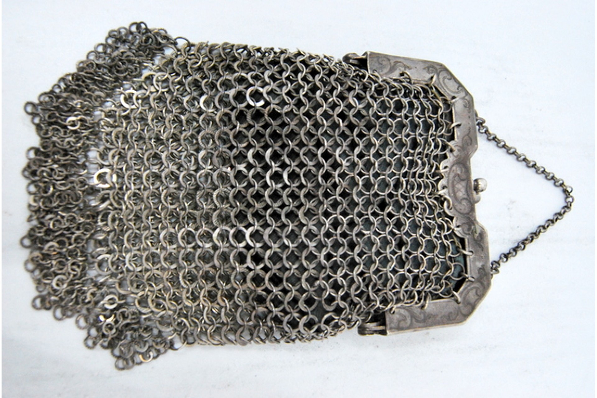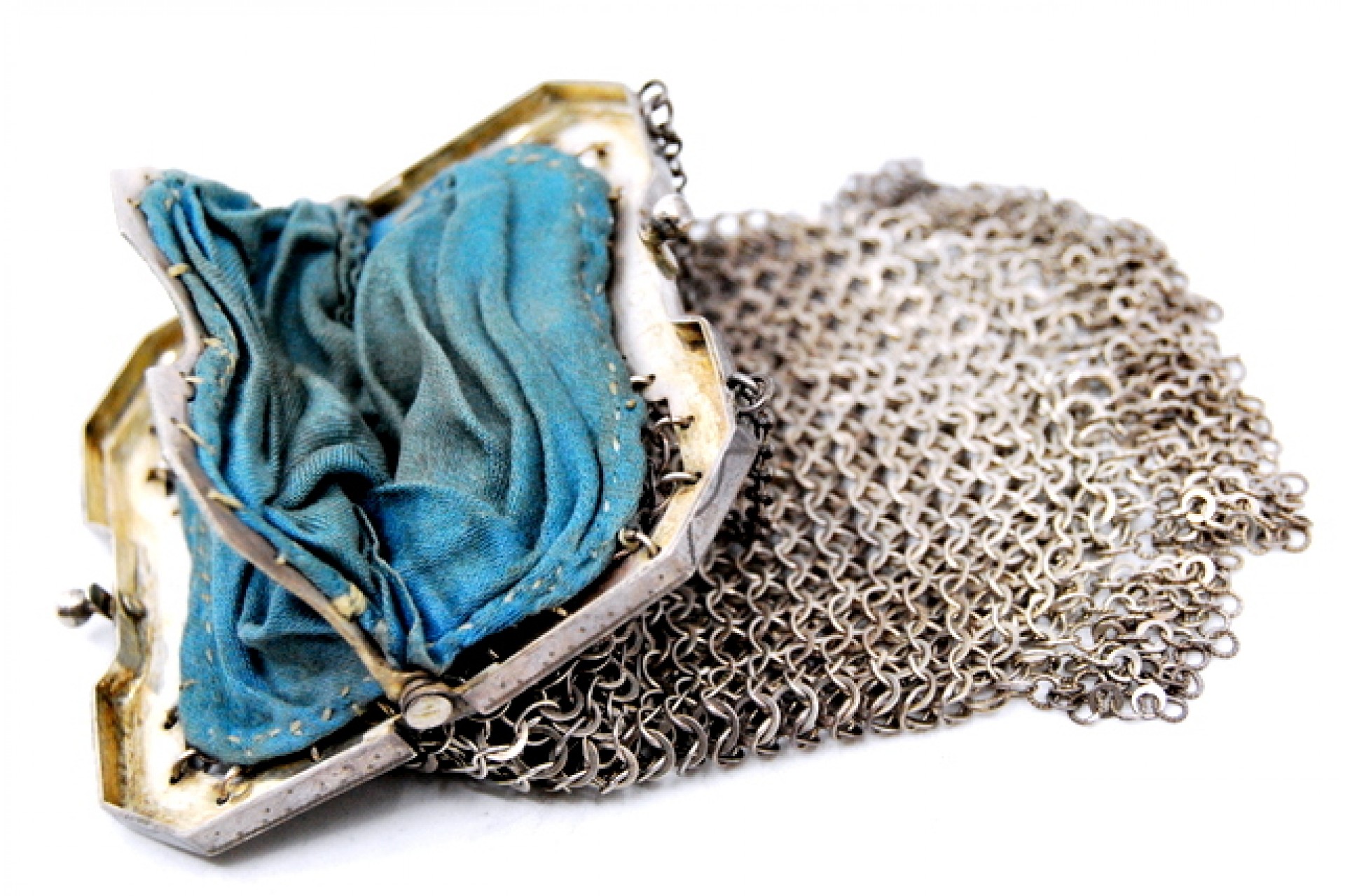 • Descrição: Porta moedas em malha de prata com interior forrado a tecido azul.