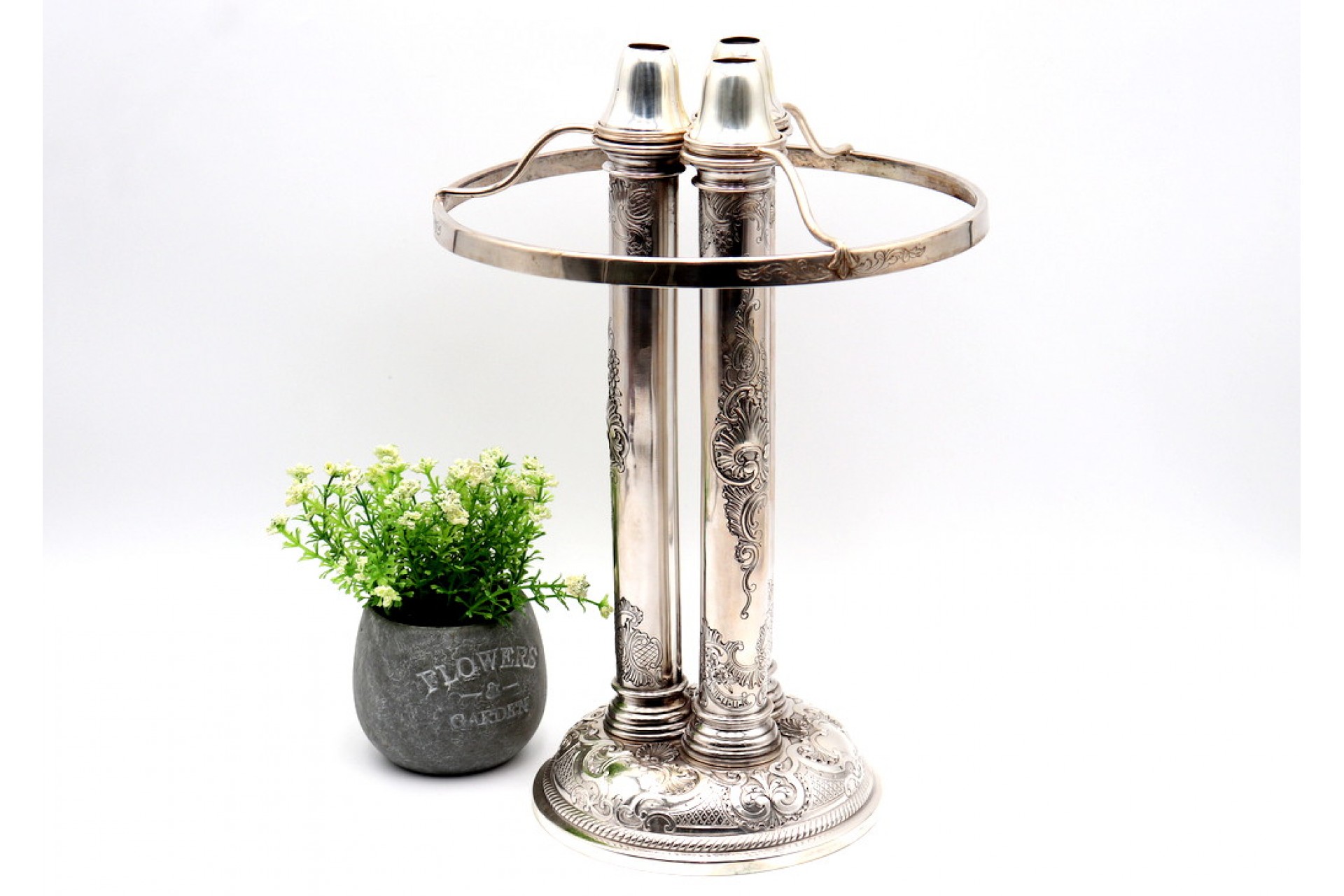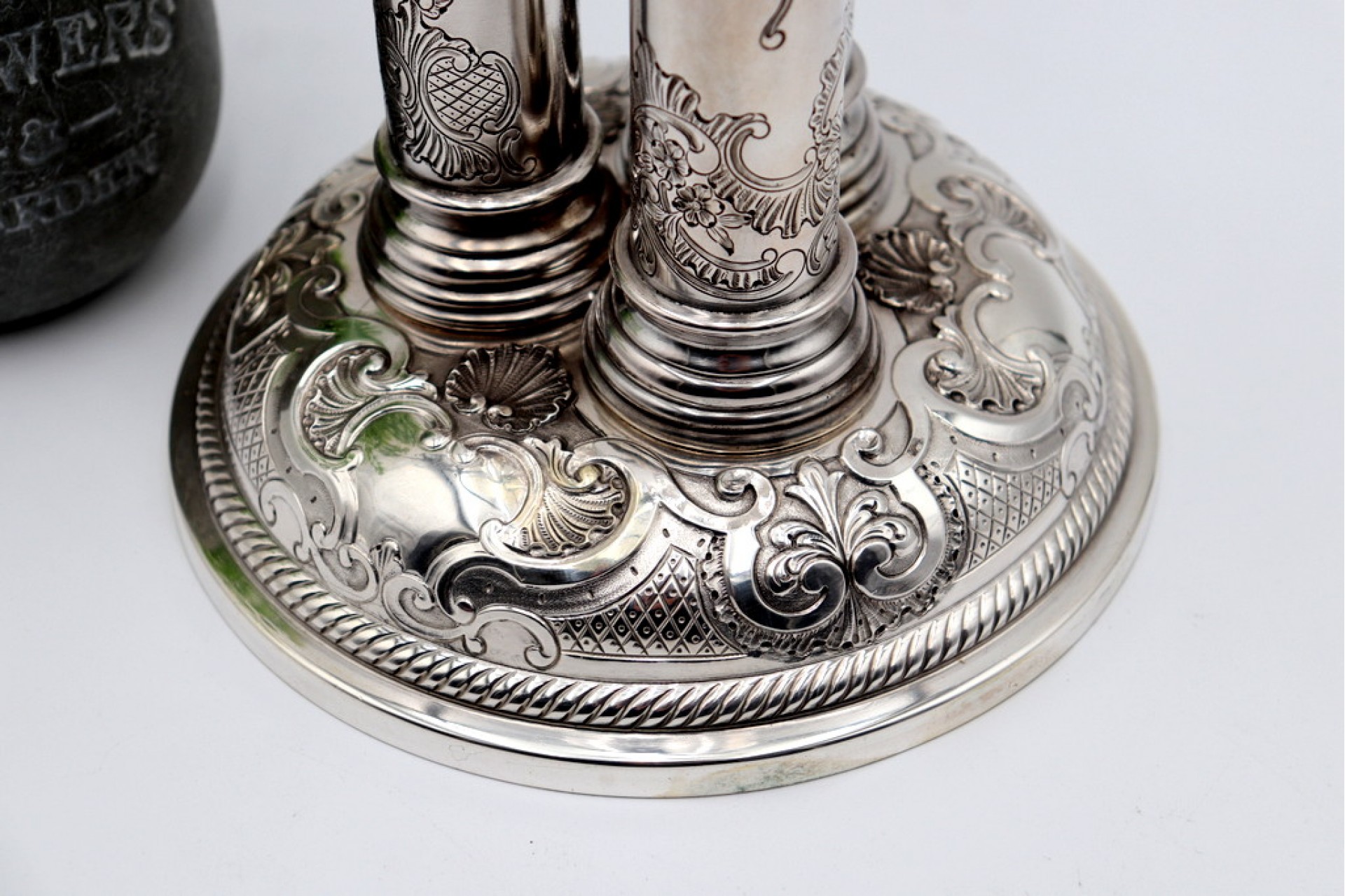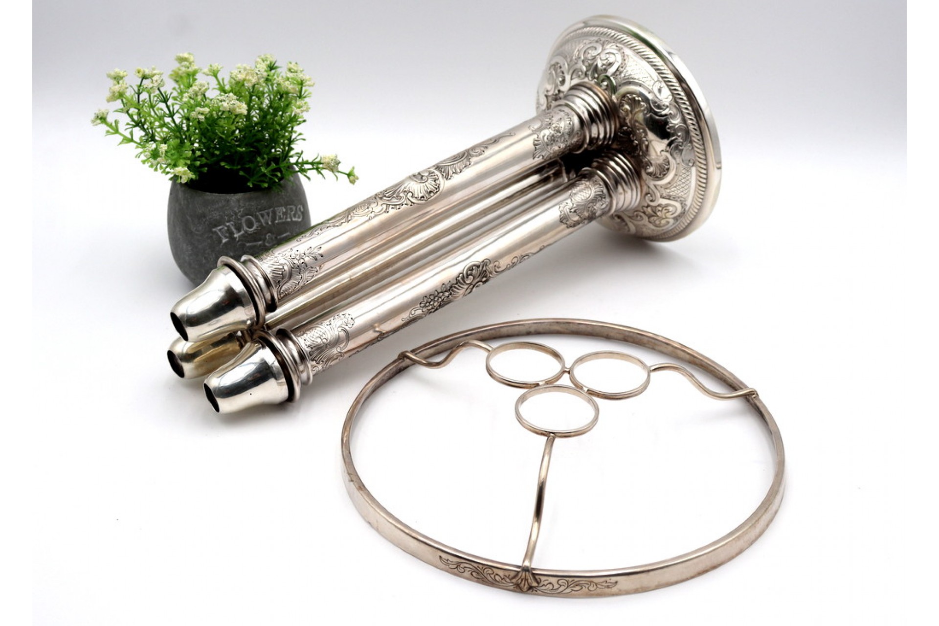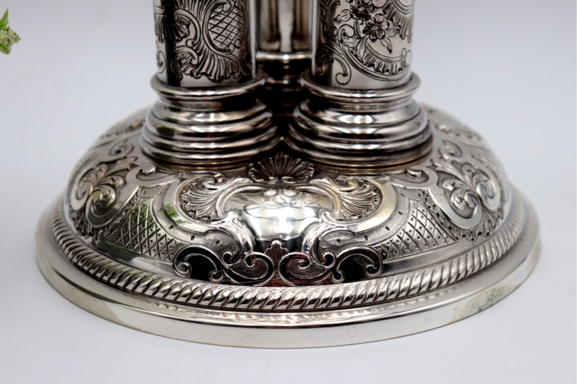 • Descrição: Porta velas em prata com gravados, três suportes e base circular concheada e com cartela para monograma.
