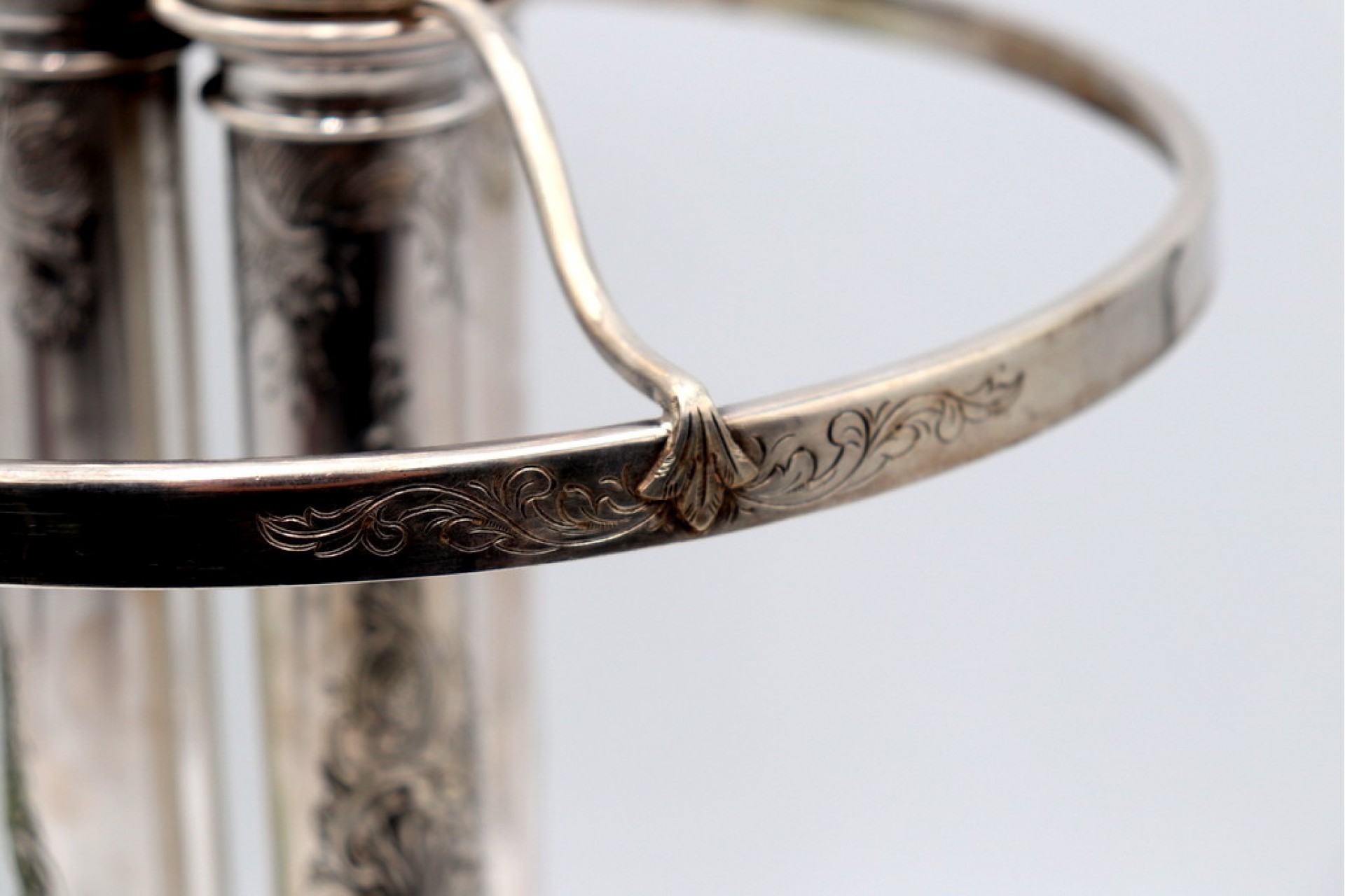 Porta velas em prata com gravados, três suportes e base circular concheada