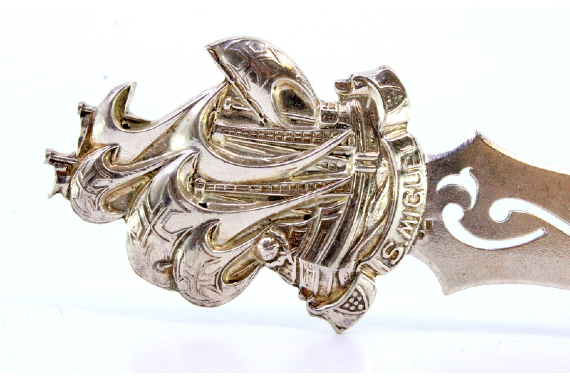 Abre cartas em prata com recortes na lâmina e caravela S.Miguel no cabo.
