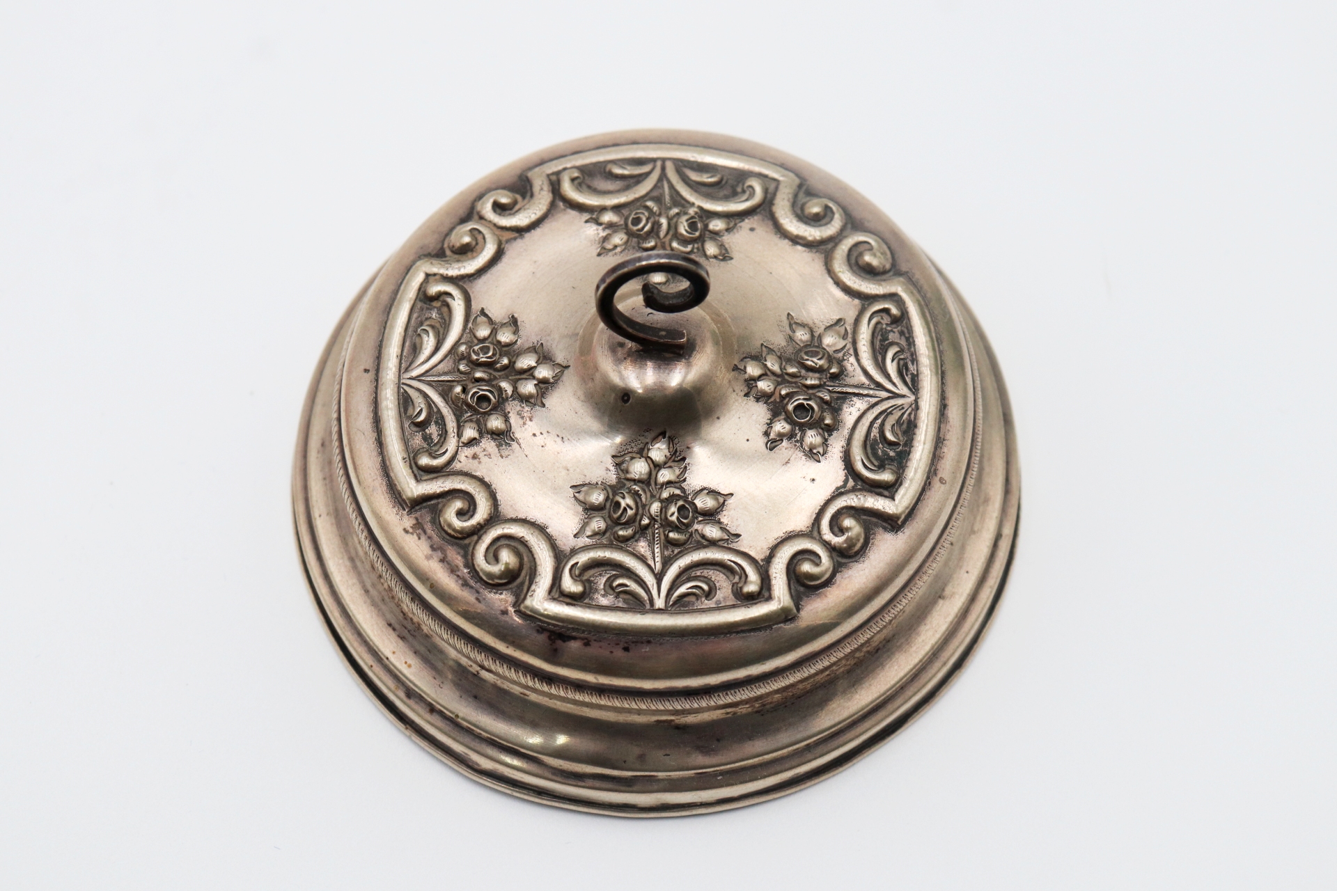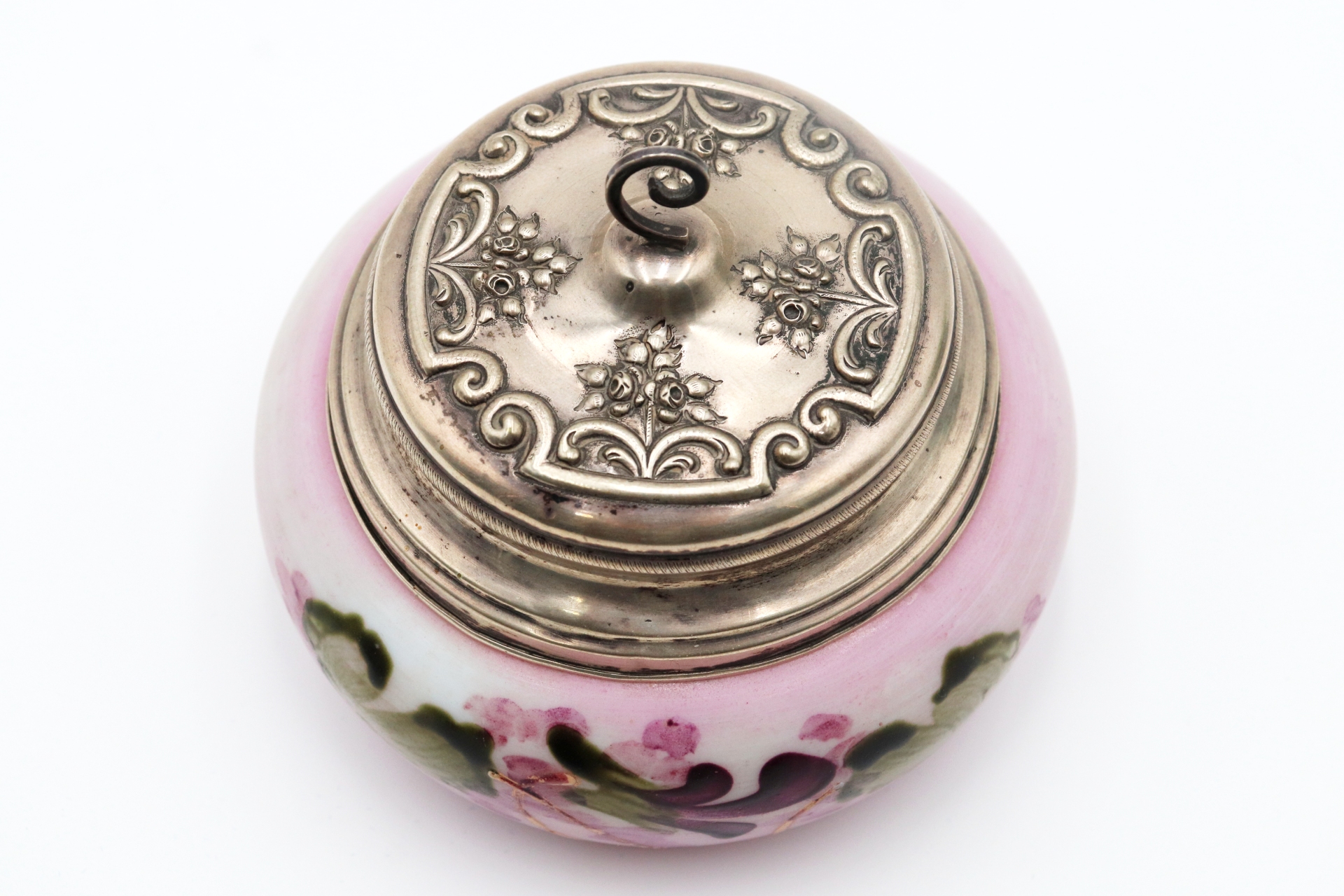 Compoteira de vidro pintado à mão com tampa de prata amovível adornada com motivos florais e pomo recortado.