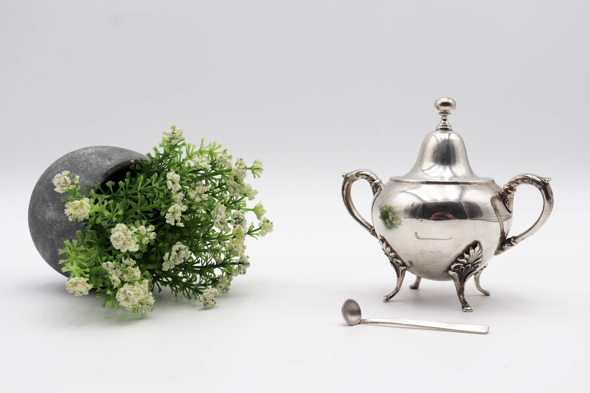 Etiquetas: Açucareiro, prata, pomo, colher