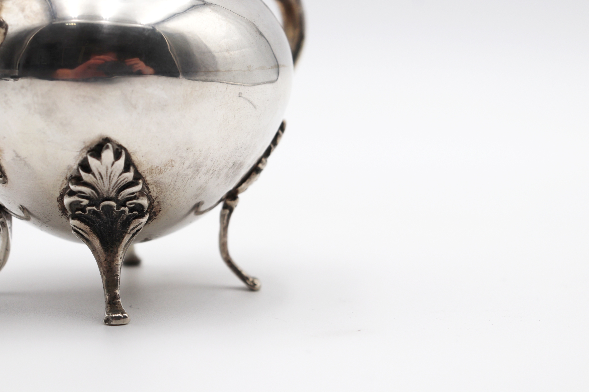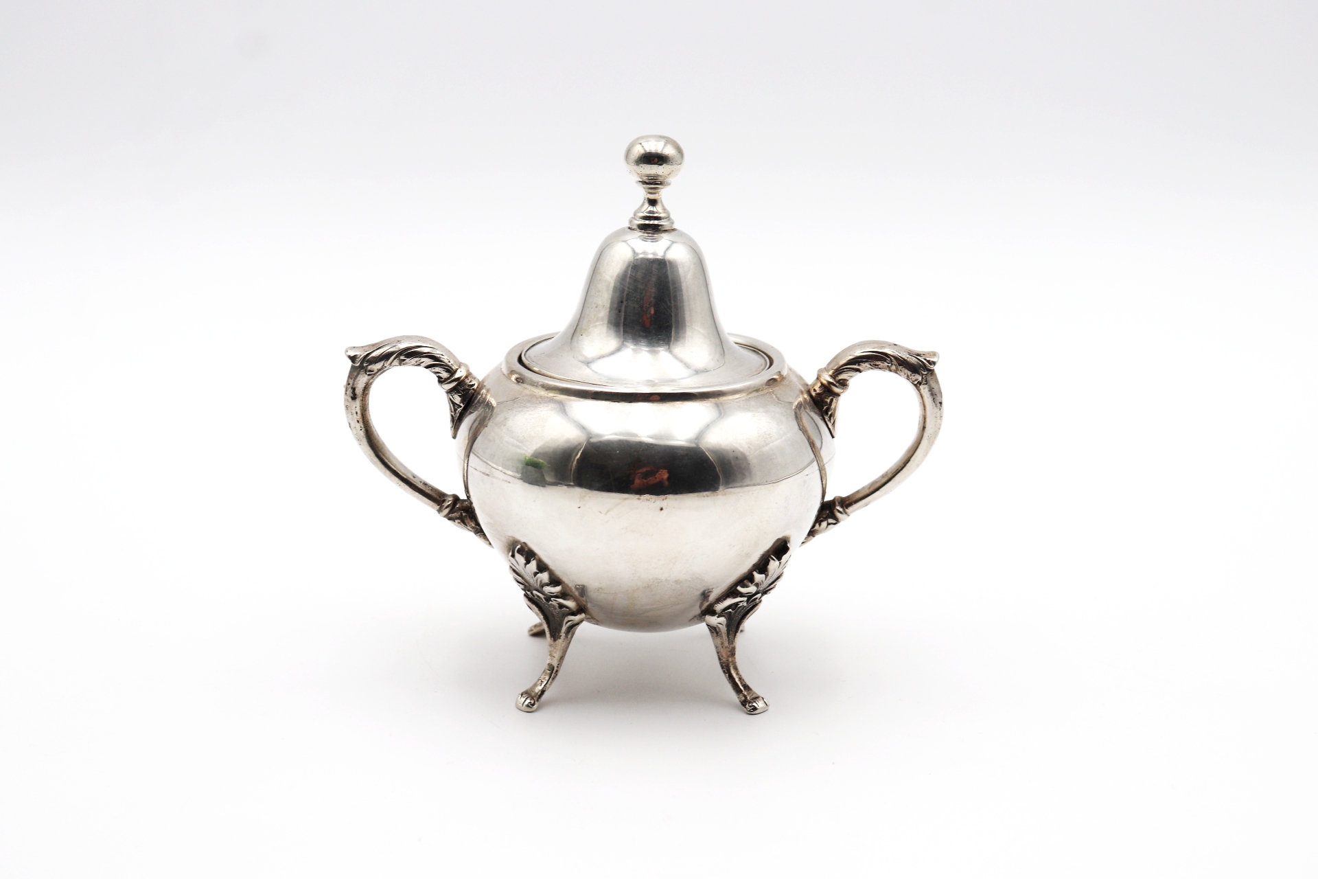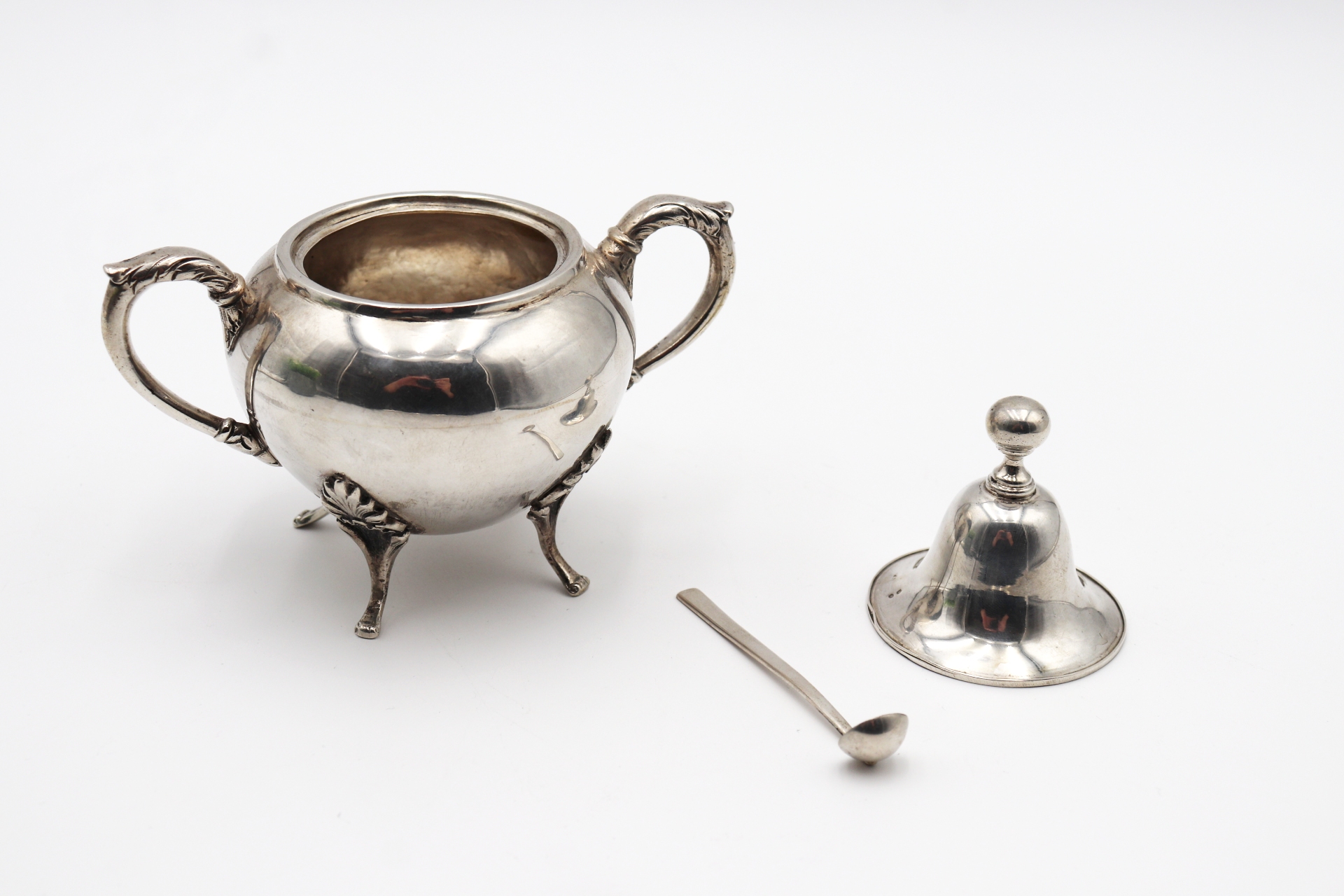 • Descrição: Açucareiro bojudo em prata com pomo na tampa, duas asas fixas e pés alteados com folhas de acanto relevadas e em forma de garras.