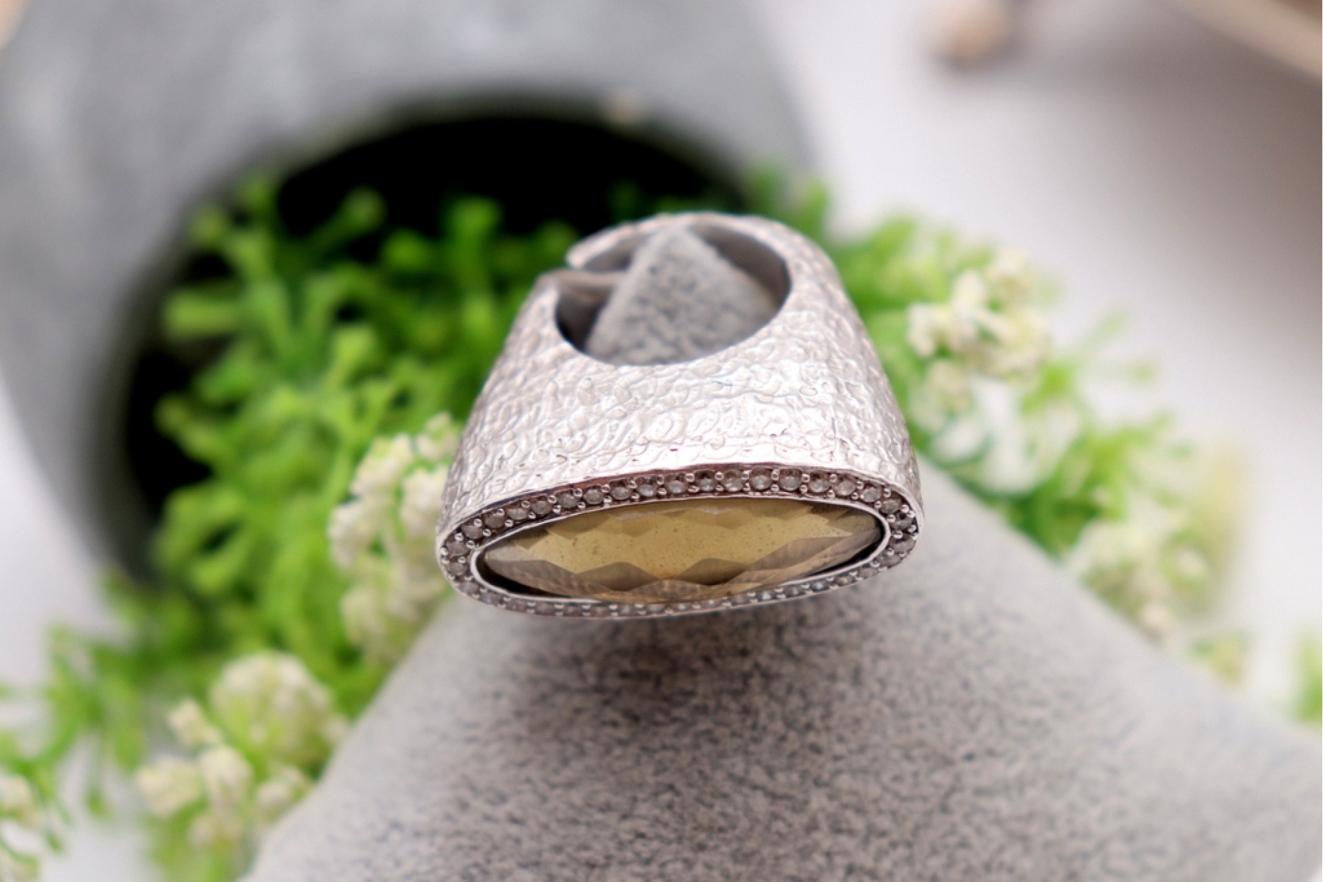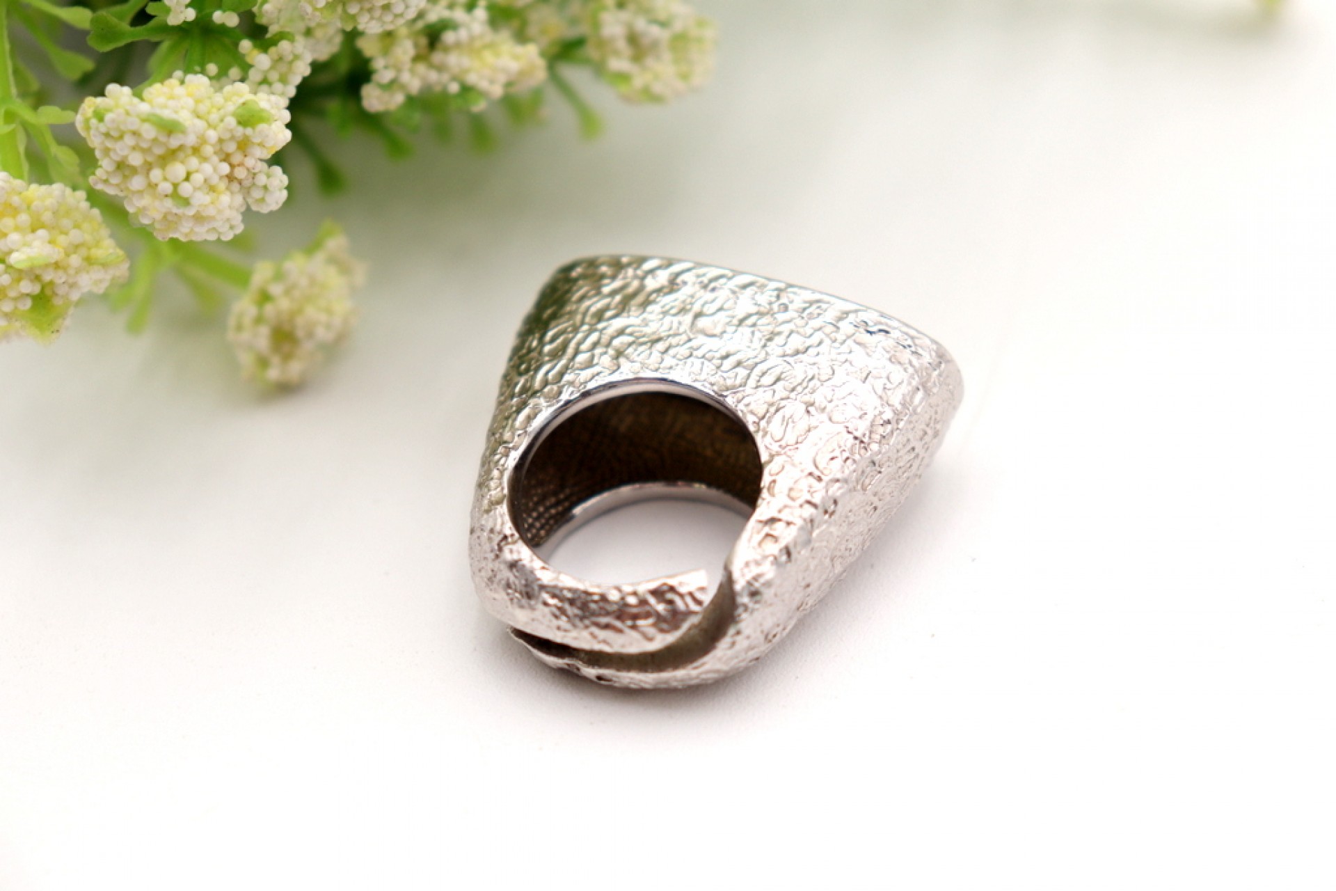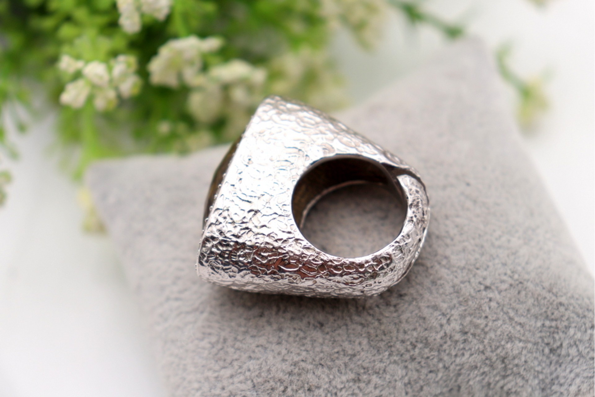 Anel em prata com relevos e pedra lapidada ao estilo modernista