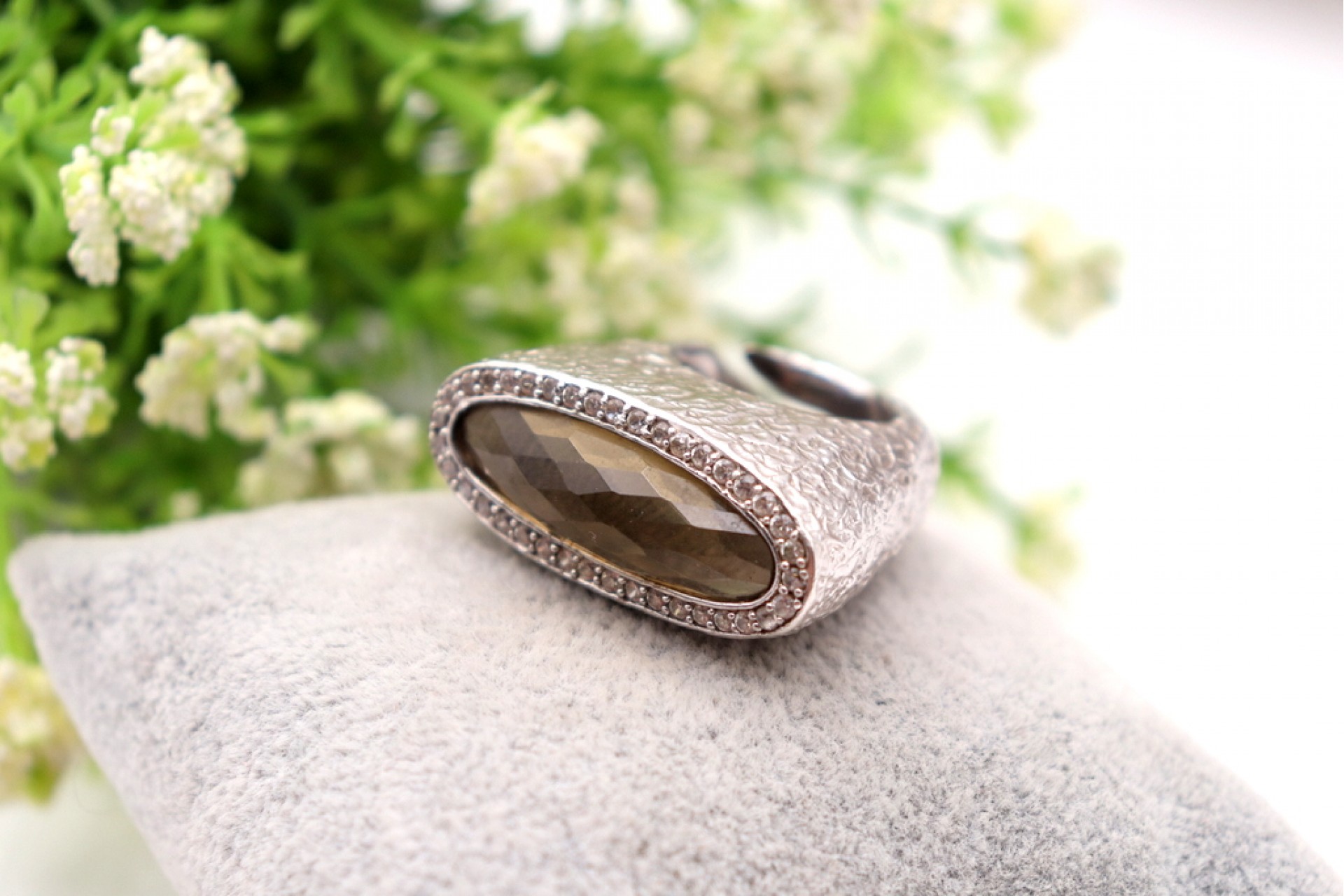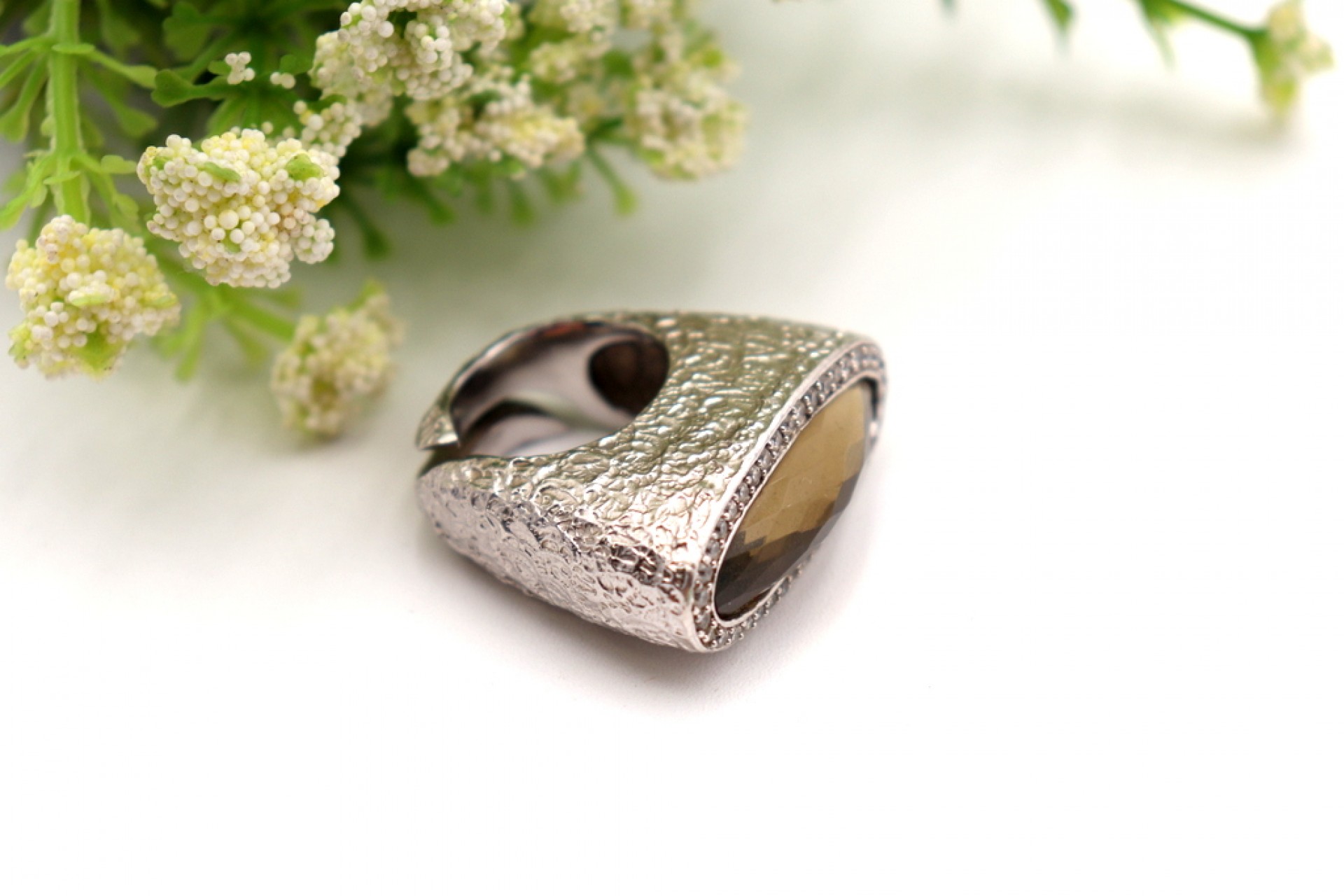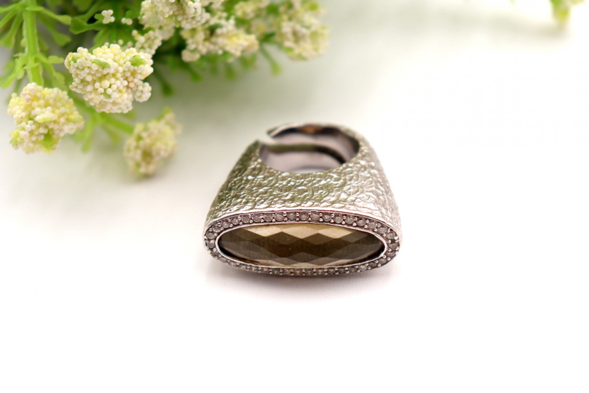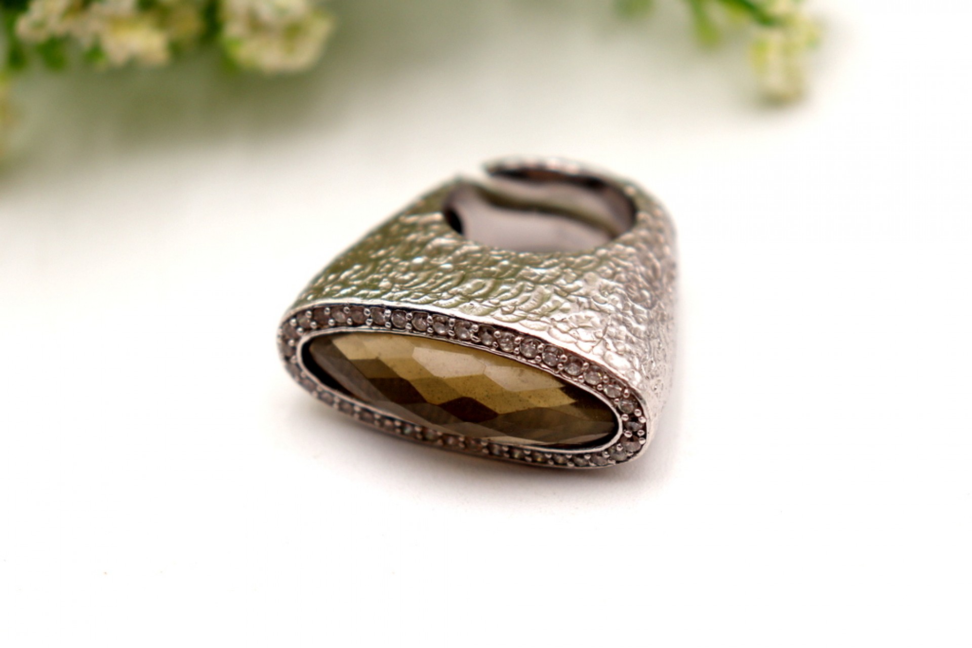 Anel em prata com relevos e pedra lapidada ao estilo modernista