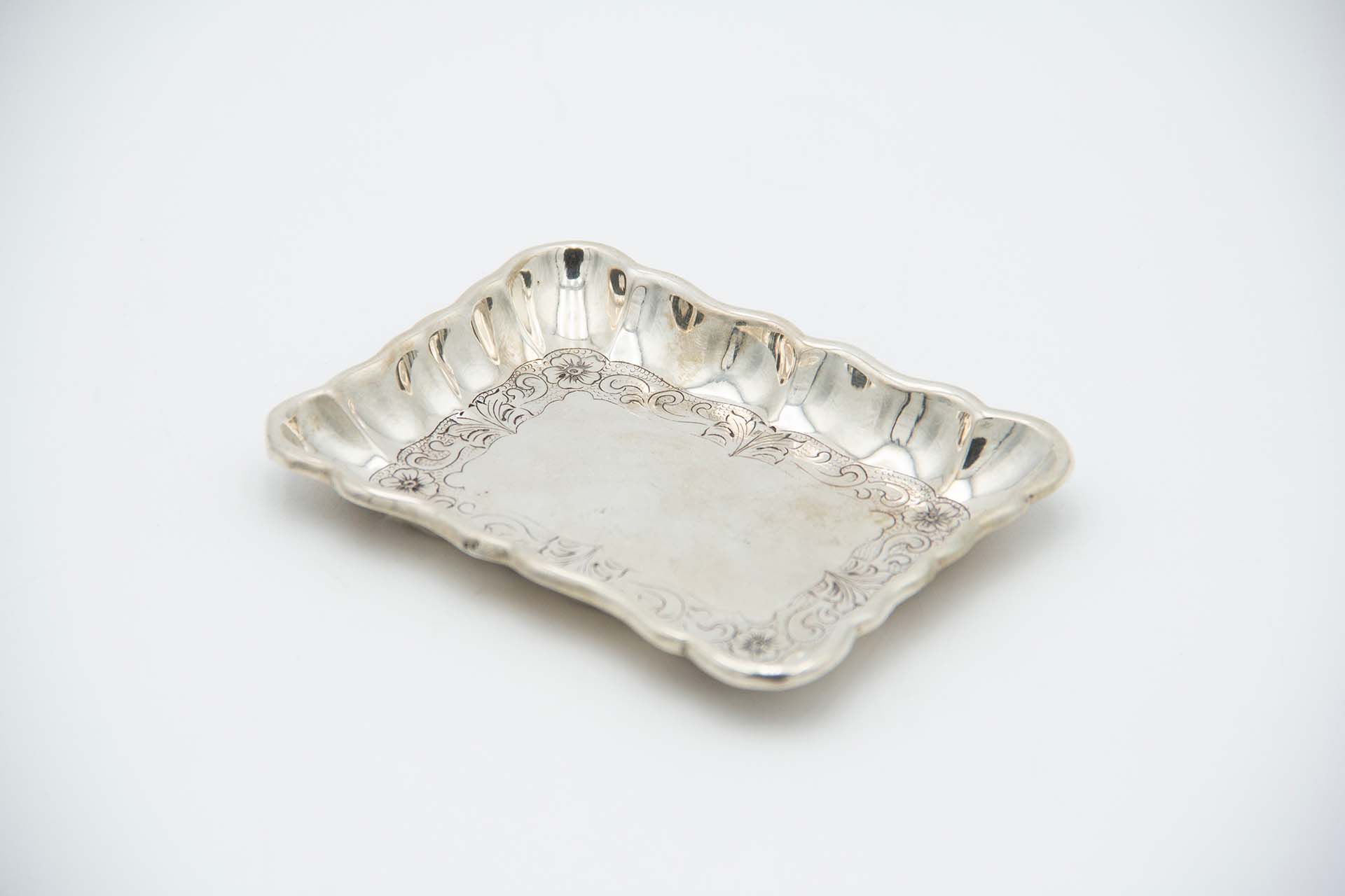 • Descrição: Aneleira de prata de forma retangular com apontamentos de flores gravadas.