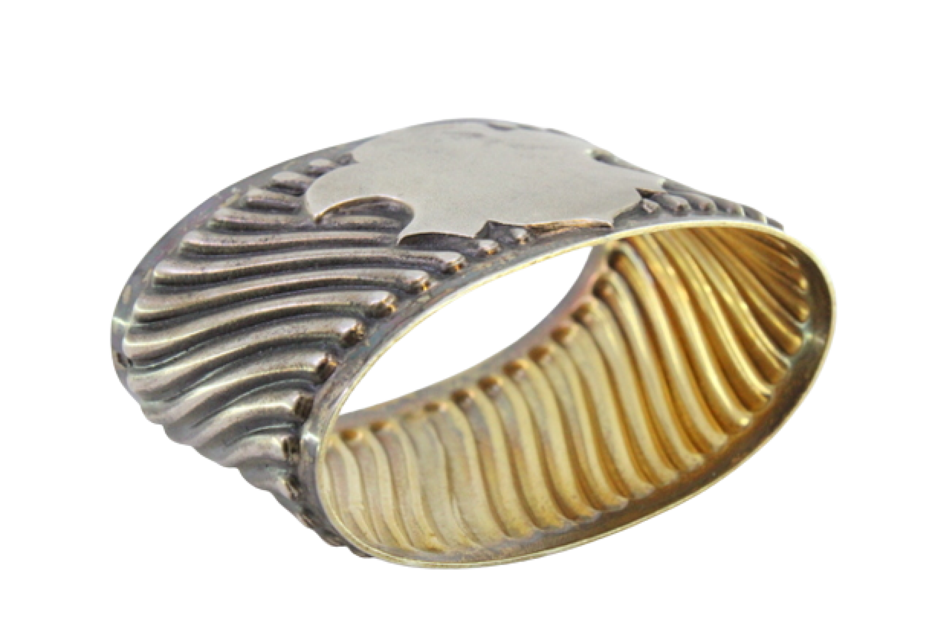 Argola de guardanapo em prata com aplicações espiraladas e cartela para monograma.