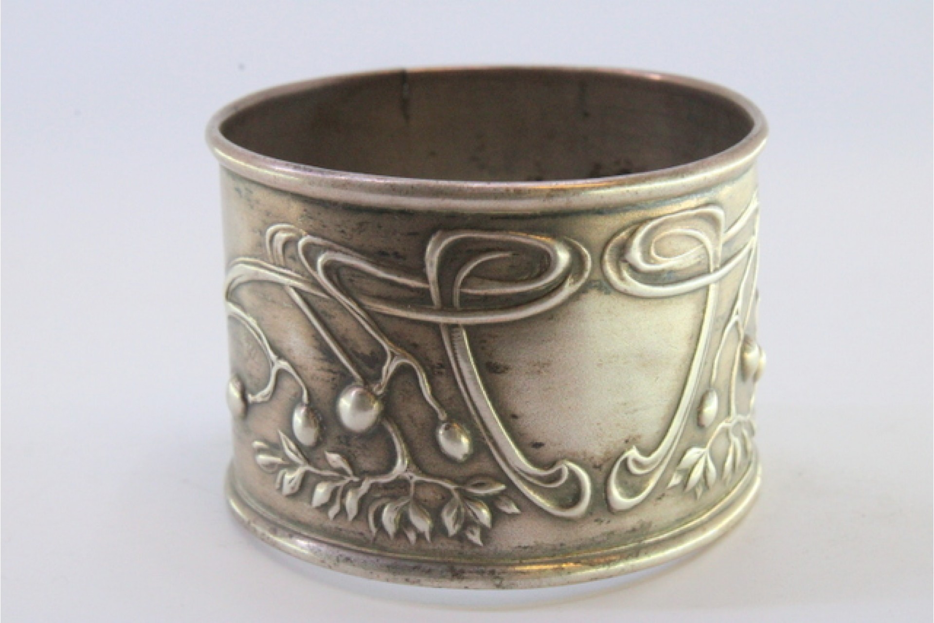 • Descrição: Argola de guardanapo em prata com motivos florais relevados envolvendo cartela para monograma.