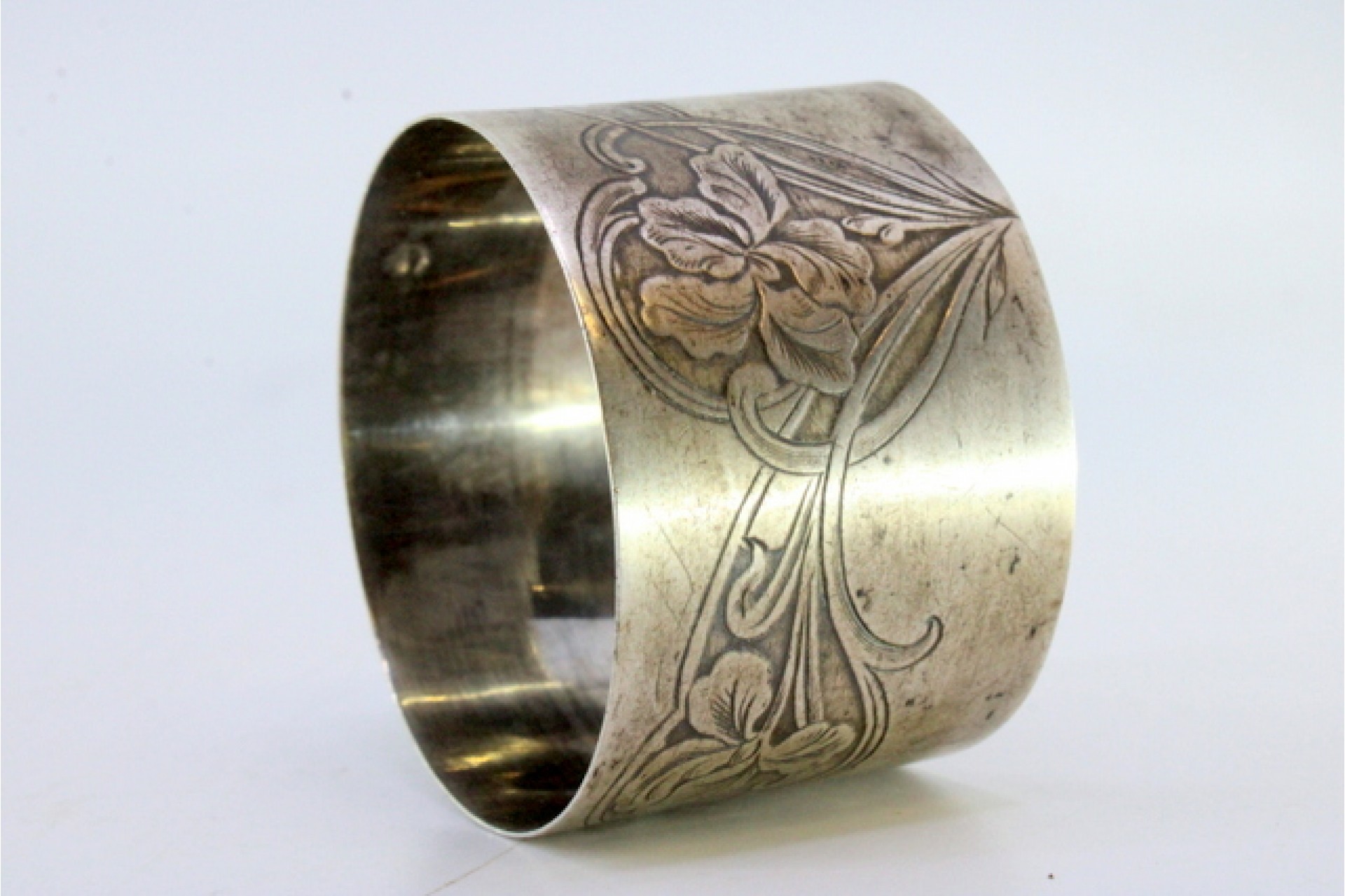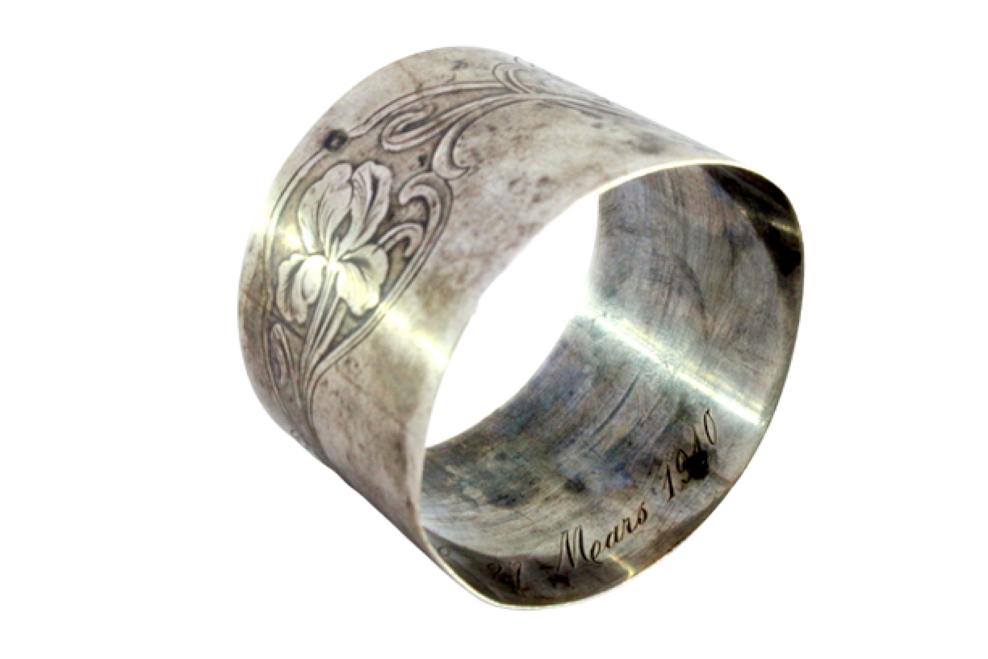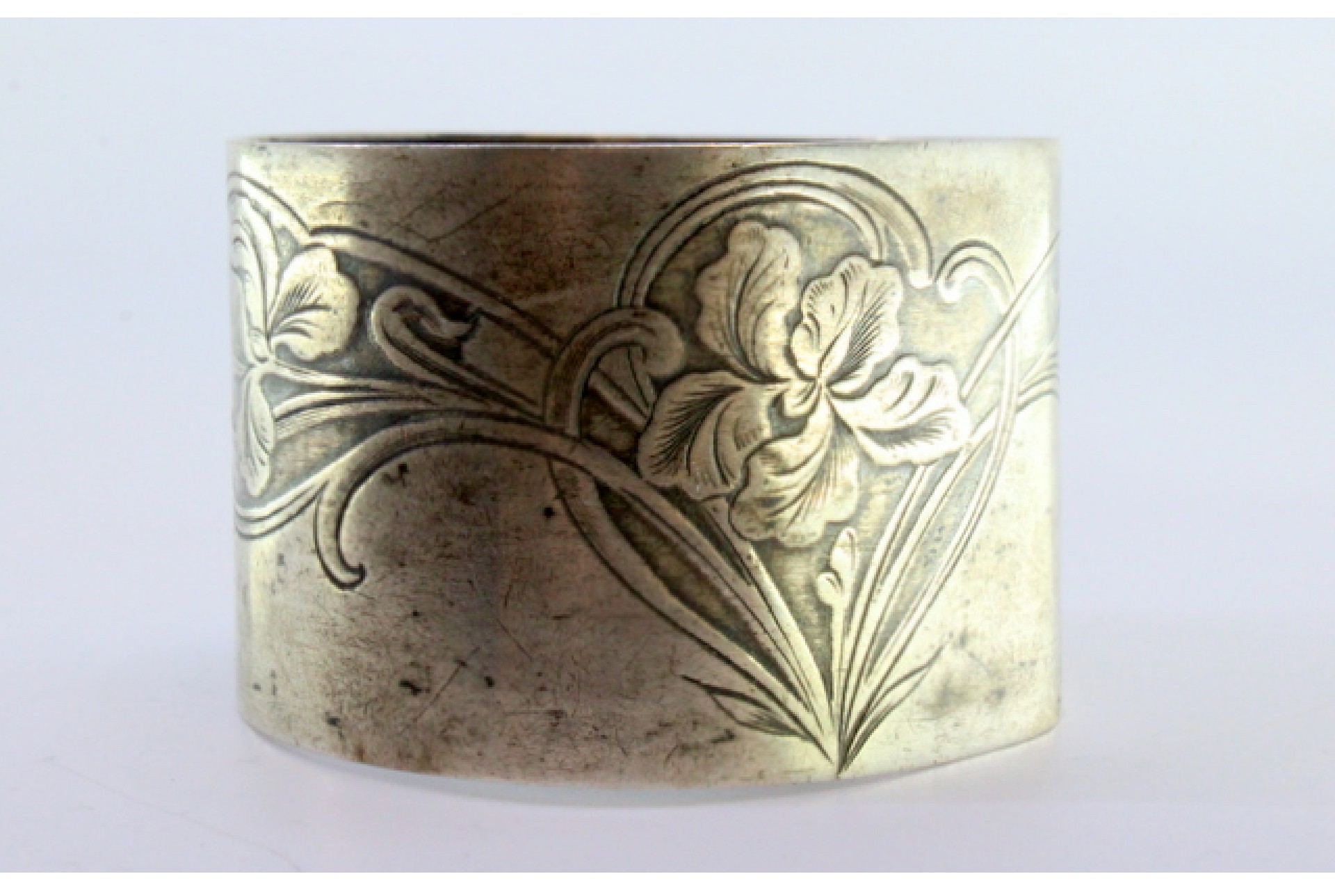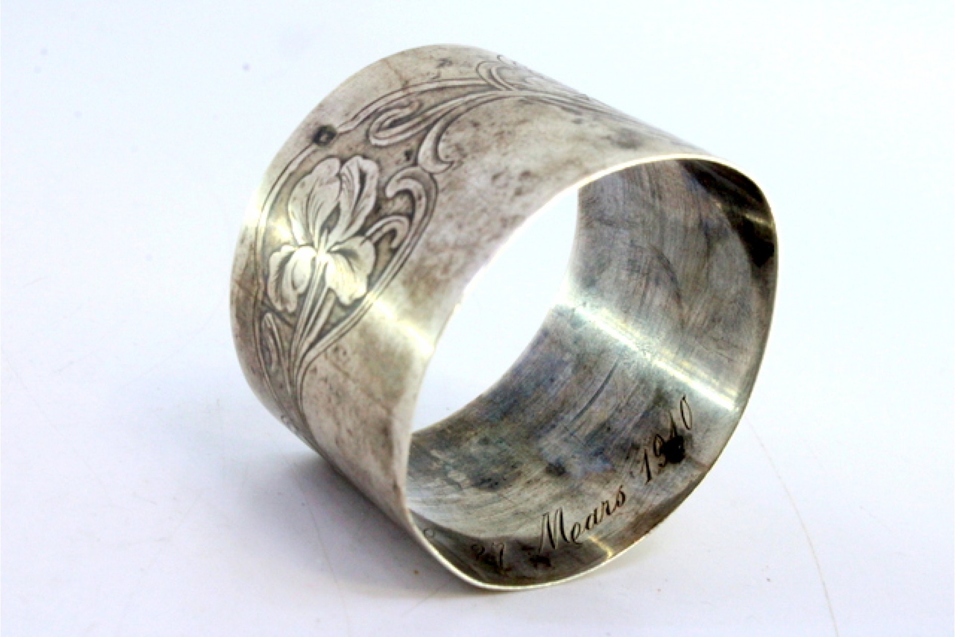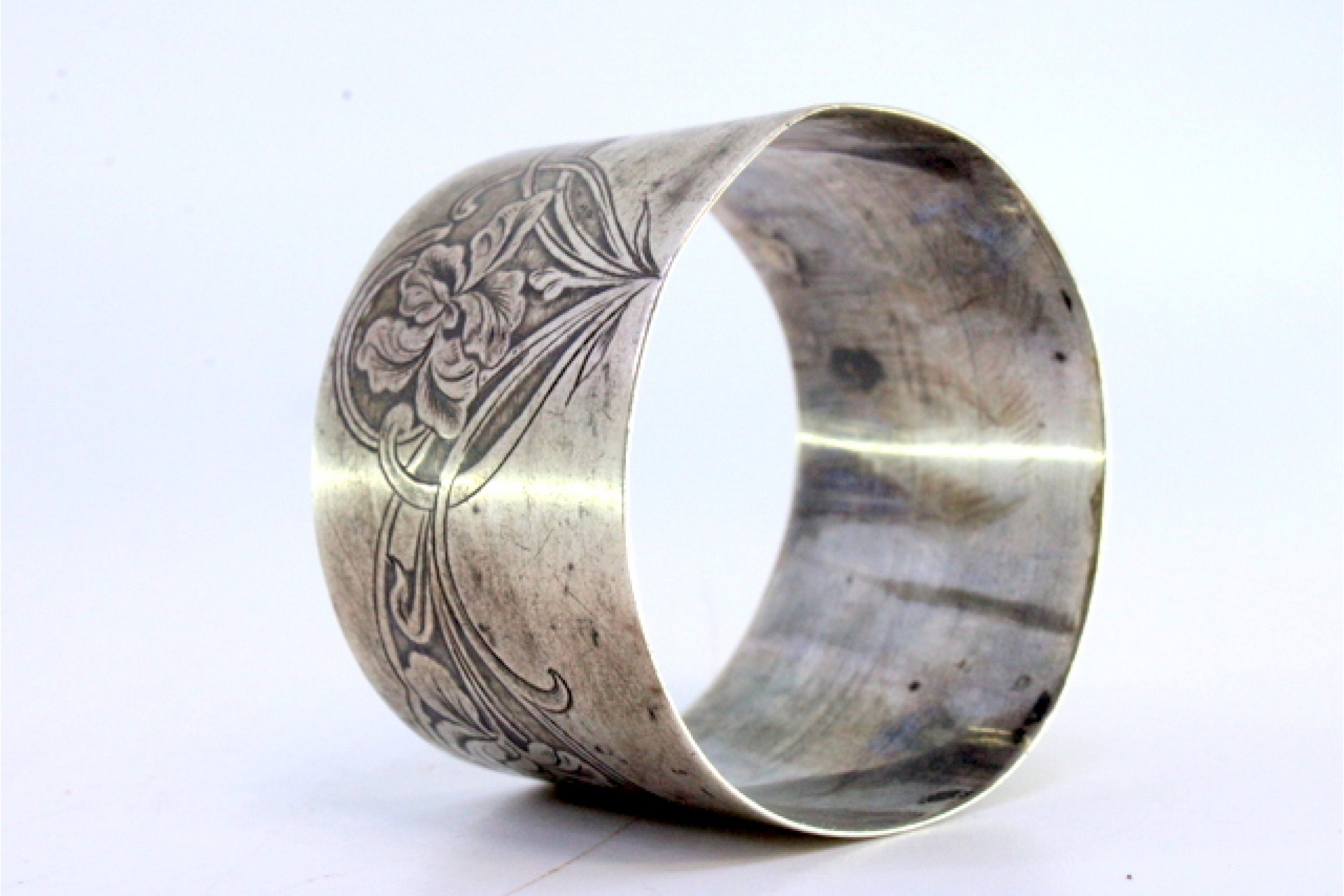 Argola de guardanapo em prata com relevos florais gravados.