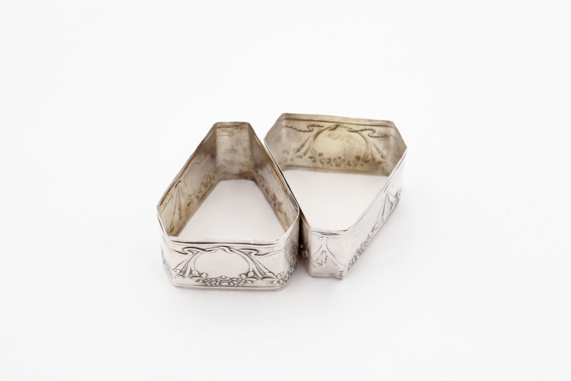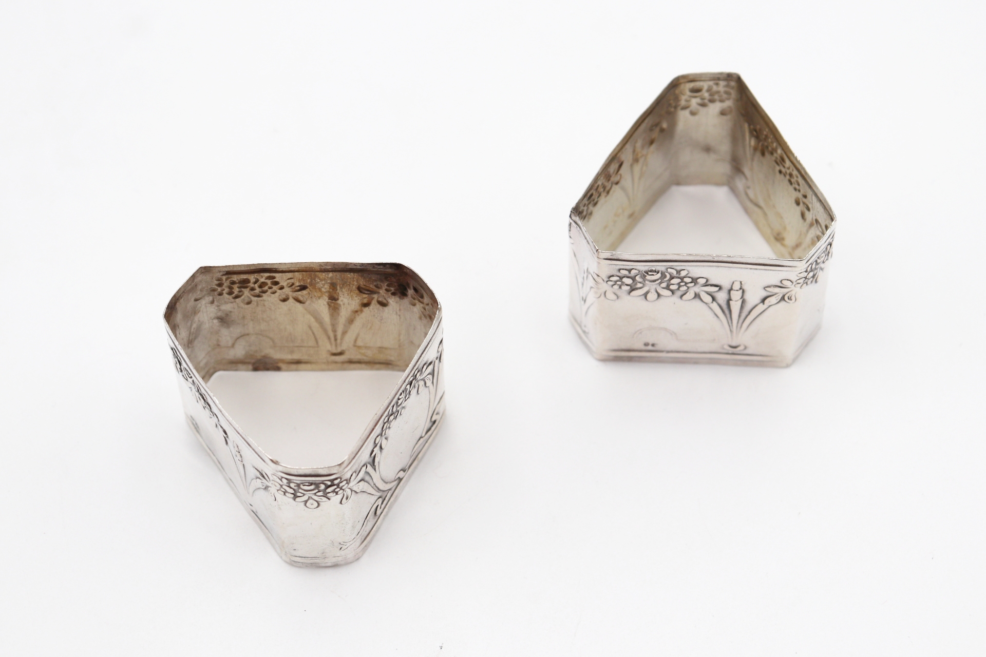 • Descrição: Par de argolas de guardanapo em prata com motivos vegetalistas relevados e formato triangular.