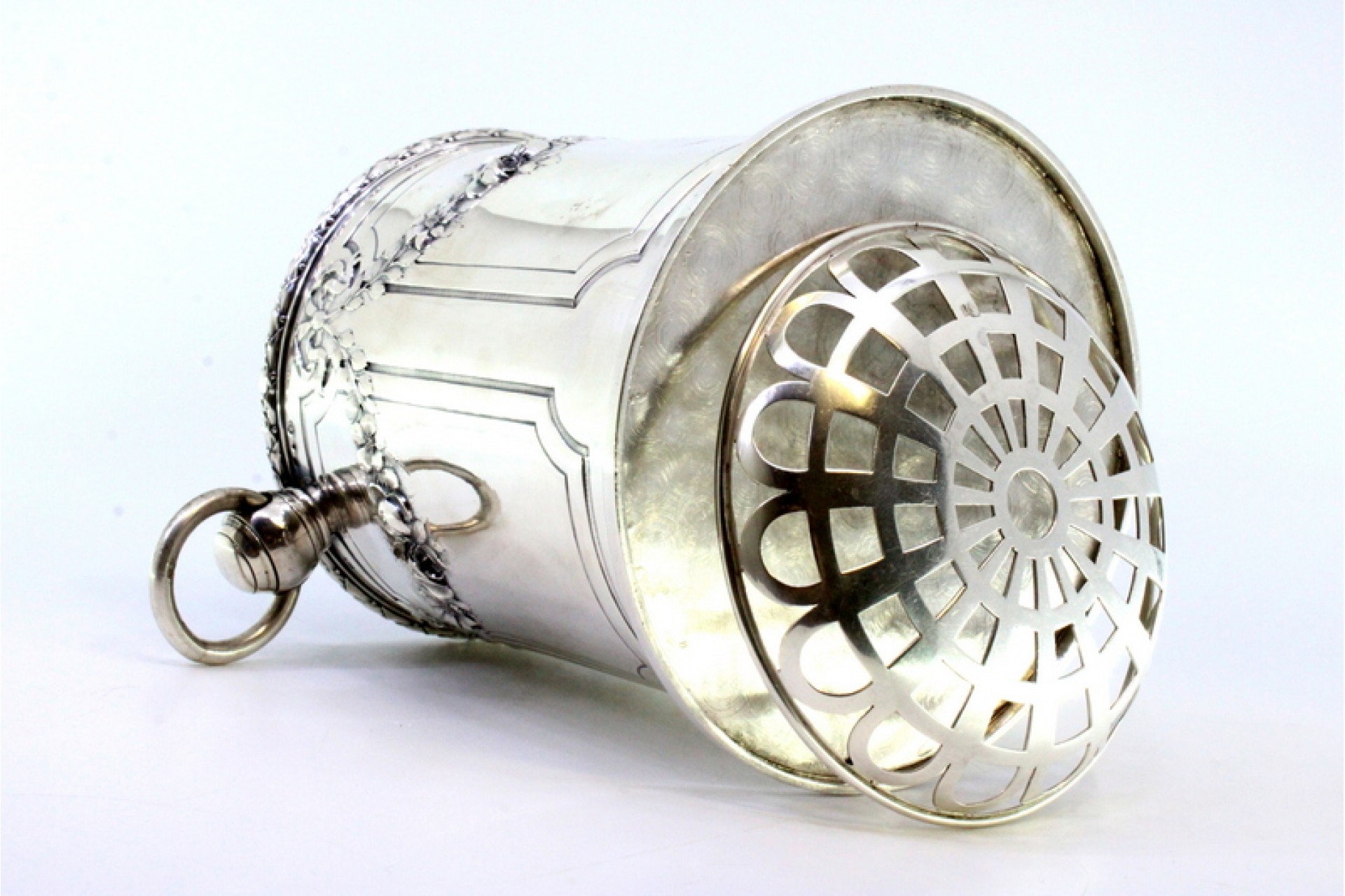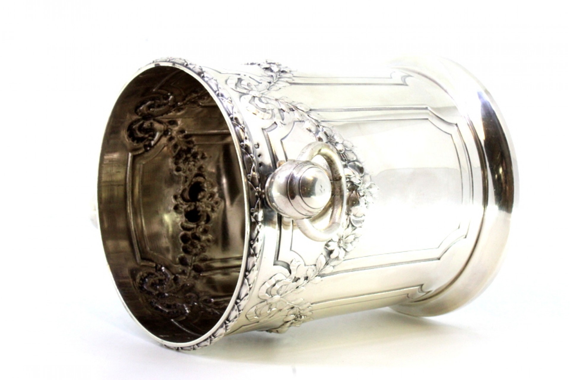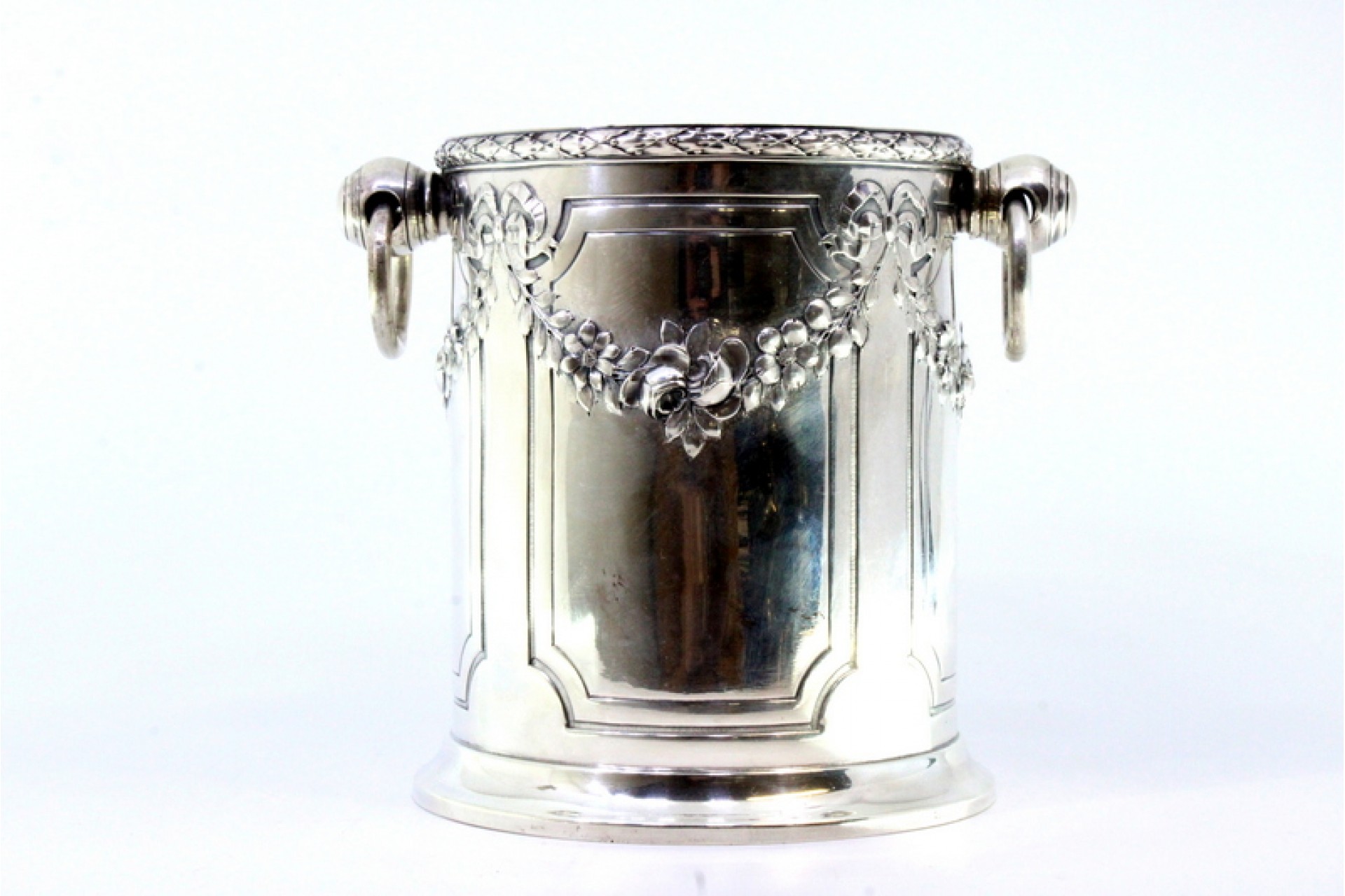 • Descrição: Balde de gelo em prata com relevos florais, laços, grinaldas, duas pegas com argolas e base redonda.