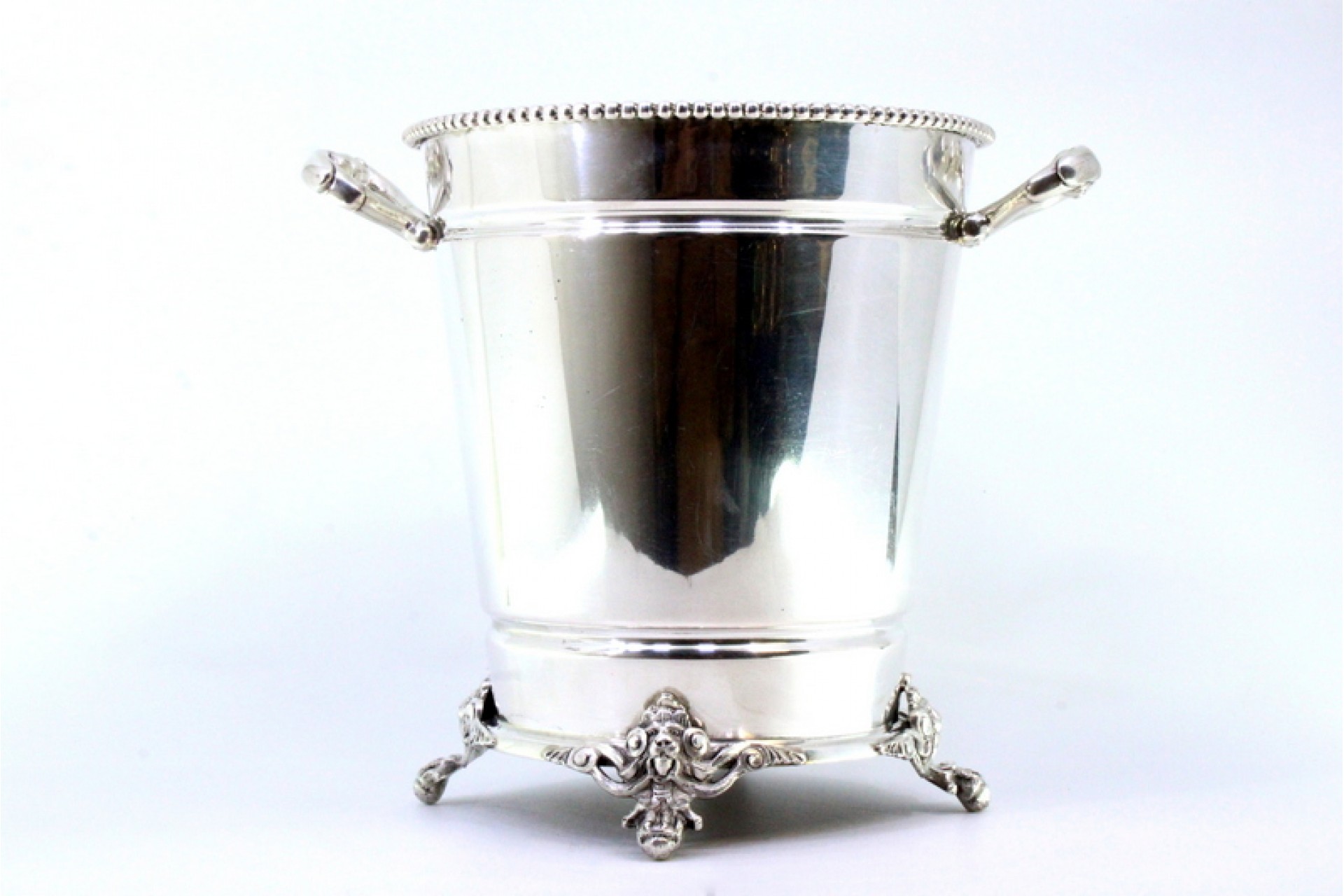 • Descrição: Balde de gelo em prata lisa, friso perlado no rebordo, com duas pegas fixas e base com quatro pés com leões profusamente relevados.
