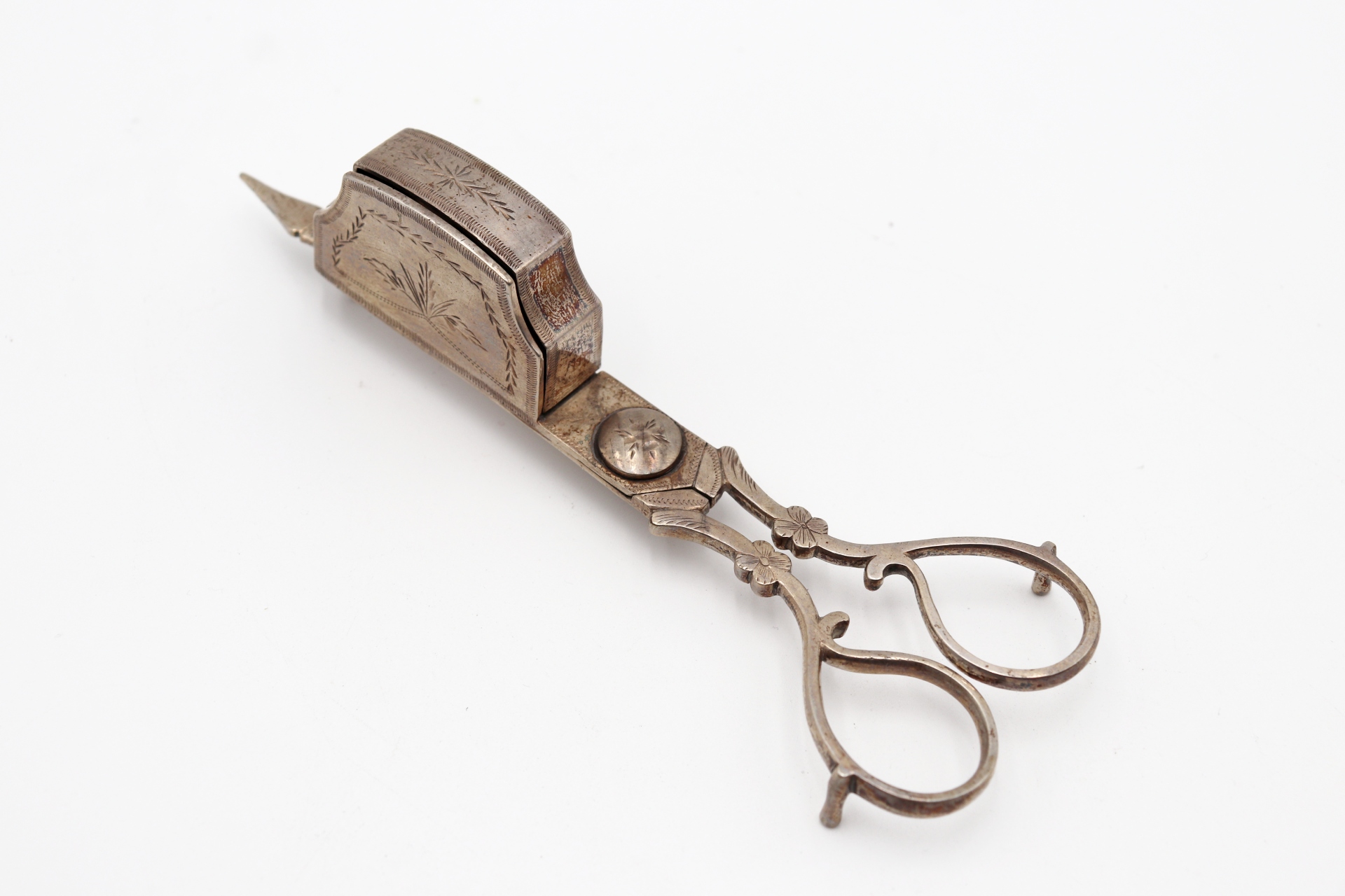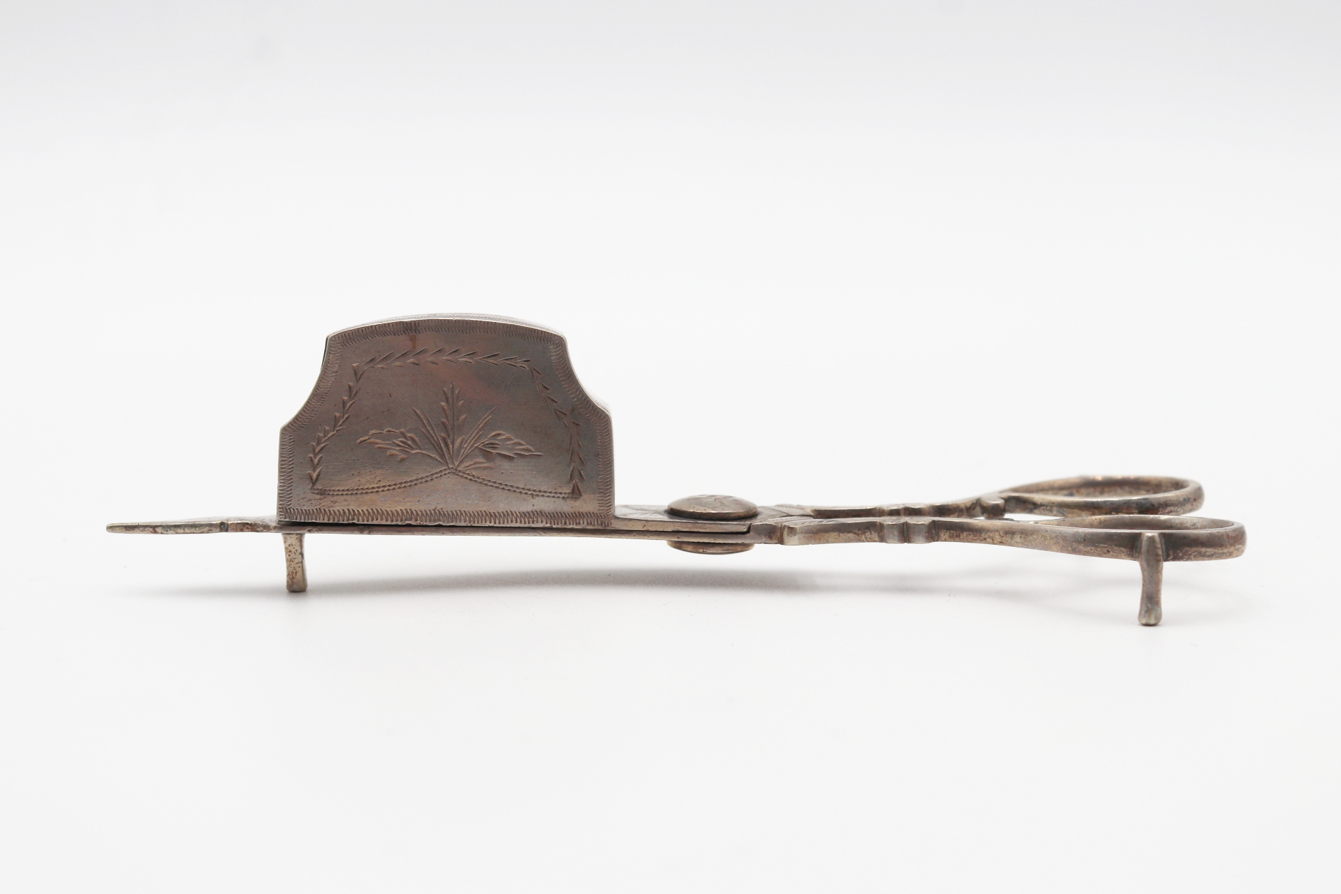 • Descrição: Bandeja e tesoura de morrões em prata com forma de nave , gradinha com gravados e assente em quatro pés recortados.