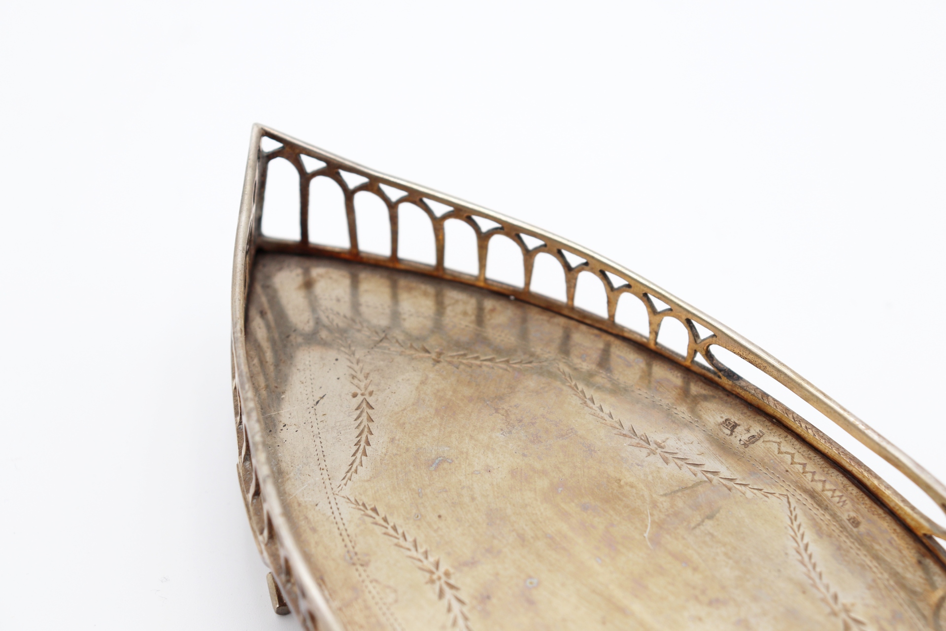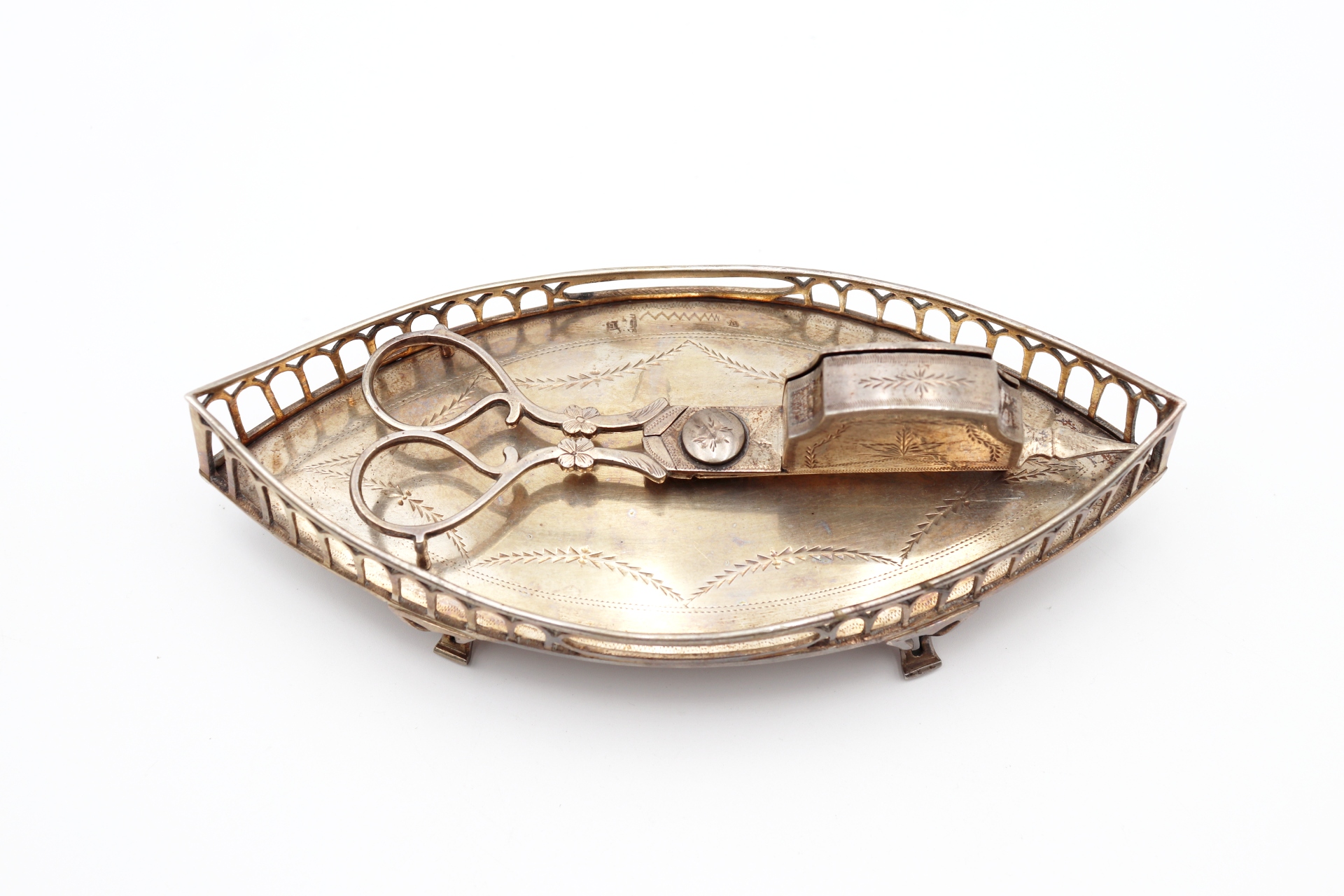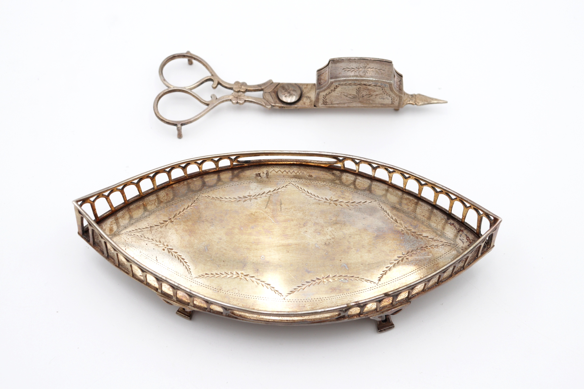 Bandeja e tesoura de morrões em prata, bandeja elíptica com gradinha e gravados