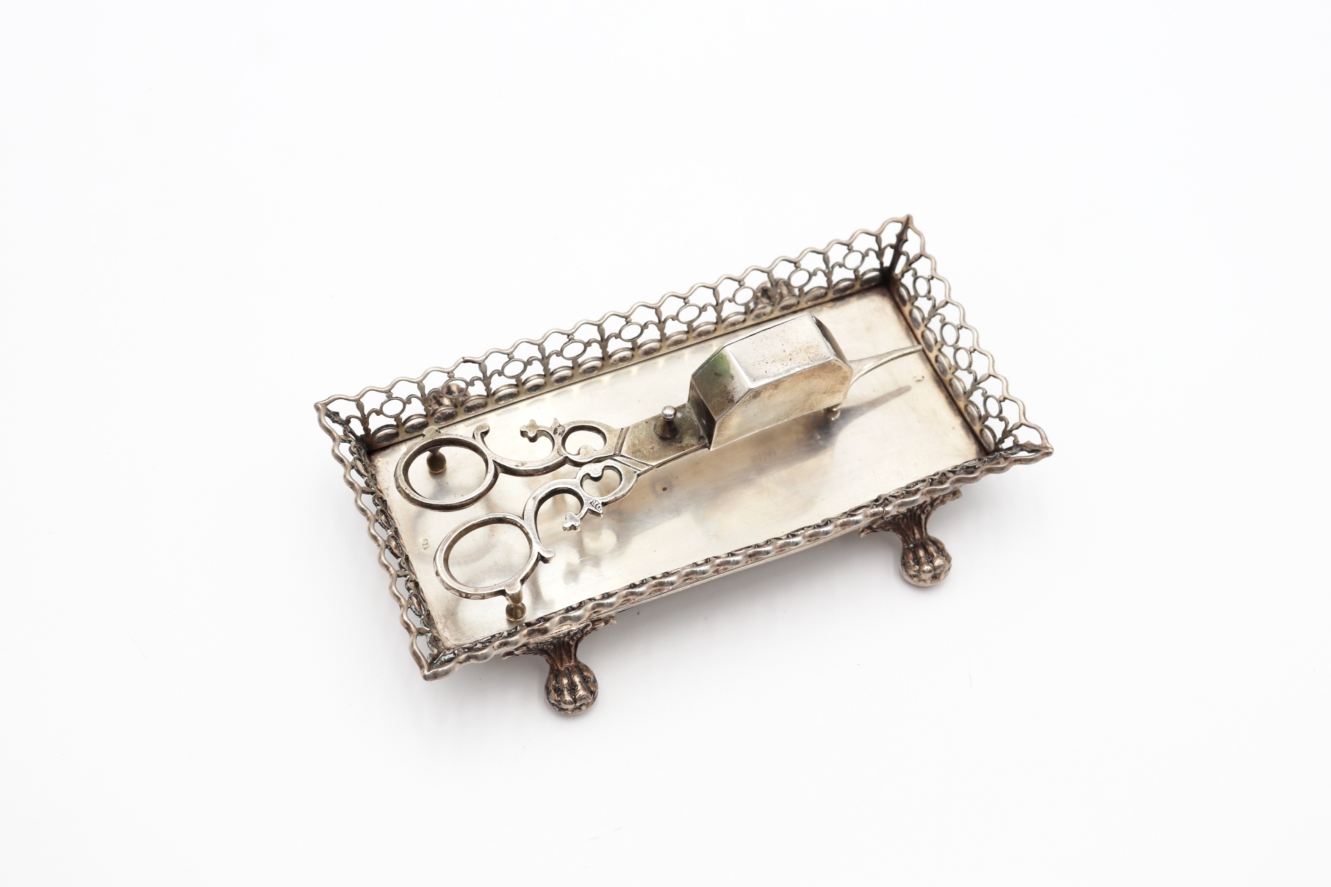 • Descrição: Bandeja e tesoura de morrões em prata lisa com gradinha recortada e assente em quatro pés em forma de garras.