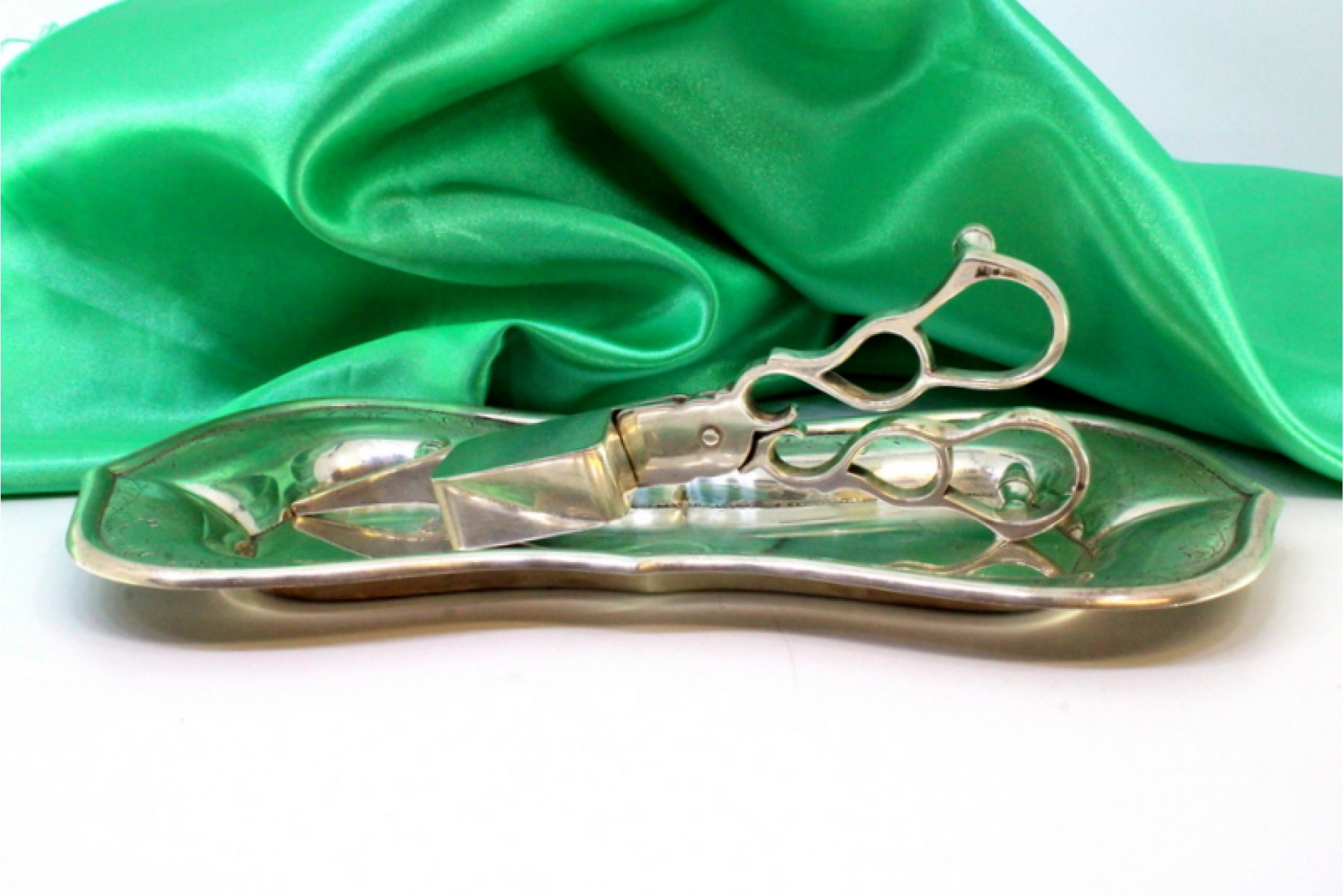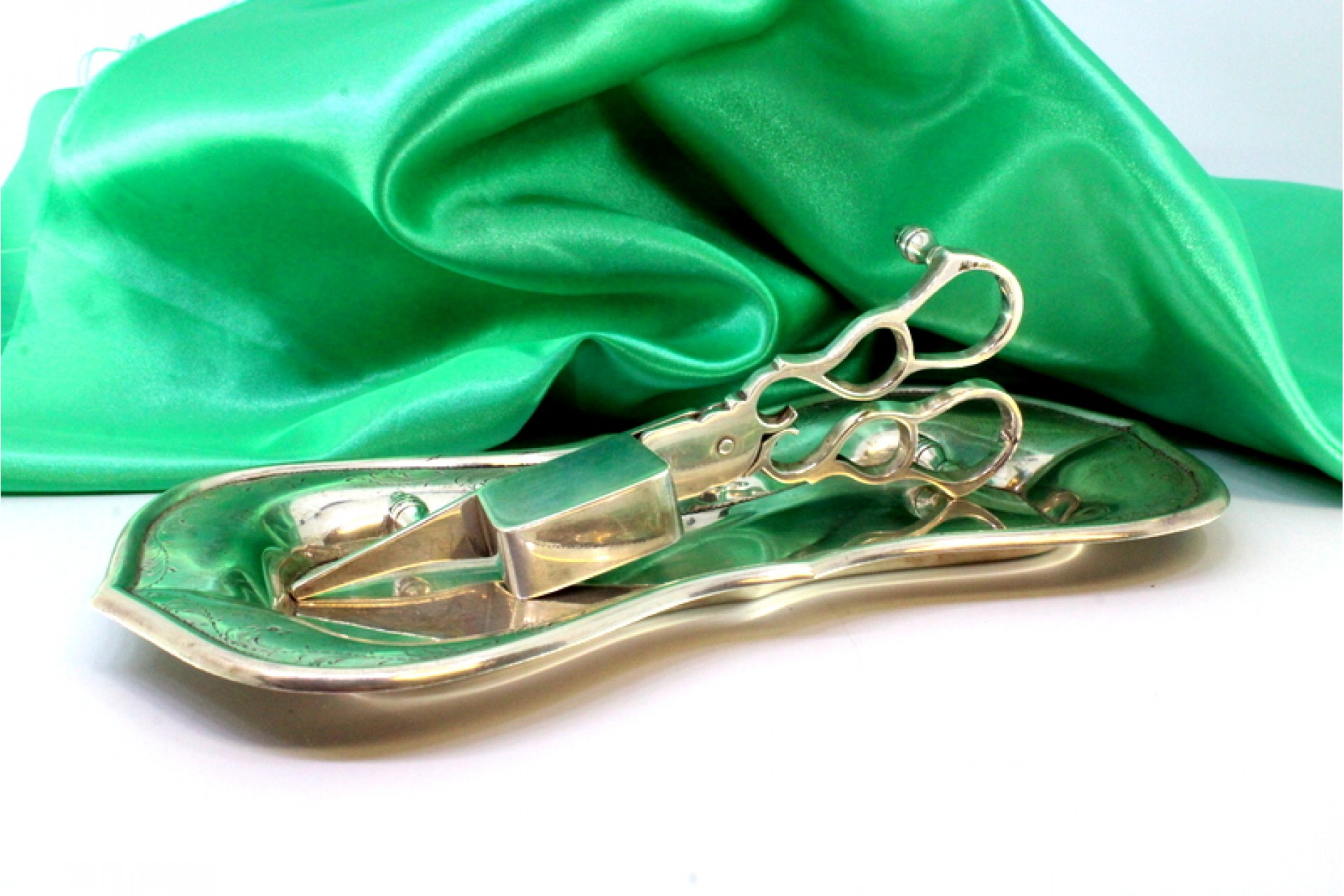 Bandeja e tesoura de morrões com motivos florais gravados na envolvência e friso