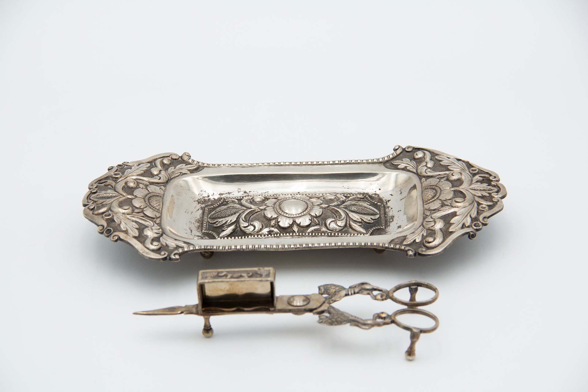 • Descrição: Bandeja e Tesoura de Morrões em prata relevada com motivos florais, frisos e folhas de acanto, assente em quatro apoios.