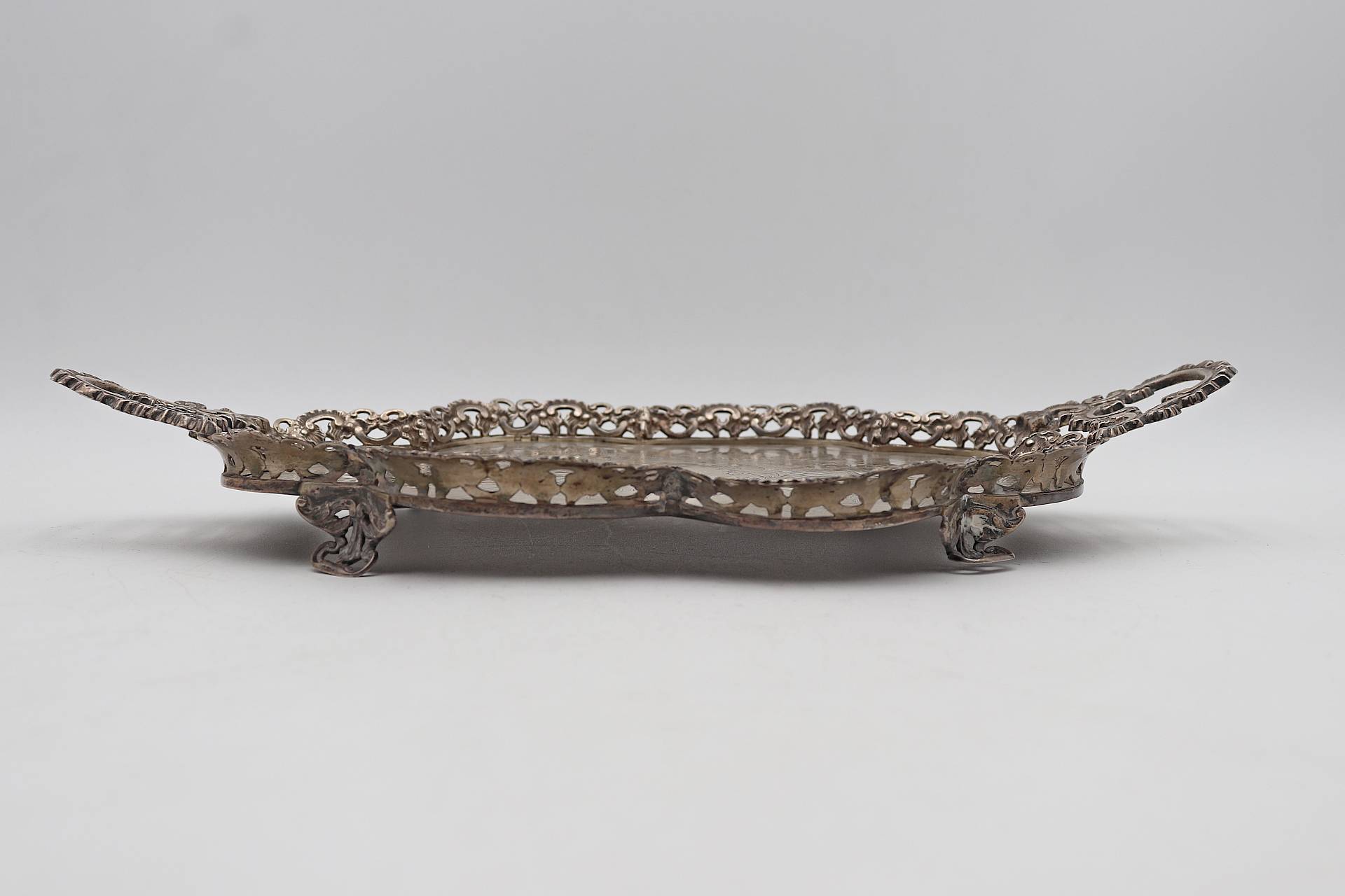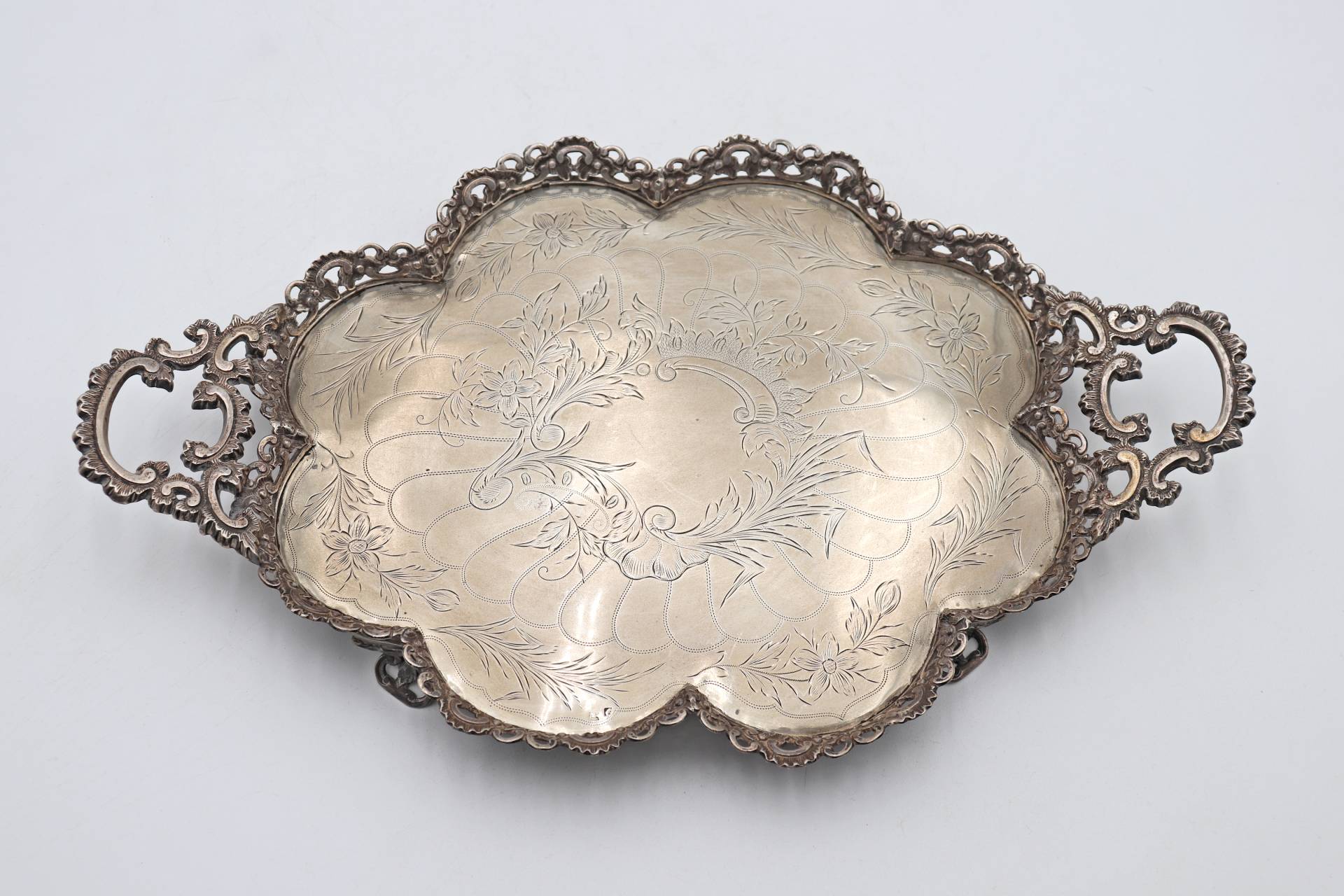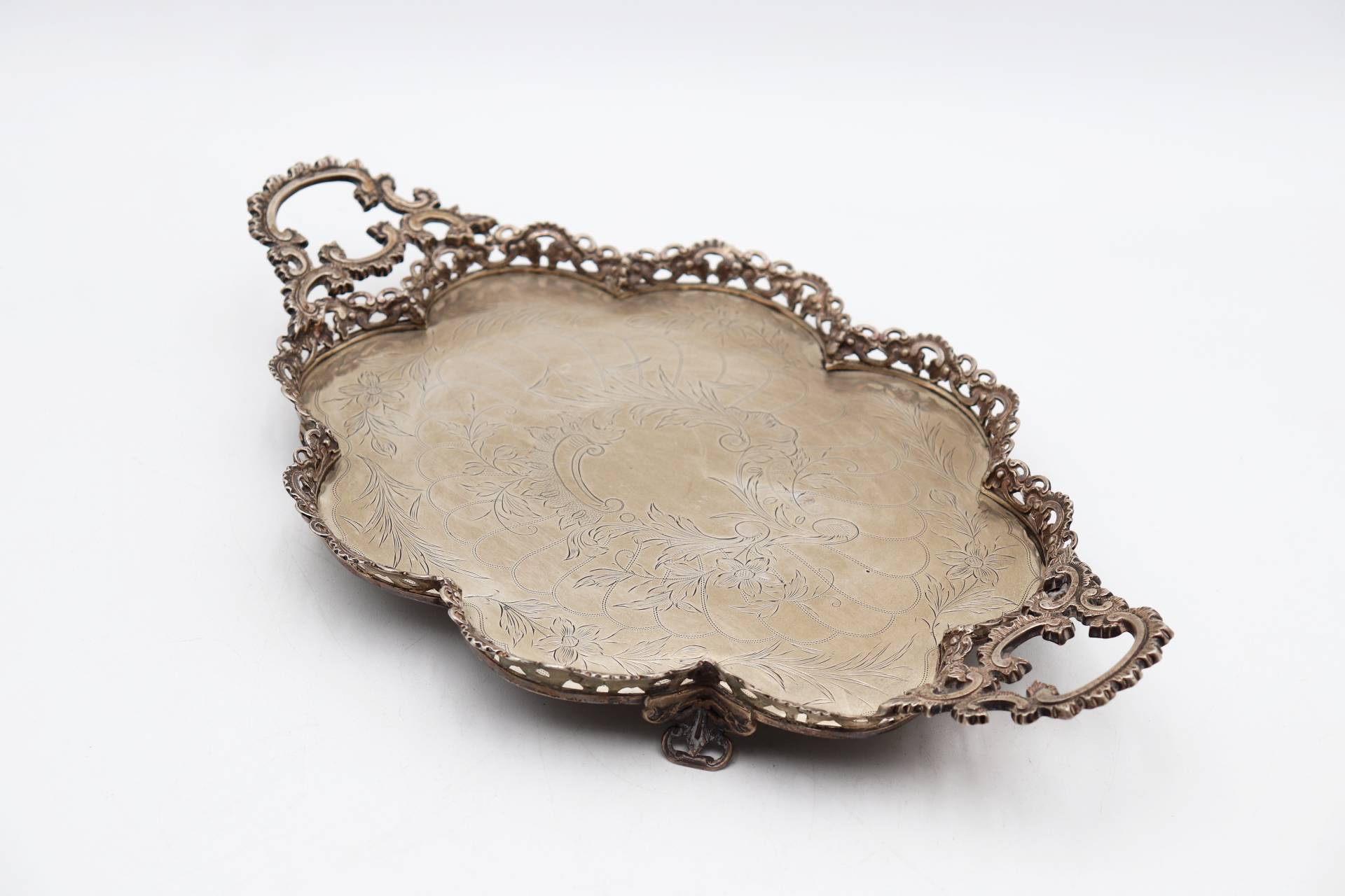 • Descrição: Bandeja de prata lobolada com gradinha, motivos florais gravados, asas recortadas e assente em quatro pés vazados.