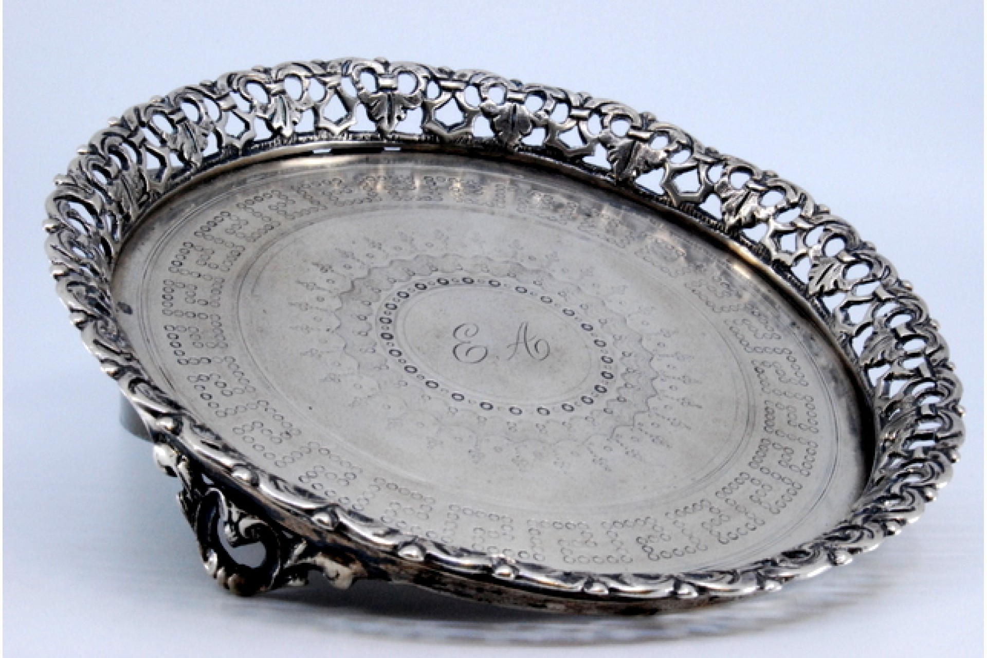 • Descrição: Bandeja/bilheteira de prata com gradinha fundo guilhochado com friso grego envolvendo cartela para monograma e assente sobre três pés.