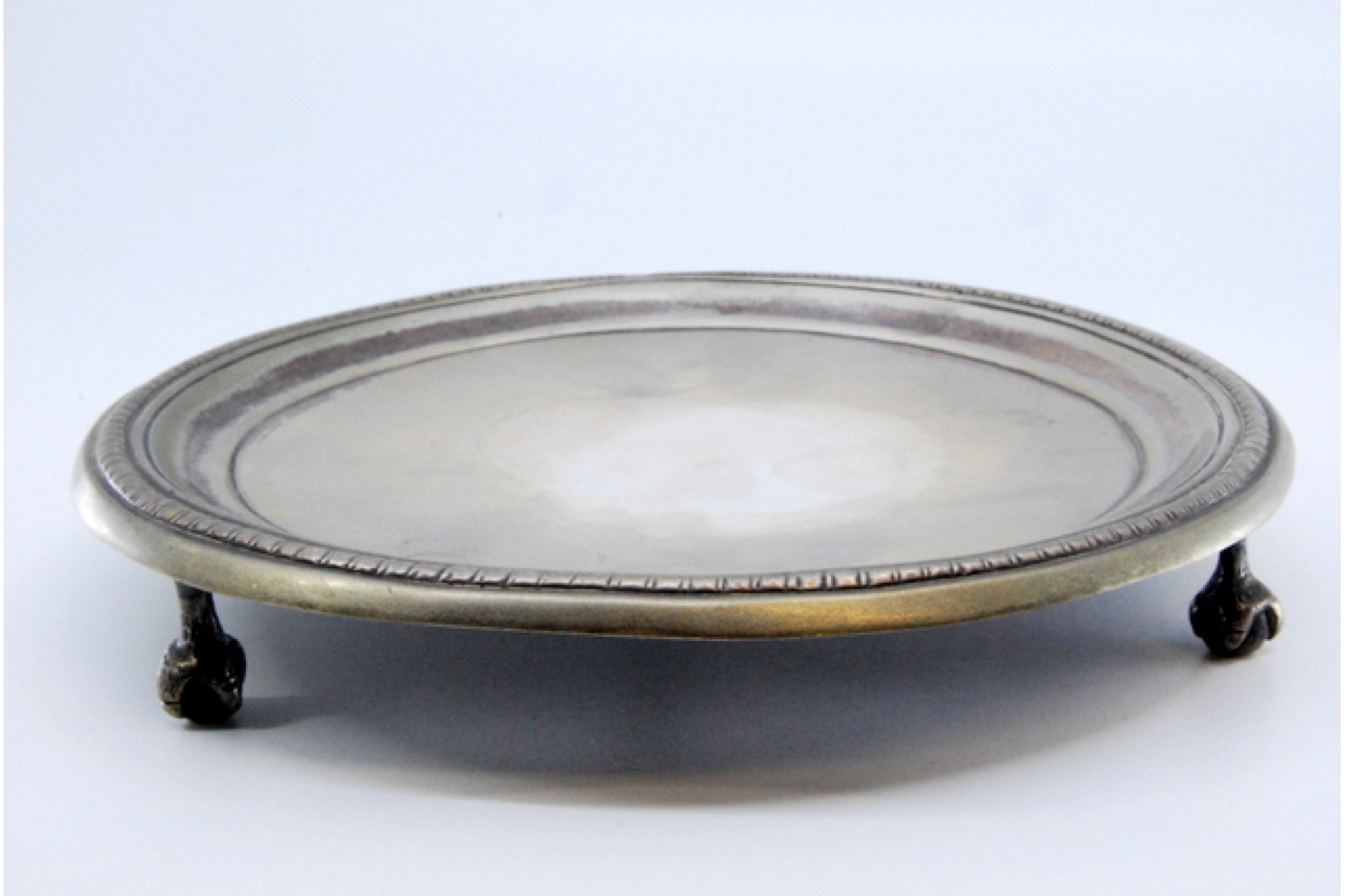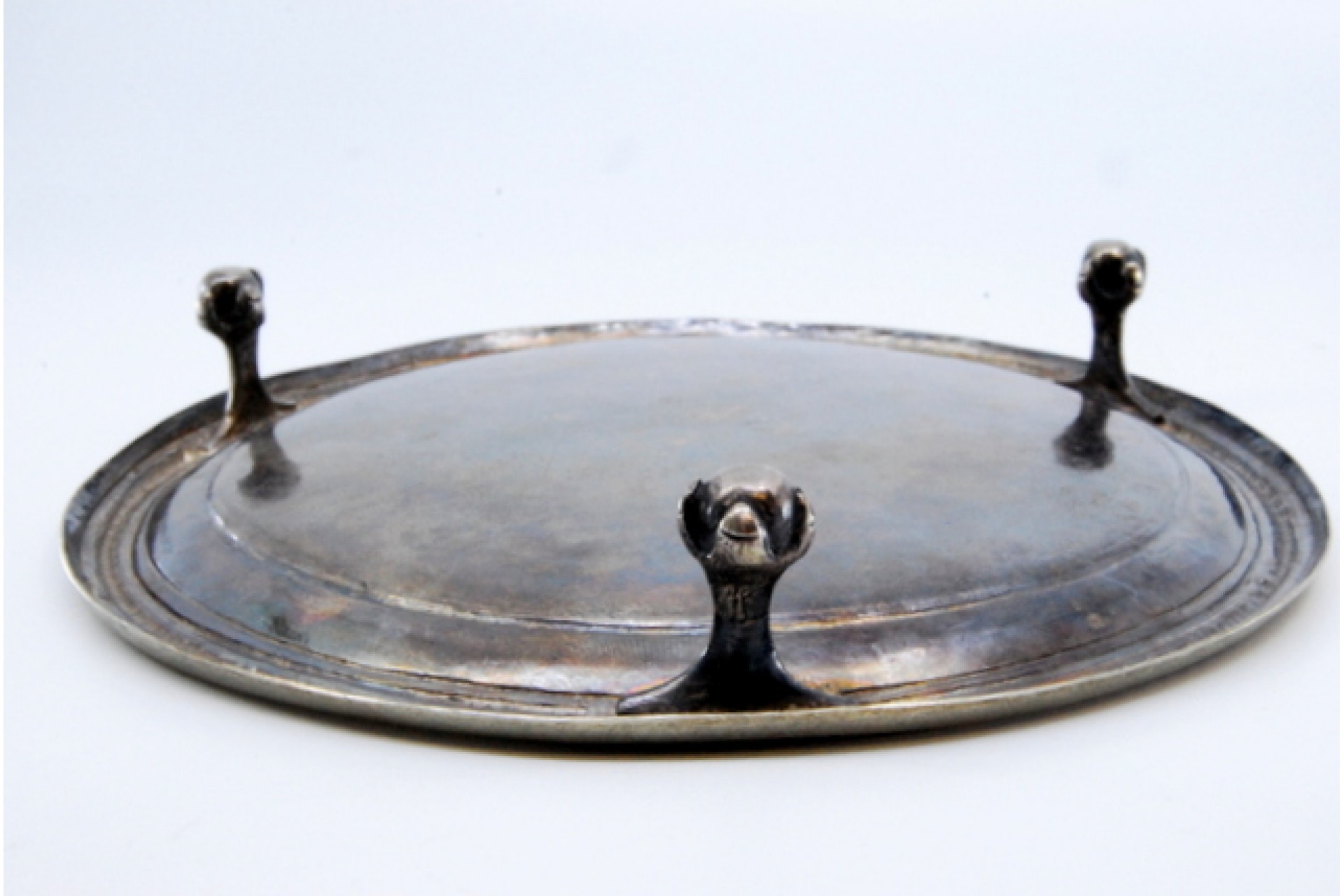 • Descrição: Bandeja/Bilheteira de prata com fundo liso e rebordada com frisos e assente sobre três em forma de garras.