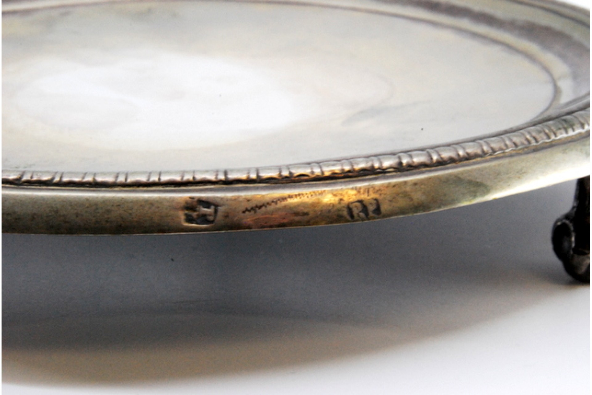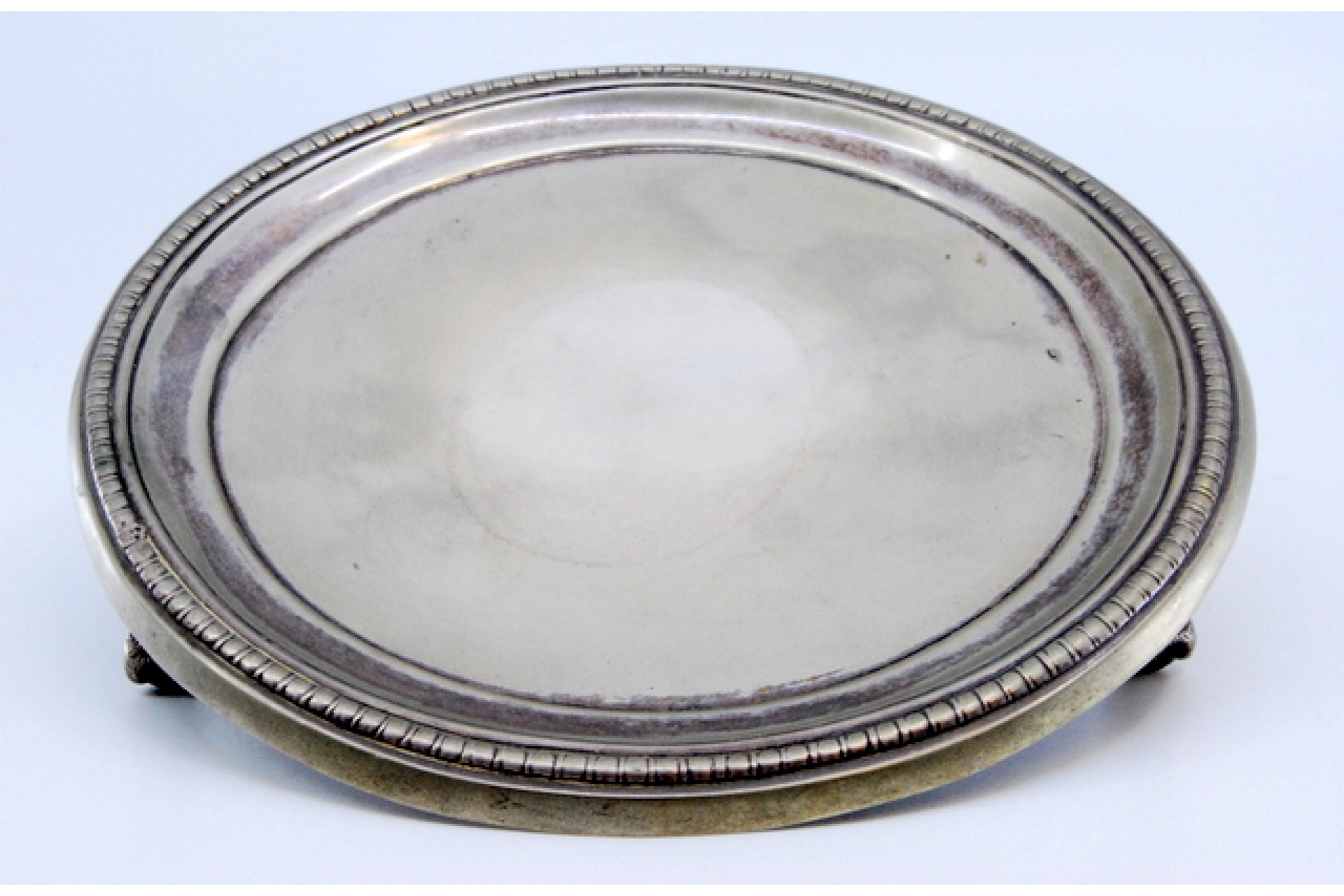 Bandeja/Bilheteira de prata com fundo liso e rebordada com frisos e assente sobre três em forma de garras.