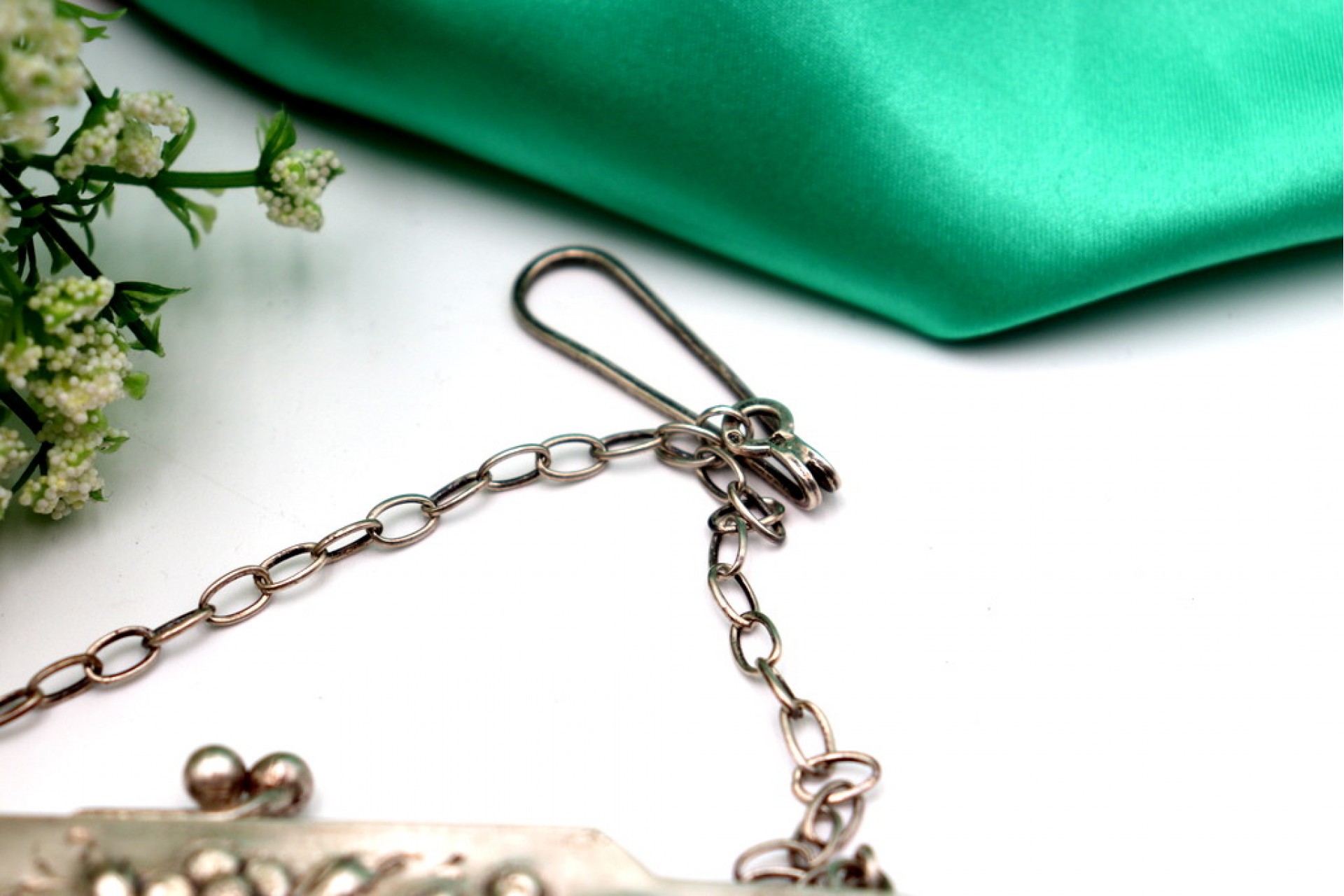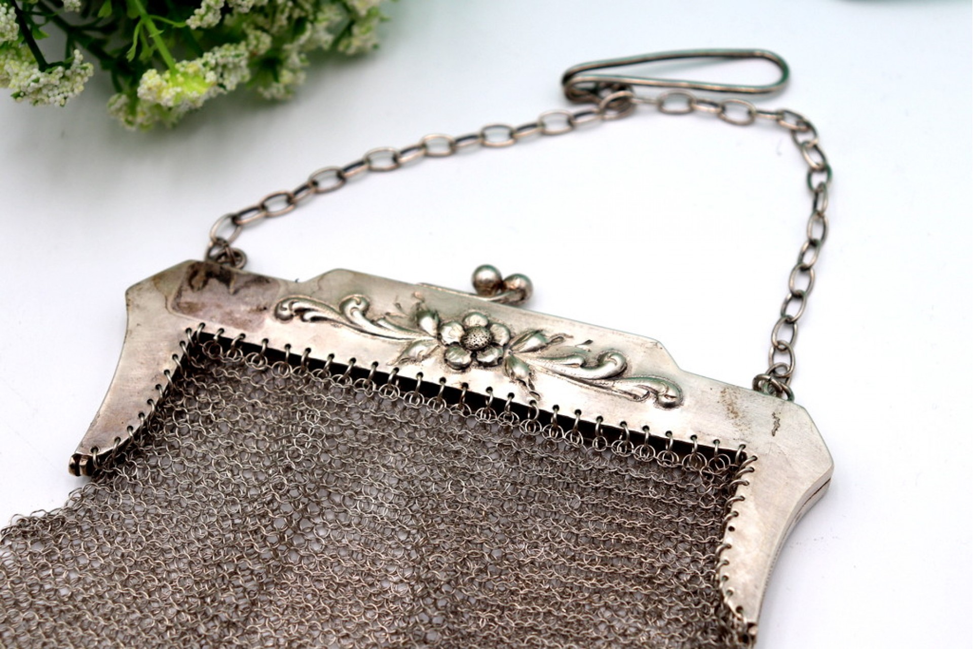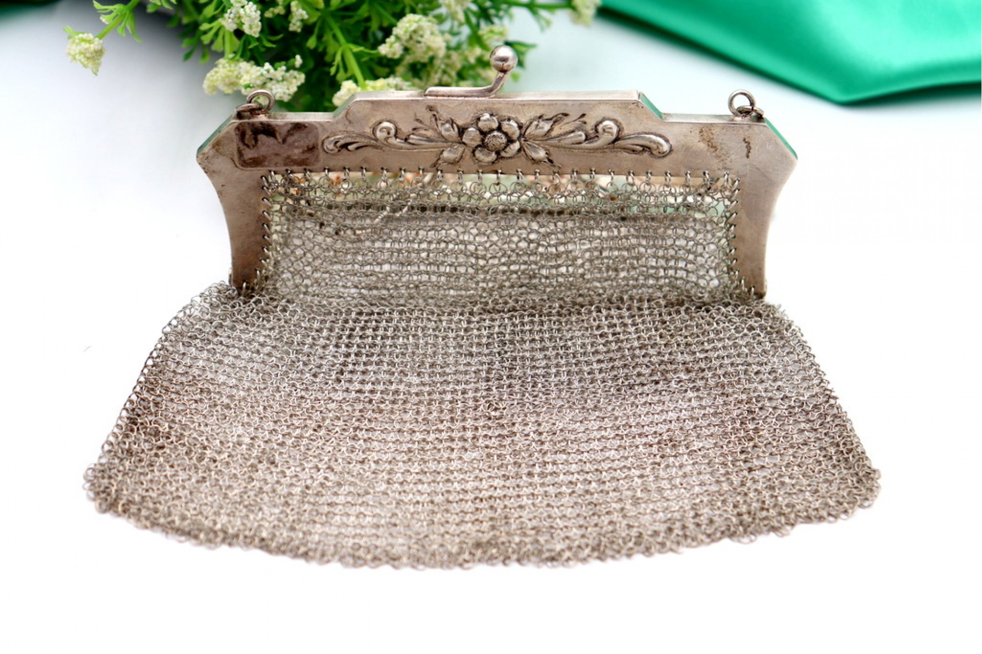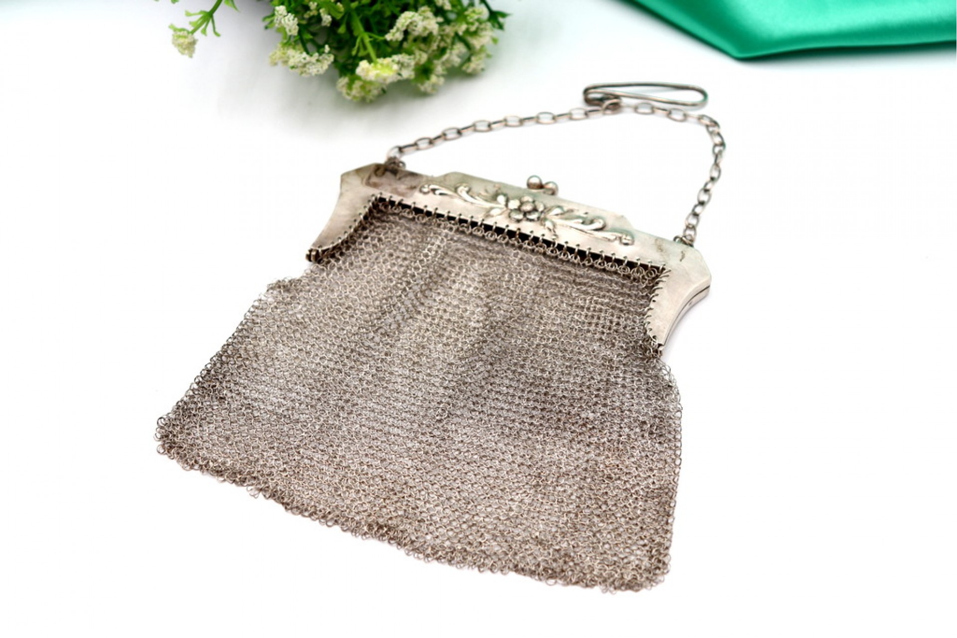 • Descrição: Bolsa em malha de prata com relevos florais no arco e corrente em malha cadeado.