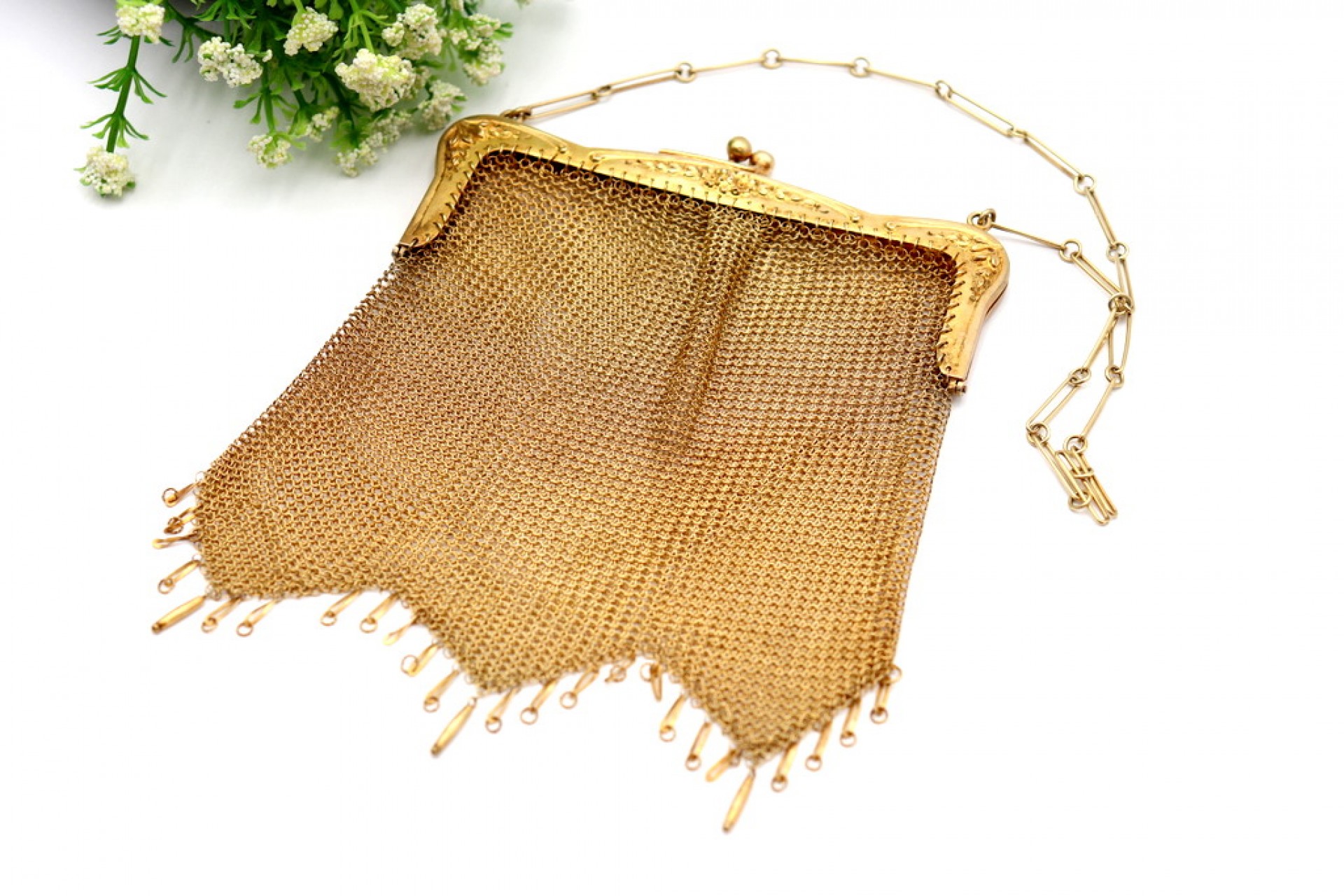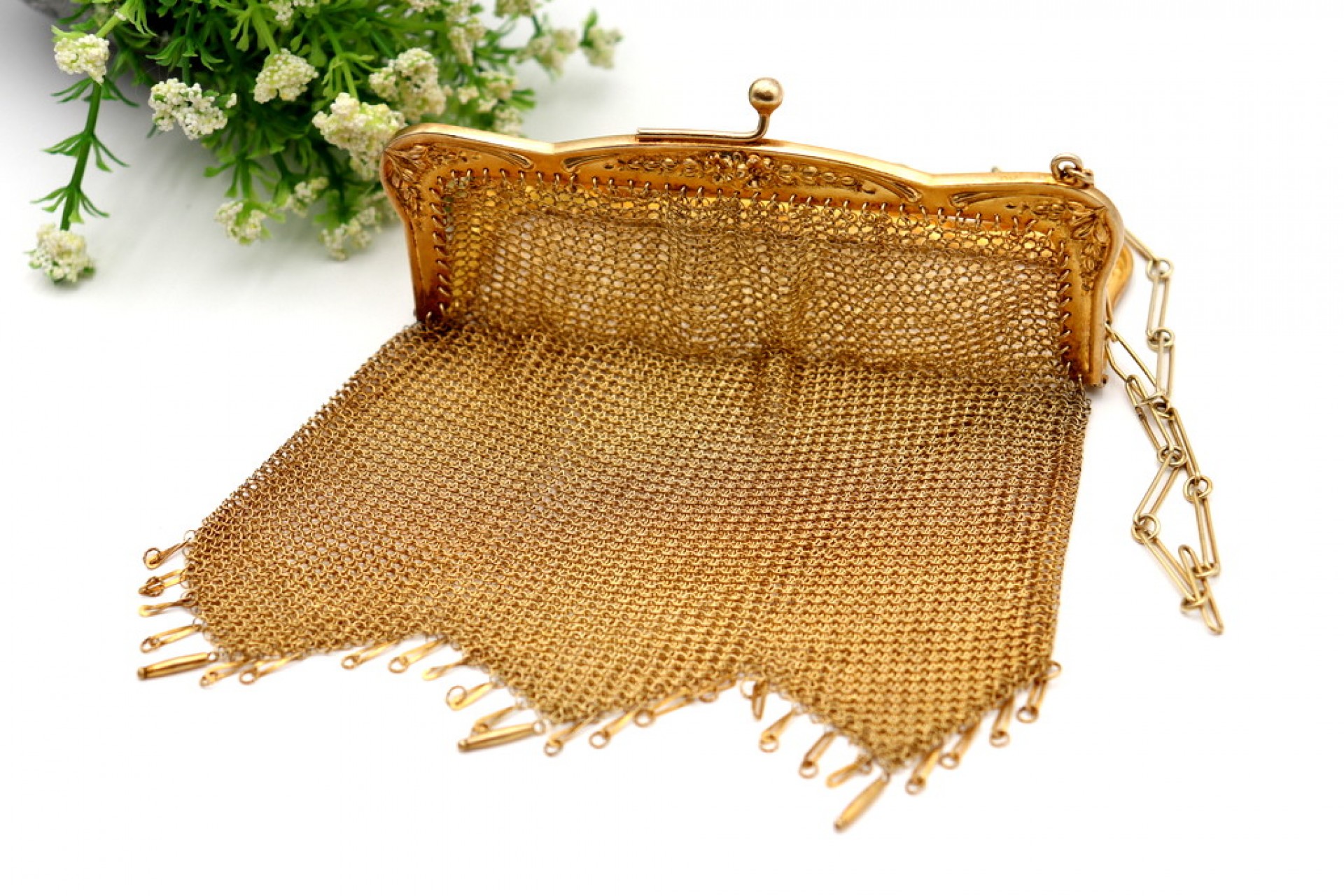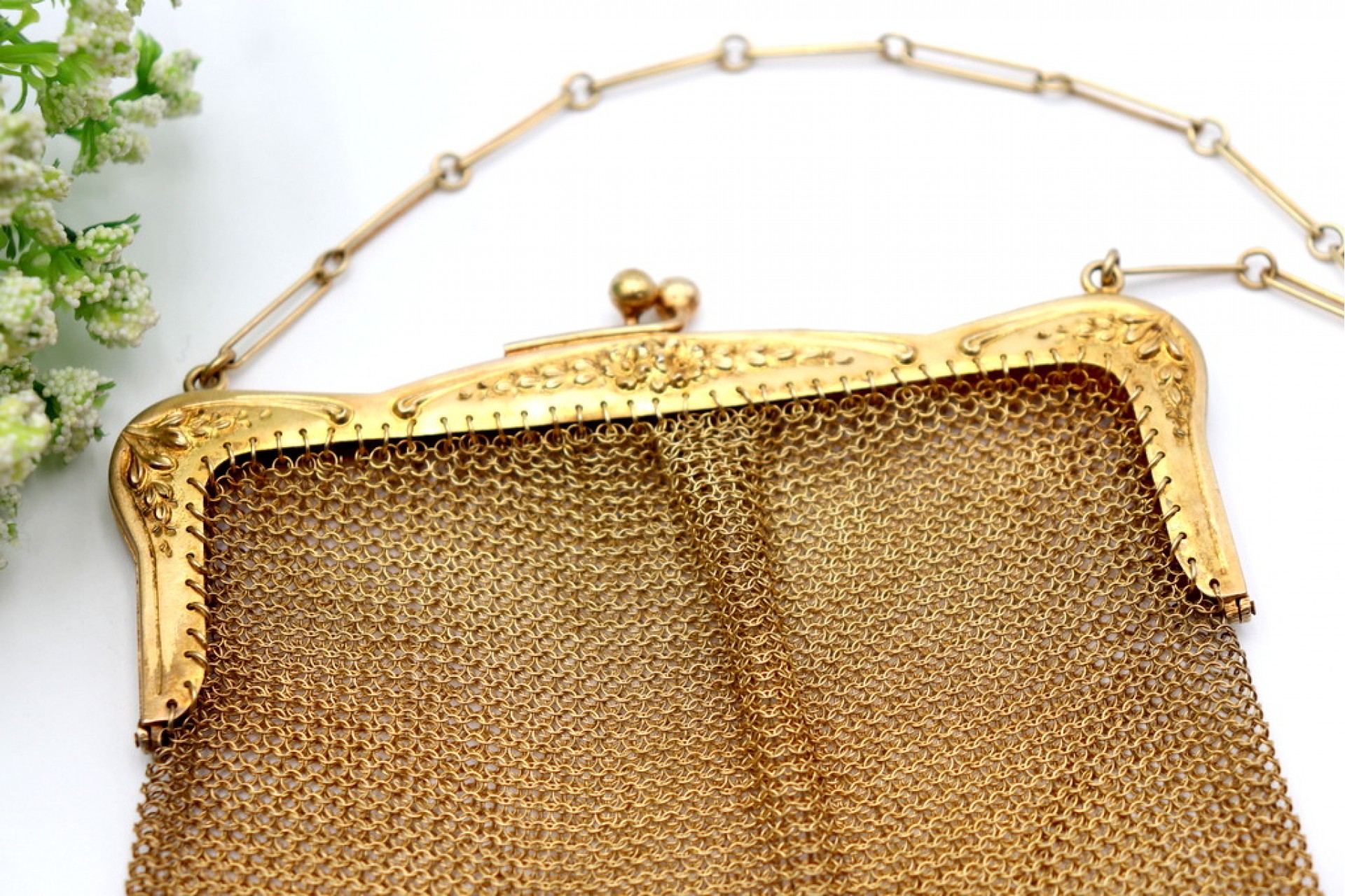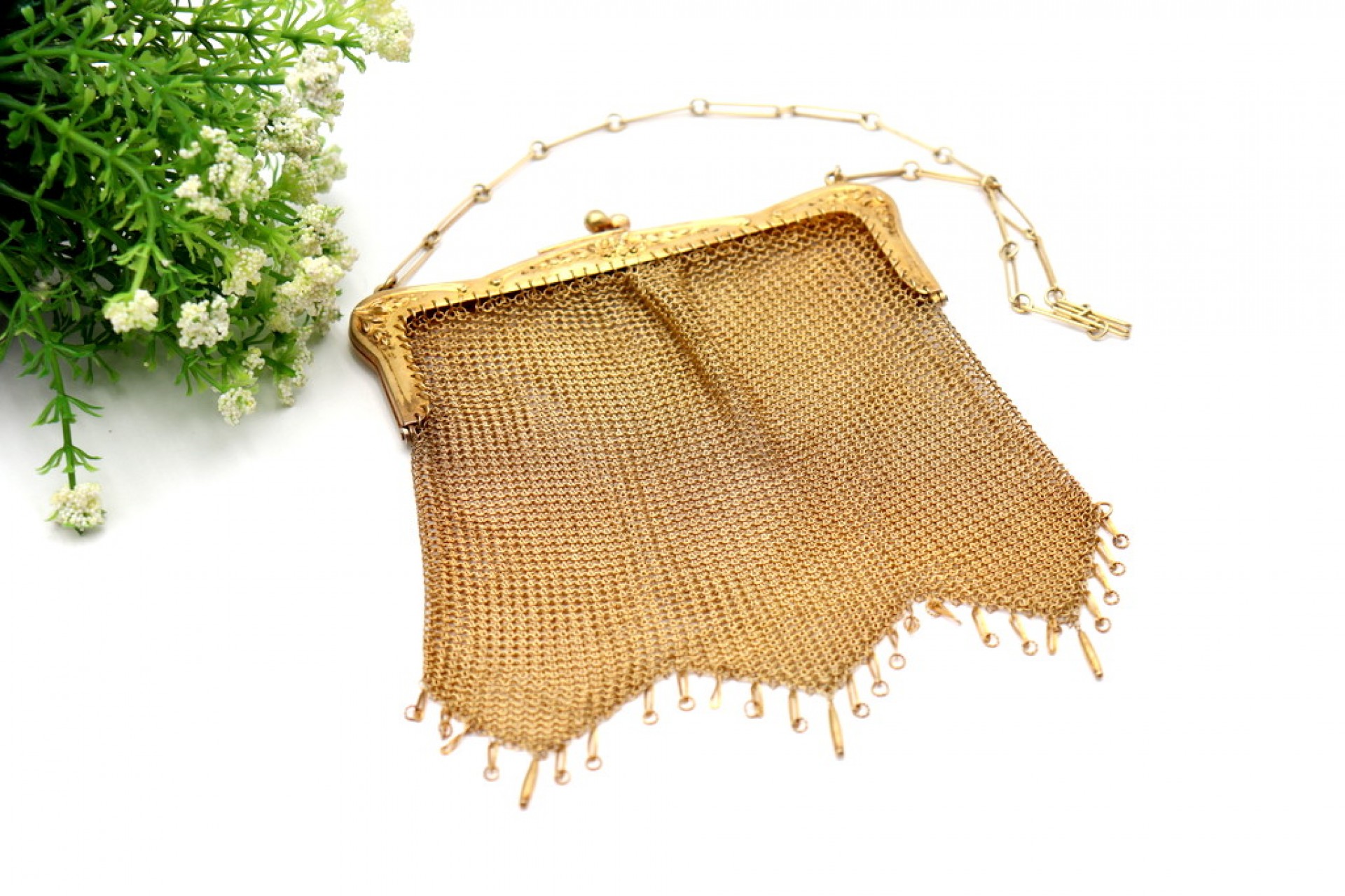 • Descrição: Bolsa em malha de prata dourada com arco relevado e pingentes articulados com corrente em malha cadeado.