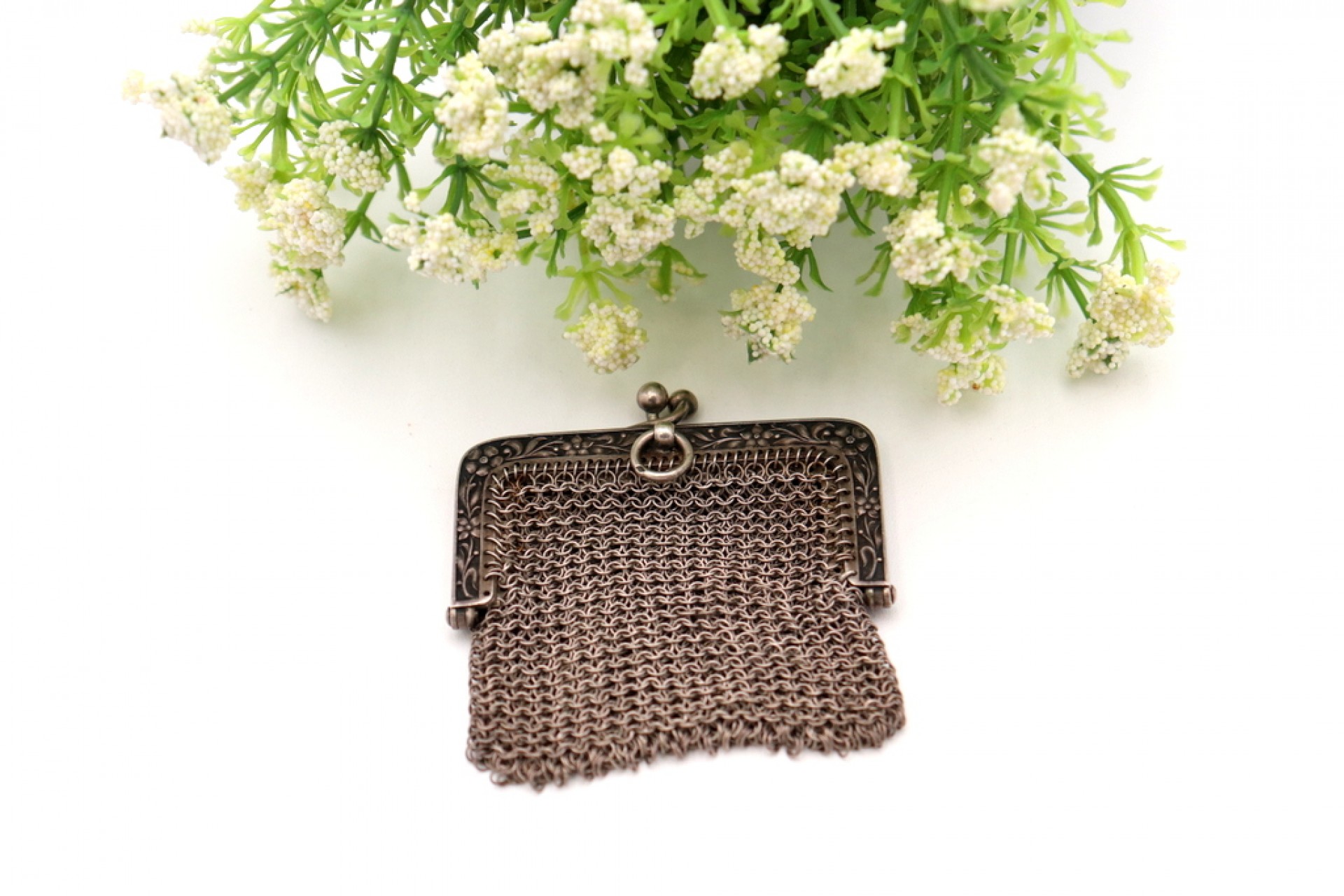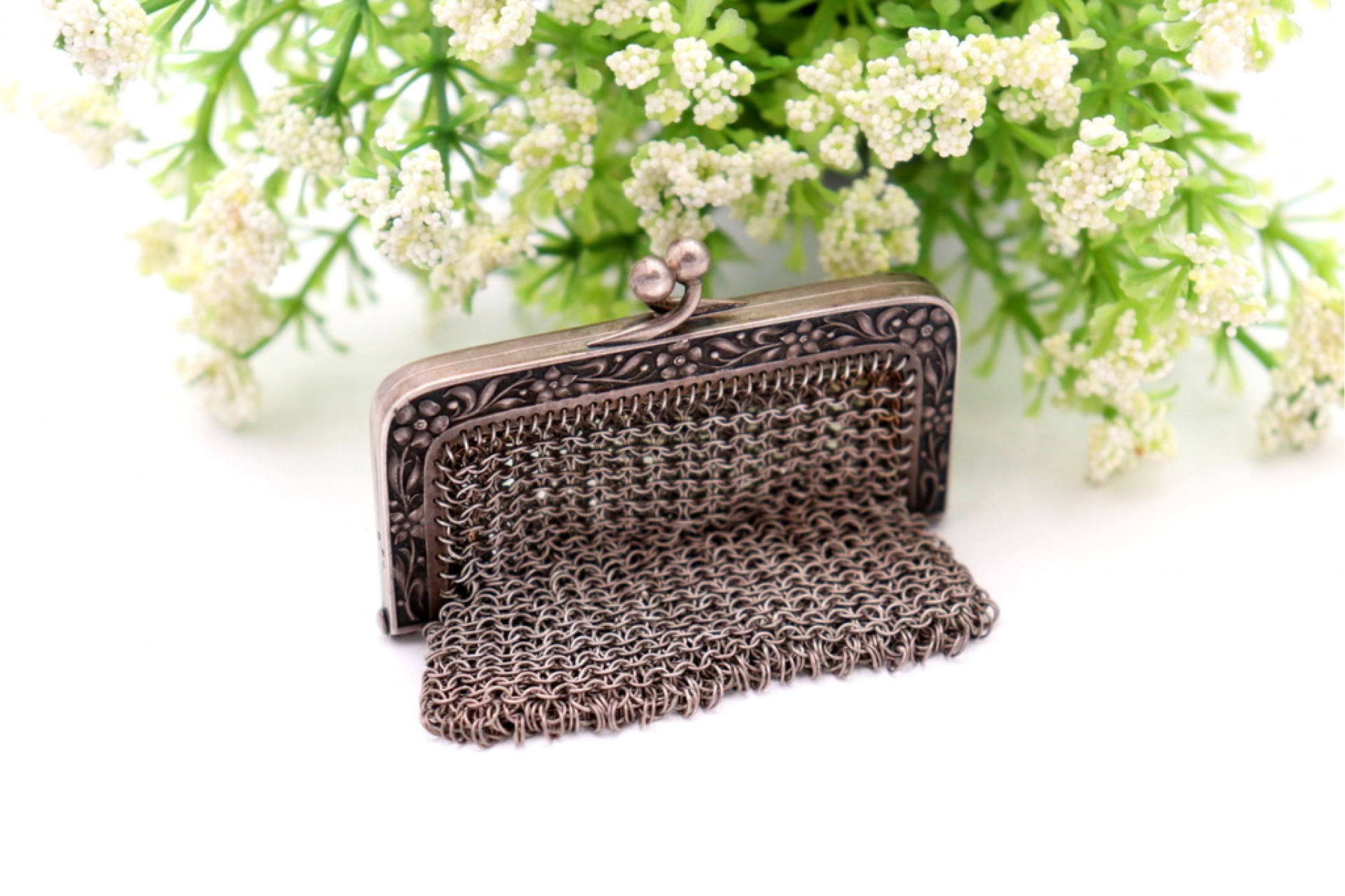 • Descrição: Bolsa porta moedas em prata com relevos, duas divisórias e argola de suspensão.