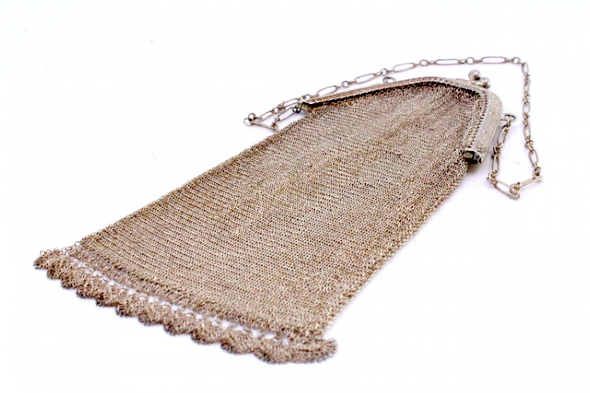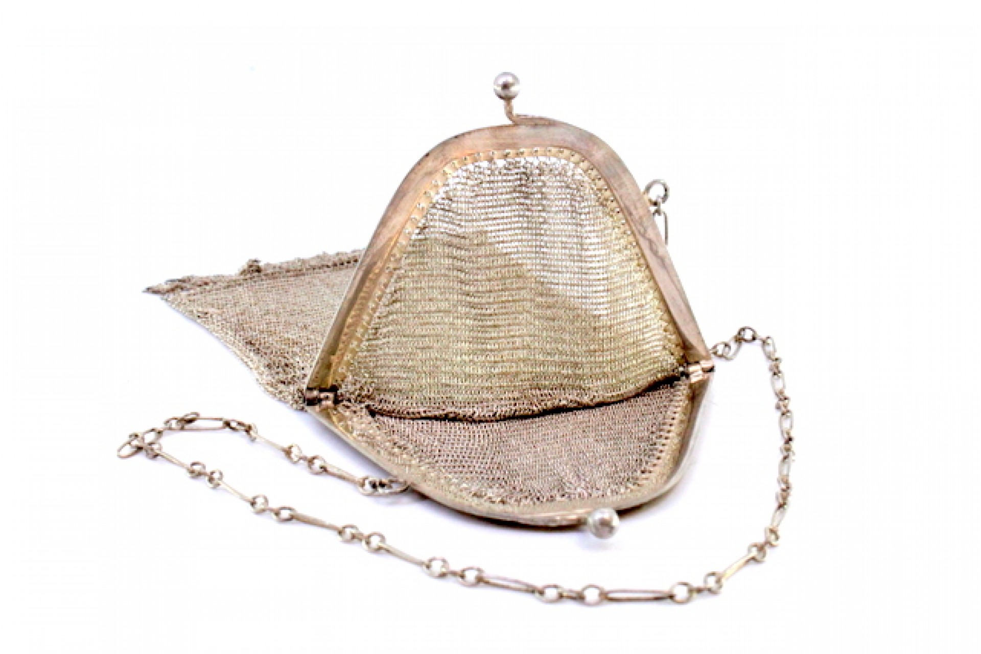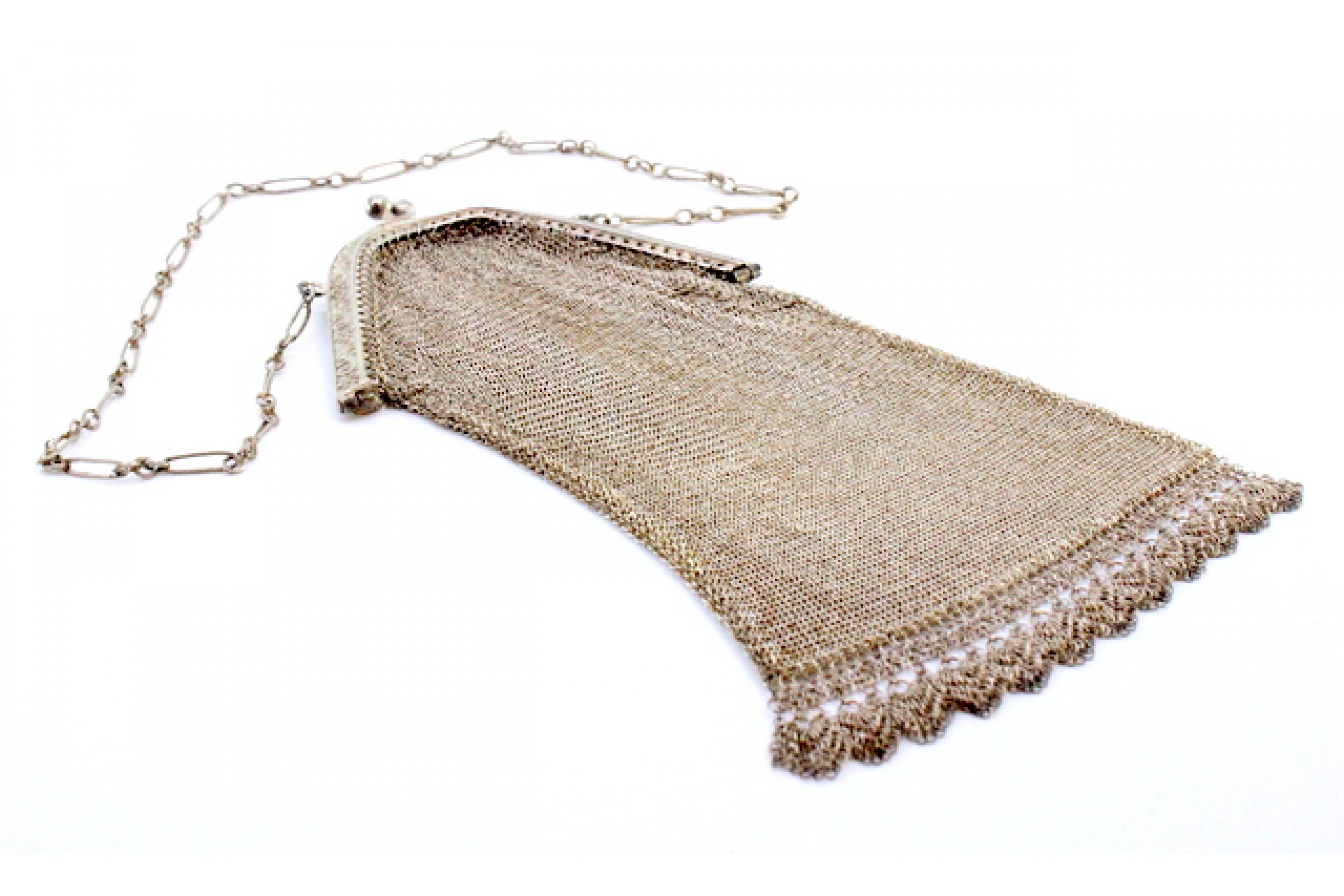 • Descrição: Bolsa de mão em malha dupla de prata  com arco relevado, franjas suspensas e corrente em malha 1+1.