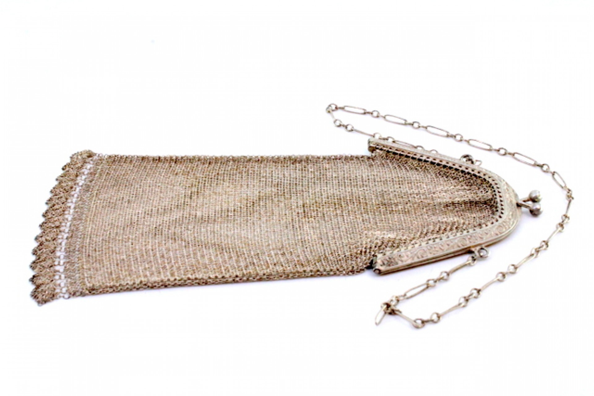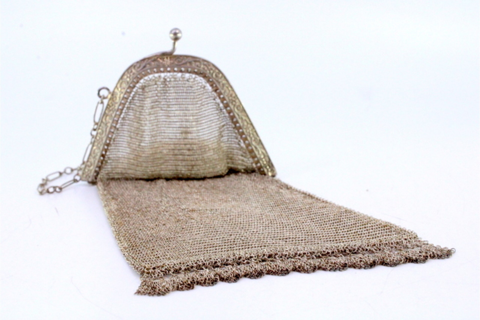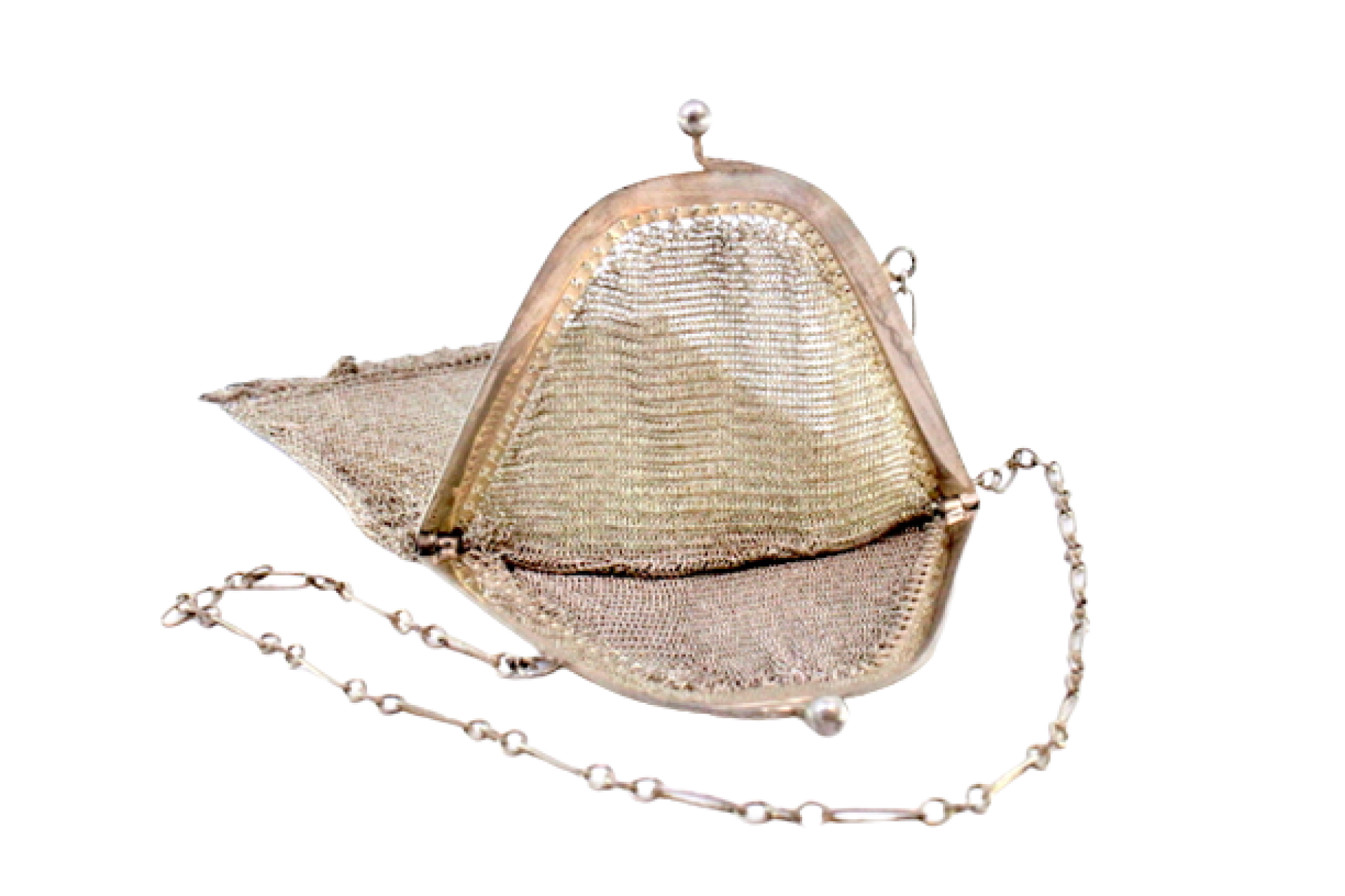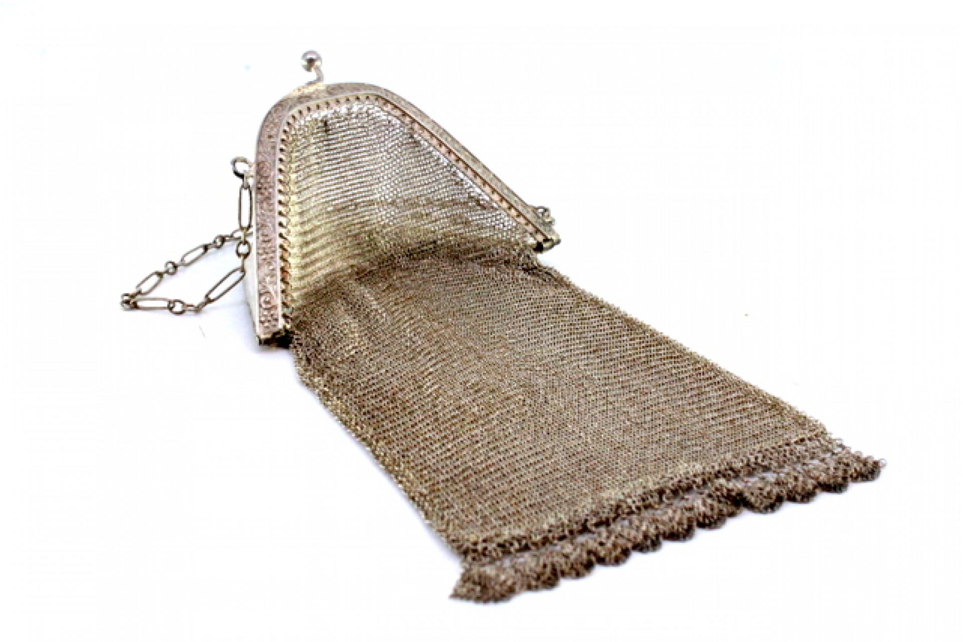 • Descrição: Bolsa de mão em malha dupla de prata  com arco relevado, franjas suspensas e corrente em malha 1+1.
