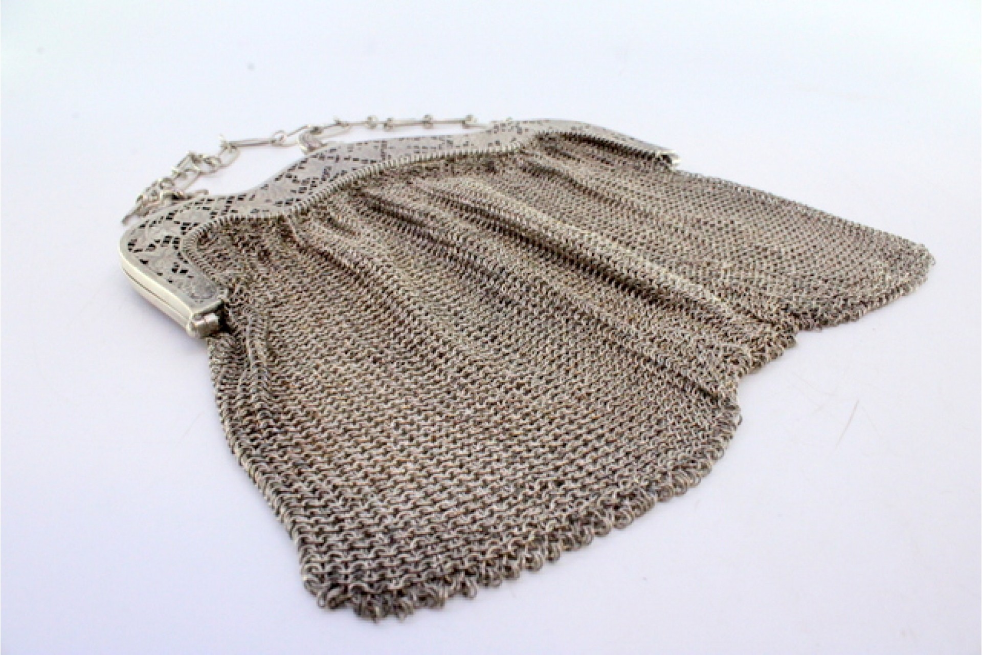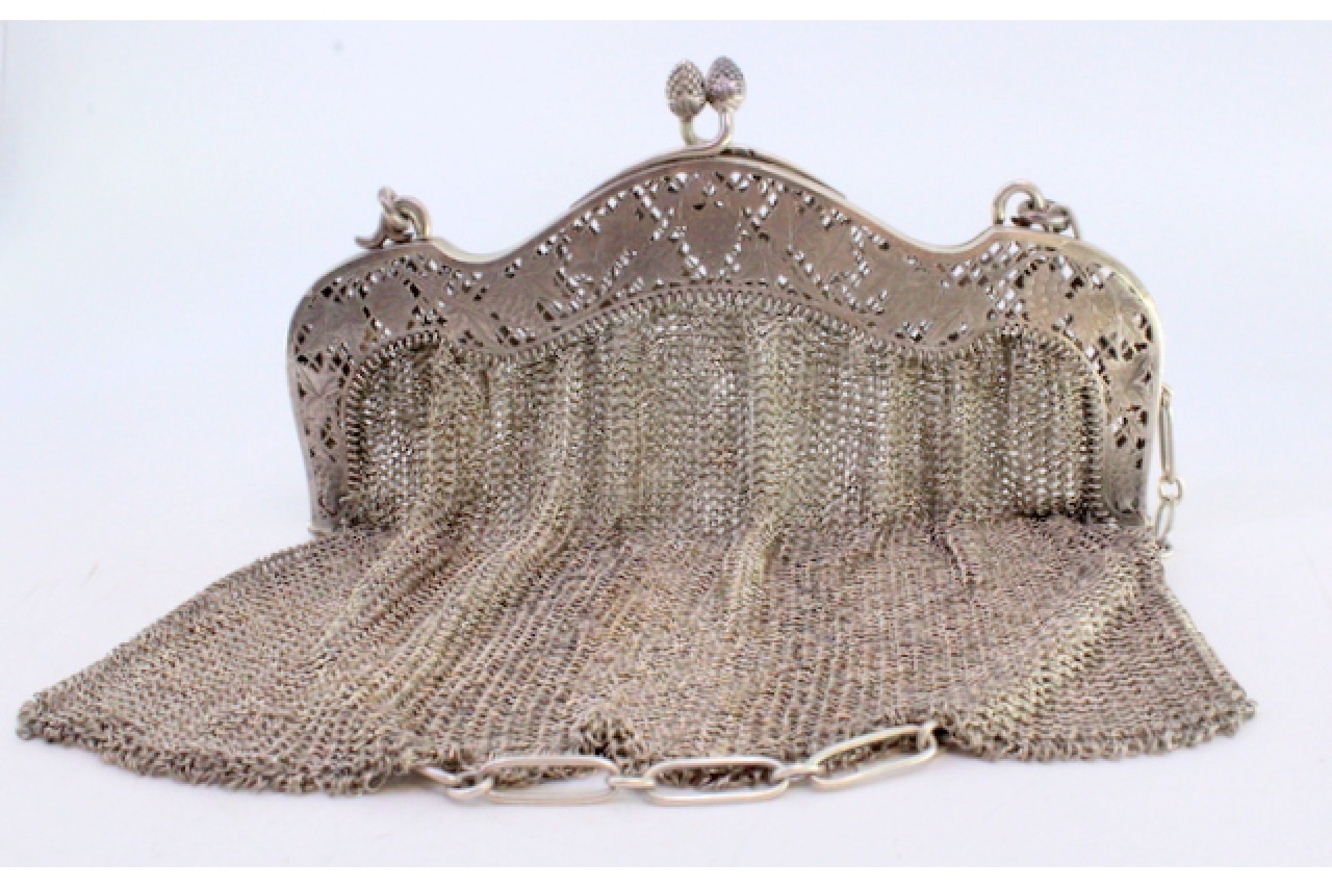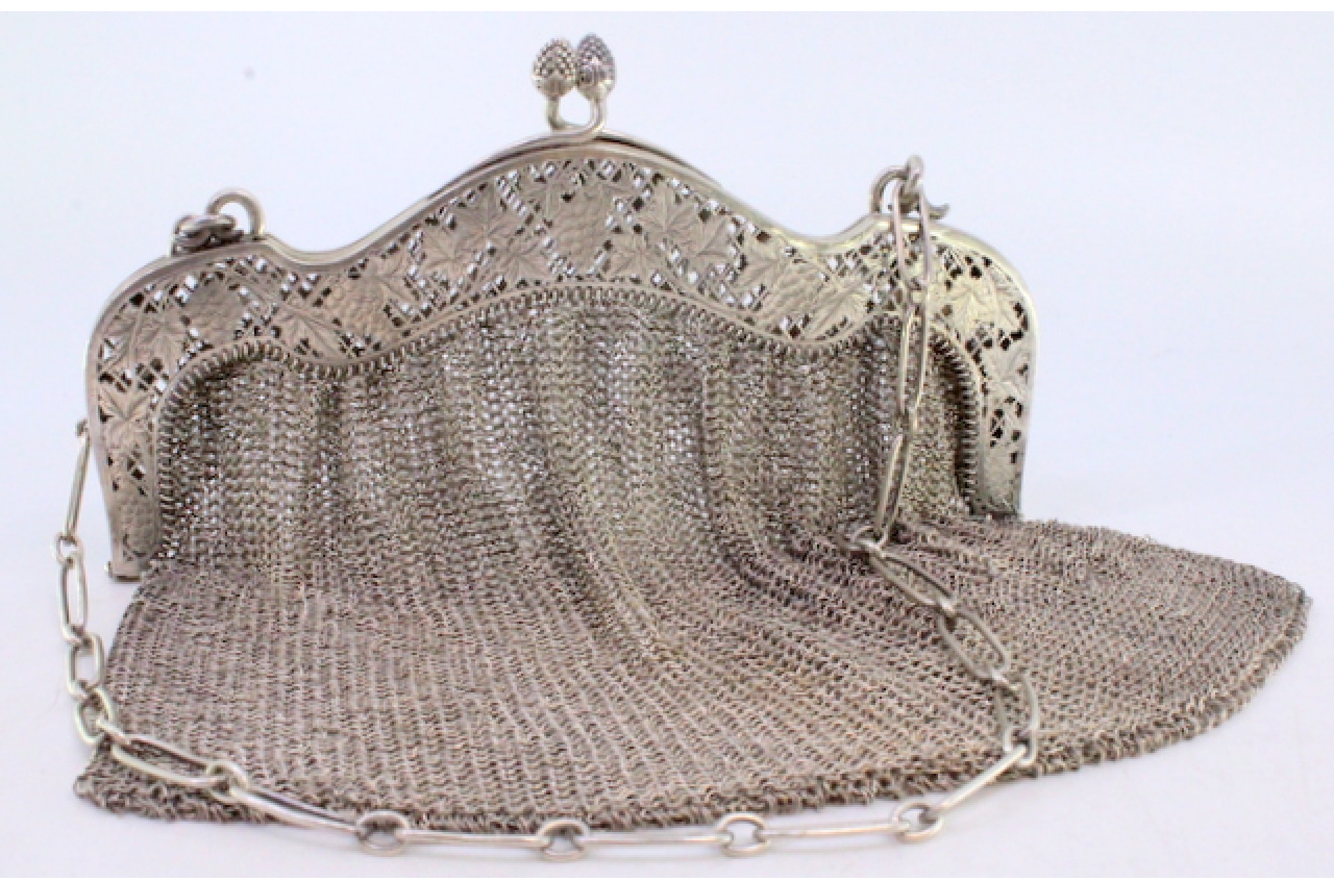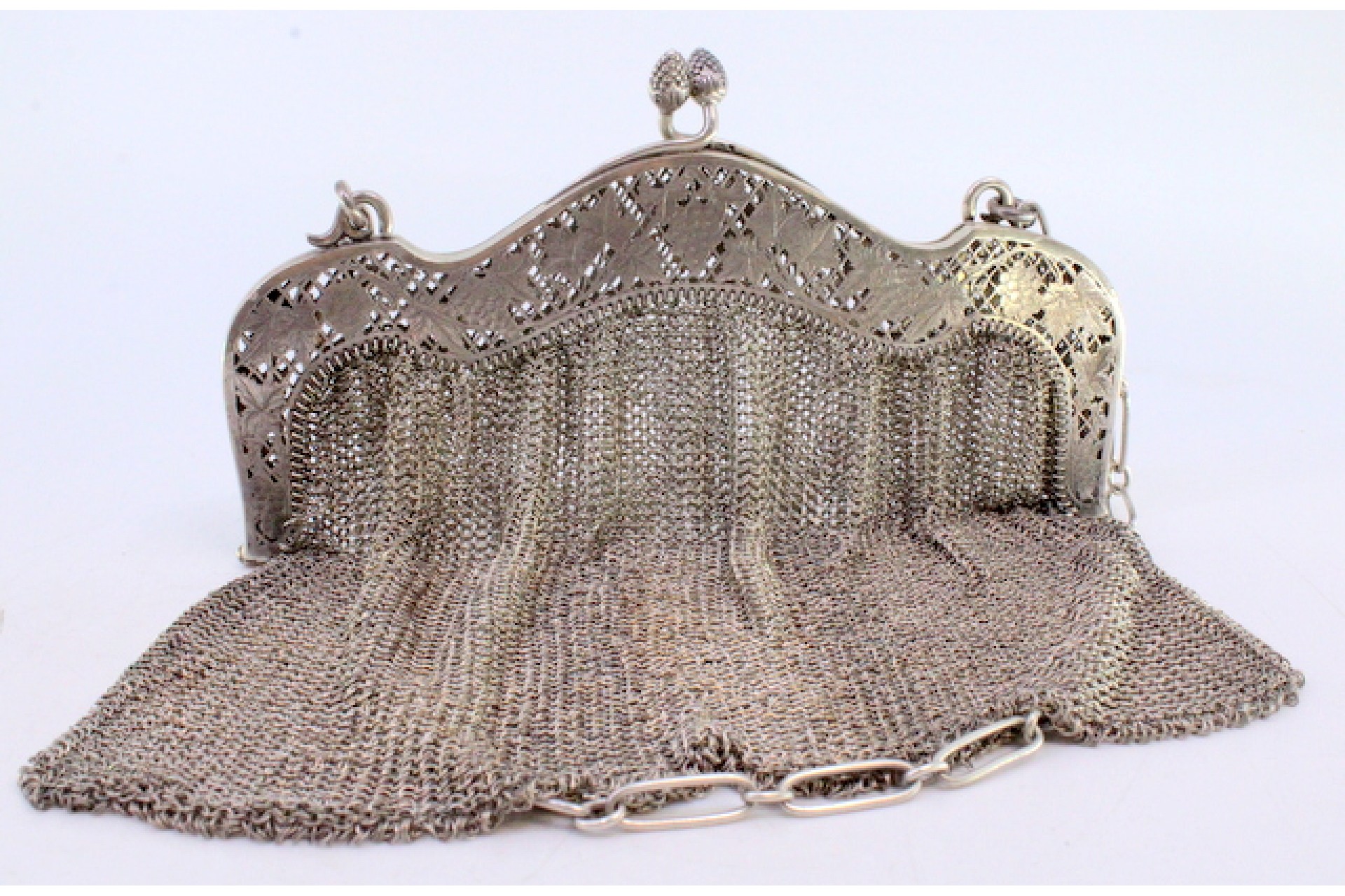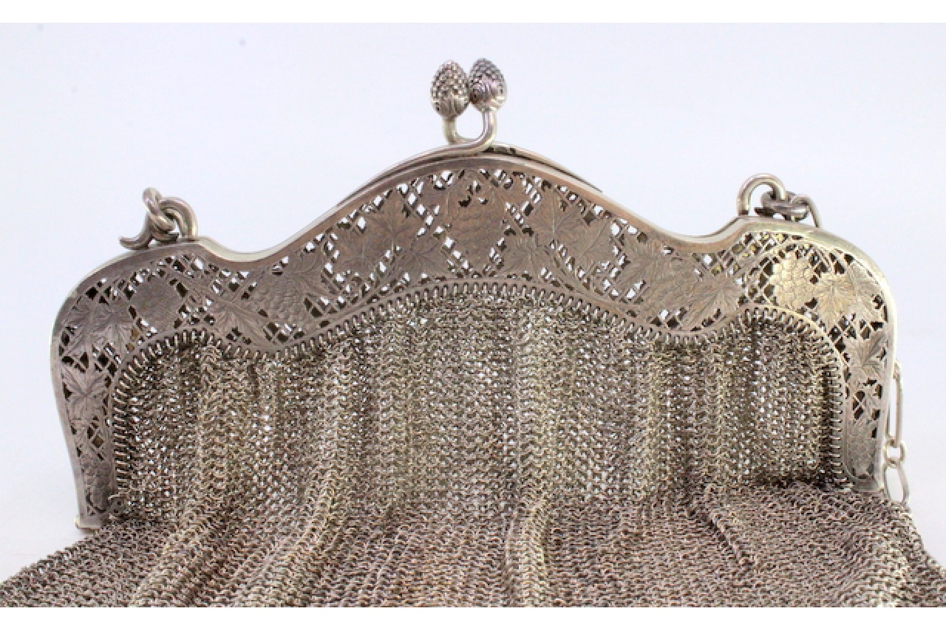 • Descrição: Bolsa de mão em malha dupla de prata com arco recortado com parras e uvas, fecho decorado com bolotas e corrente em malha cadeado.