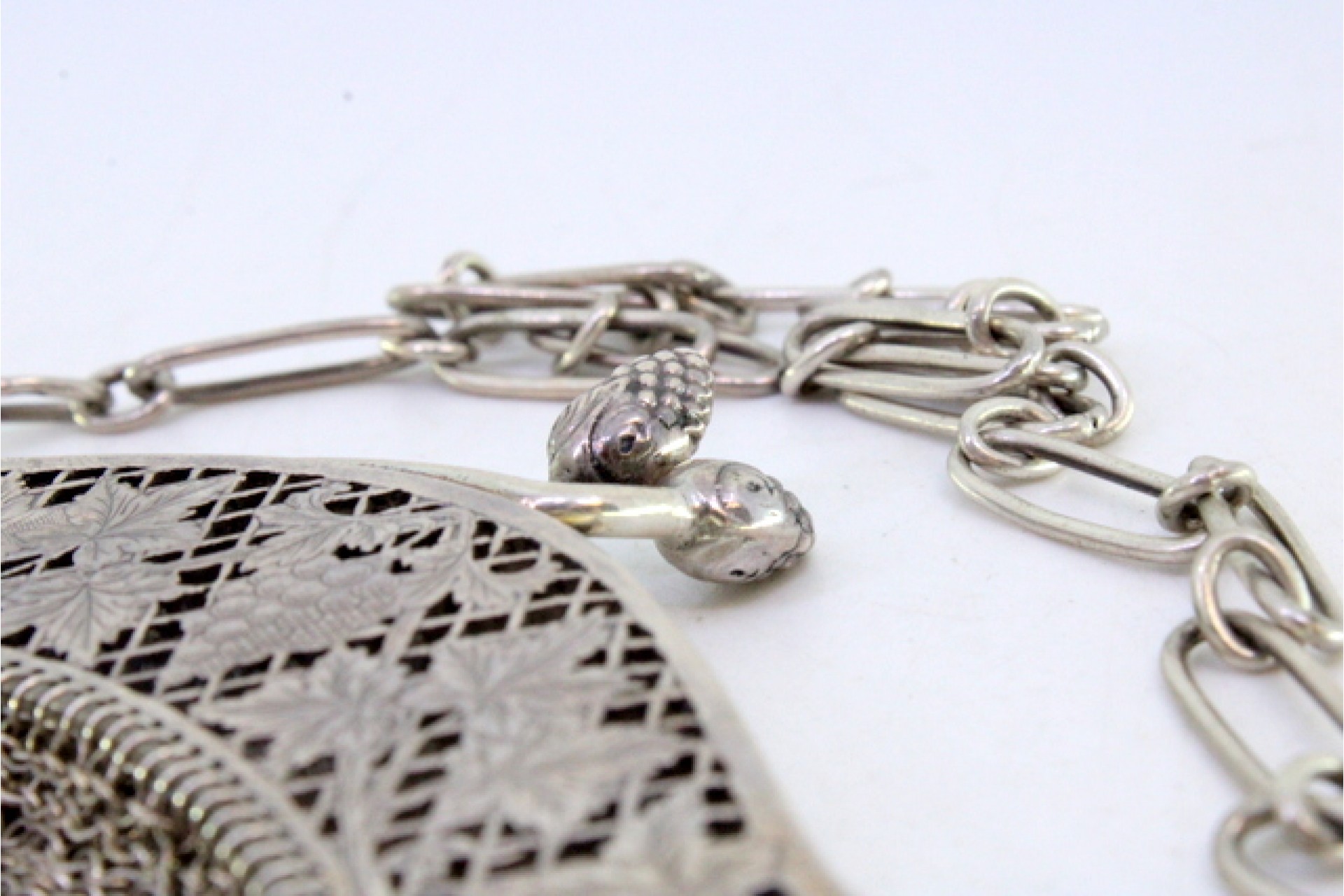 Bolsa de mão em malha dupla de prata com arco recortado com parras e uvas, fecho decorado com bolotas e corrente em malha cadeado.
