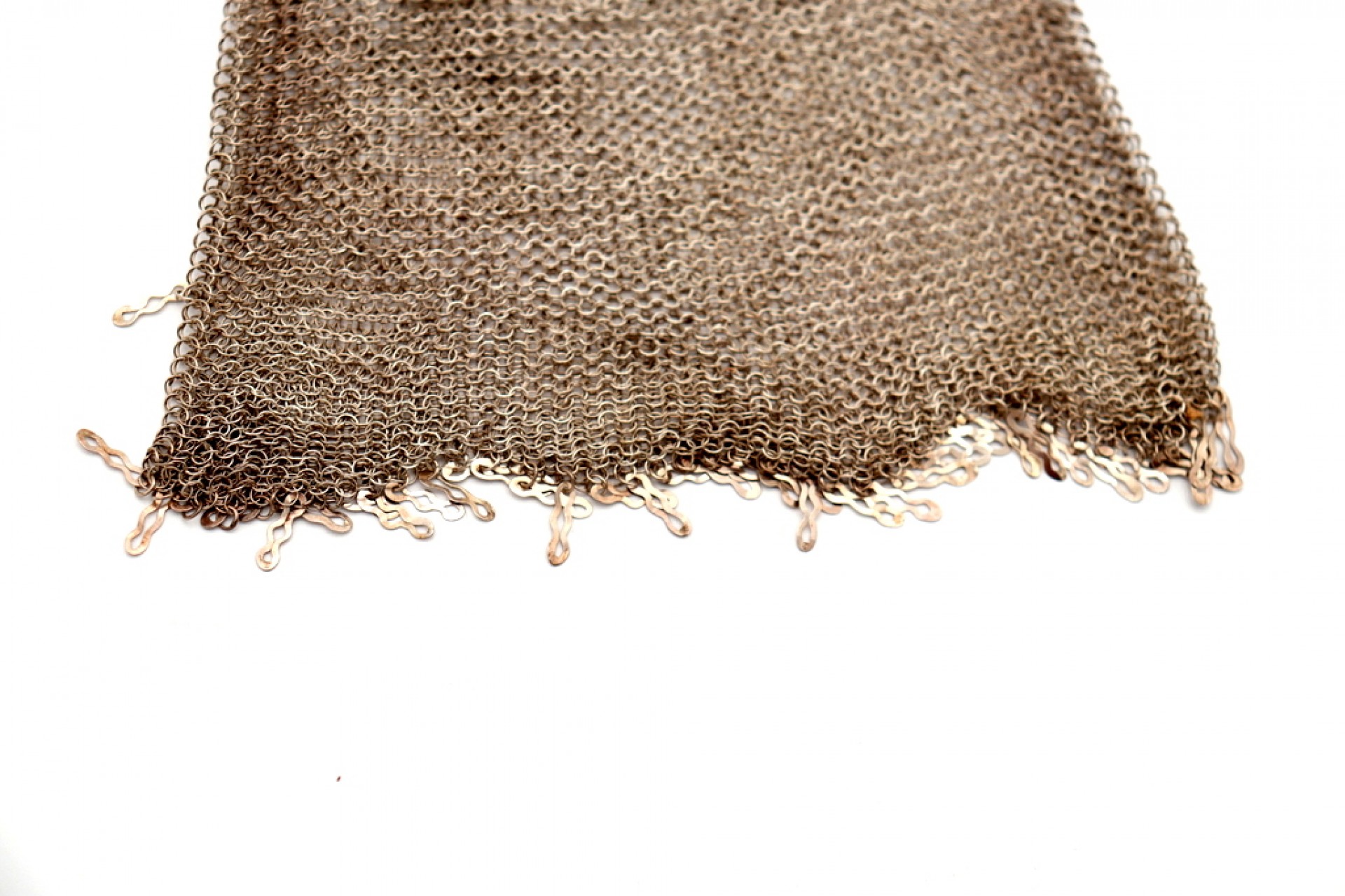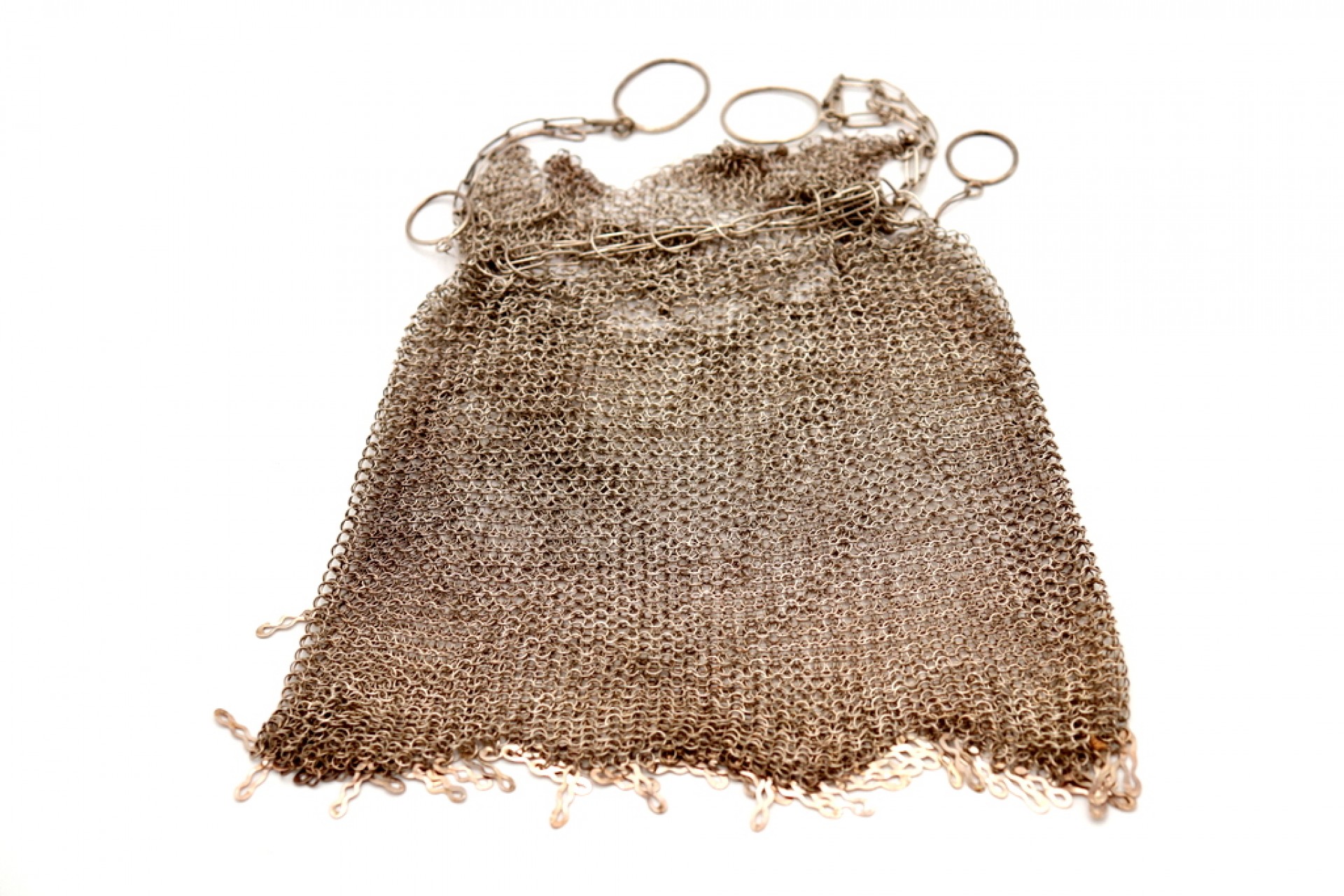 • Descrição: Bolsa de mão em malha de prata fantasiada com duas argolas e franjas suspensas.